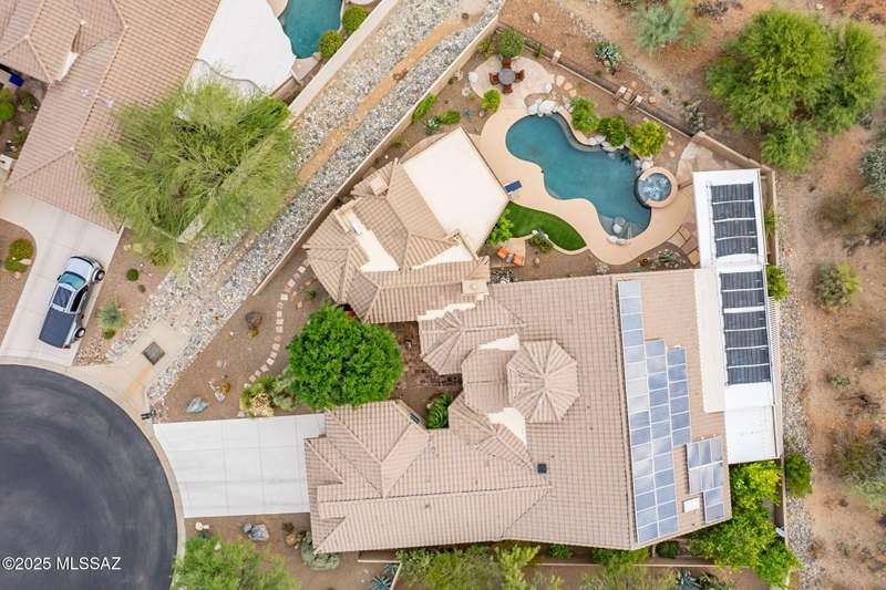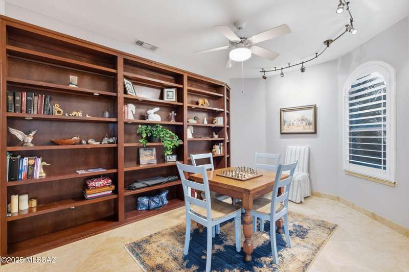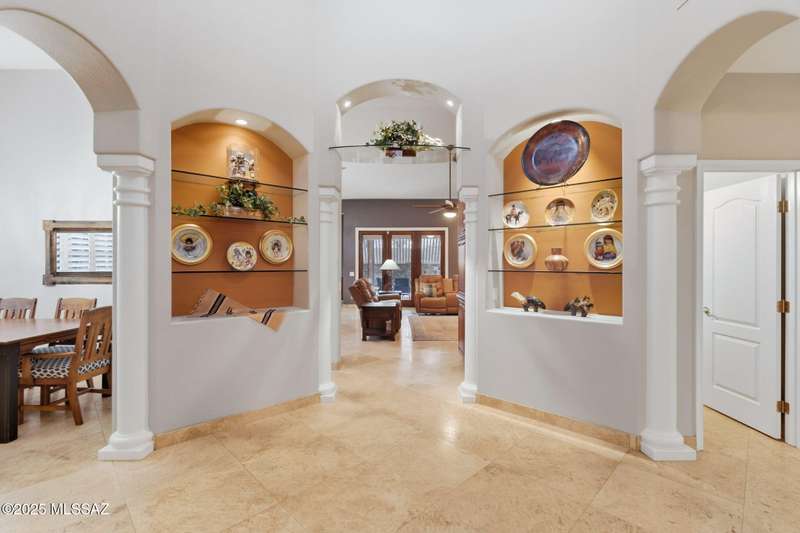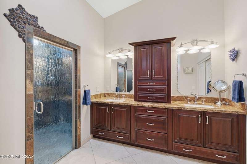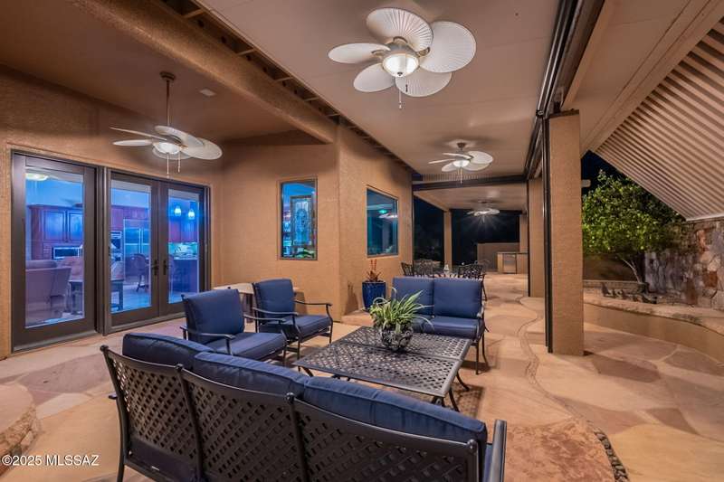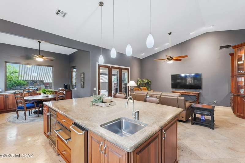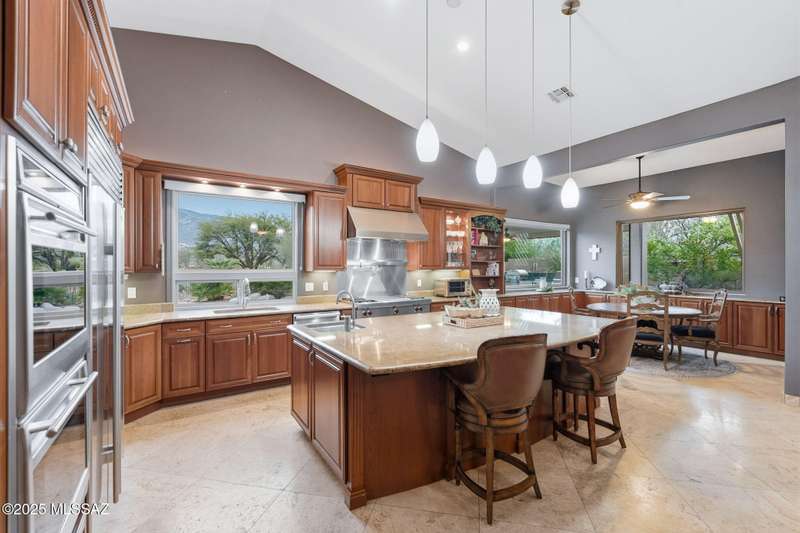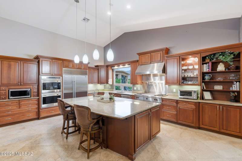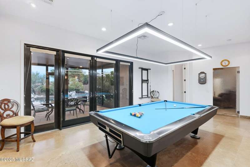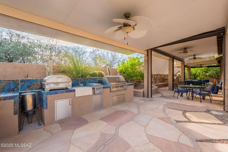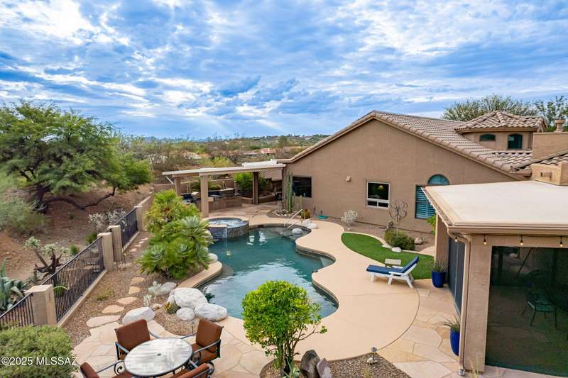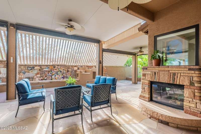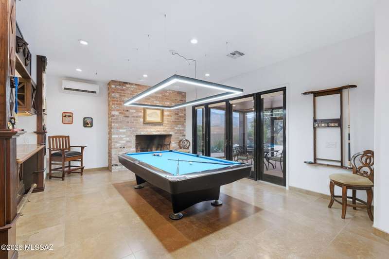 Fabulous retreat in SaddleBrooke One - a unique entertainer's paradise! With 3,578 SF (per prior appraisal), this home offers 2 bedrooms plus an office, 2 full and 2 half baths. The chef's kitchen impresses with Sub-Zero fridge, Wolf cooktop and wall ovens, pot filler, warming drawer, ice maker, wine fridge, and large granite island with prep sink. Entertaining spaces abound--wet bar off the kitchen and family room, recreation room with fireplace, pool table, bar, and Arizona room access. The backyard is spectacular with mountain views, heated salt pool and spa, outdoor kitchen, fireplace, and citrus trees. The luxurious primary suite features its own fireplace, reading area, and spa-like steam shower. Living room & library greet you at front of house. Owned solar for home and pool!