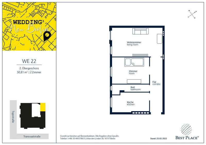 The four-story old building corner house “WEDDING³” from 1911 is a multi-family home in the heart of the aspiring scene district Wedding. Bright facades, a ground floor of contrasting colour, bay window, balconies as well as the triangular pediment on top floor give the building a special charm. The u-shaped building encloses a well-maintained inner courtyard, while bright courtyard facades promote a friendly atmosphere The total of 36 residential units of the “WEDDING³” are fully let and have 1 to 5 rooms as well as 3 commercial units on ground floor. The apartments are perfect for singles, couples as well as families. They offer generous living spaces of approx. 38,44 m² to 129,00 m² as well as old-building-typical floor plans and room heights.