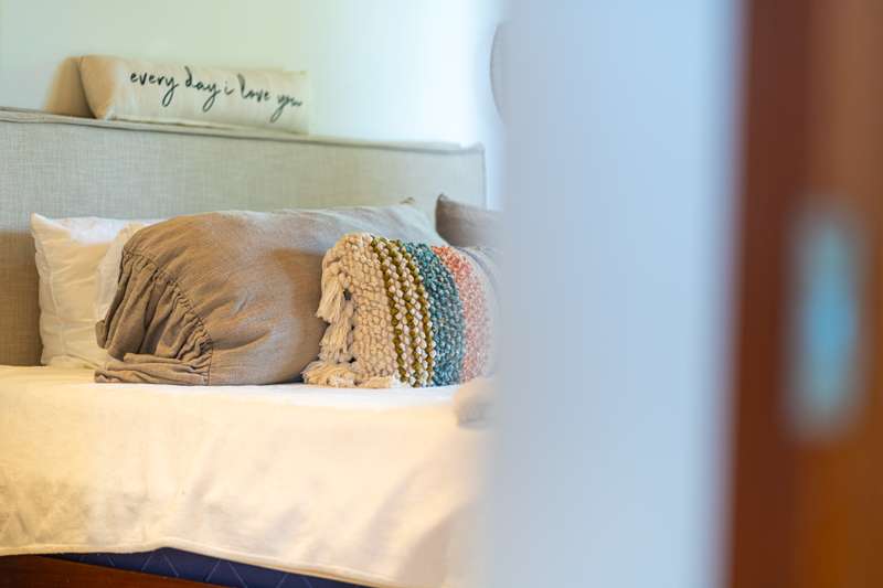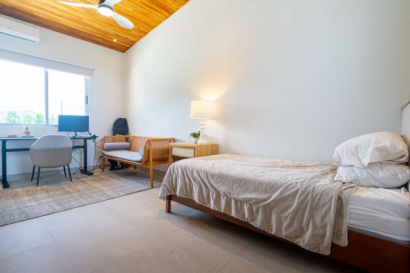 Upstairs, two guest bedrooms open to sweeping views of the surrounding mountains through generous windows that frame the landscape like art. Each room is equipped with its own air conditioning unit, ensuring comfort for family or guests alike.