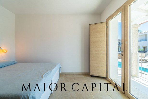 The first double bedroom, located on the ground floor, features a glass door overlooking the pool — creating an immediate connection with the outdoors and a feeling of absolute comfort.