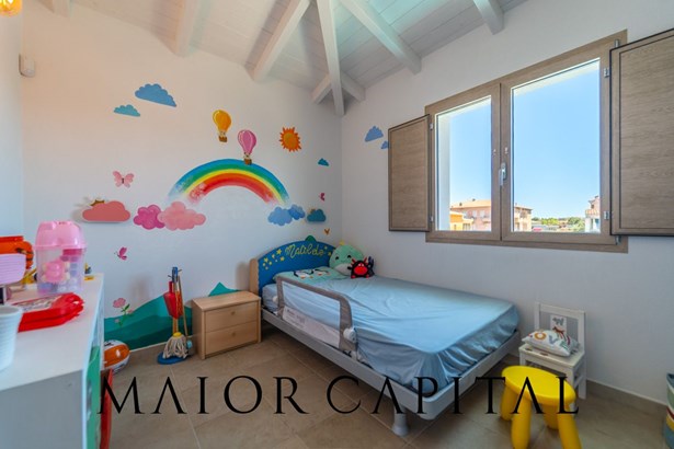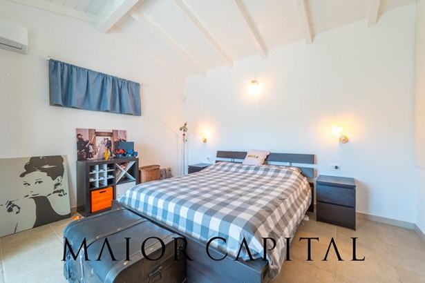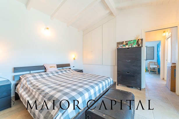 The second double bedroom on the upper floor is characterized by a ceiling with exposed wooden beams, an architectural element that adds brightness, character, and an authentic Mediterranean flair.