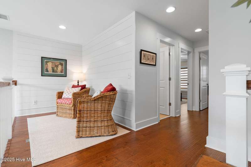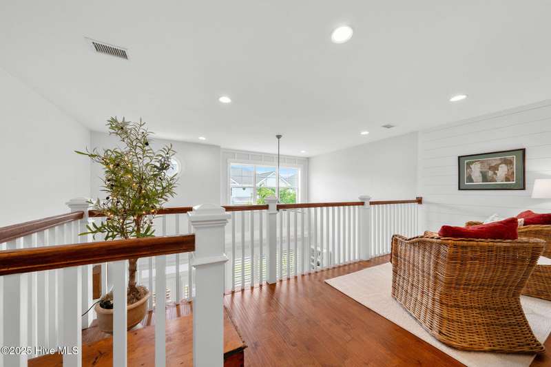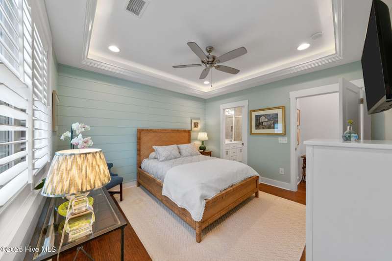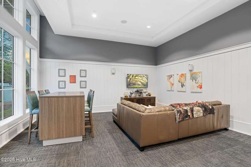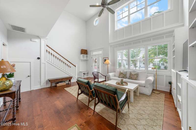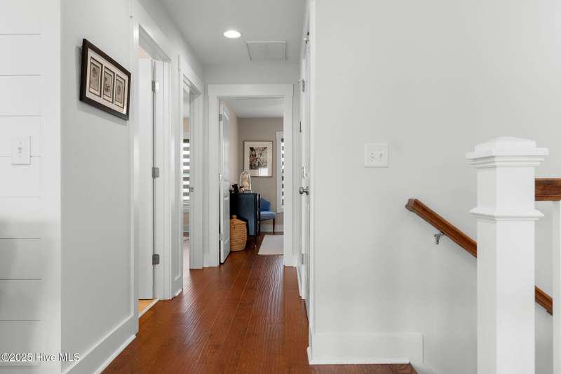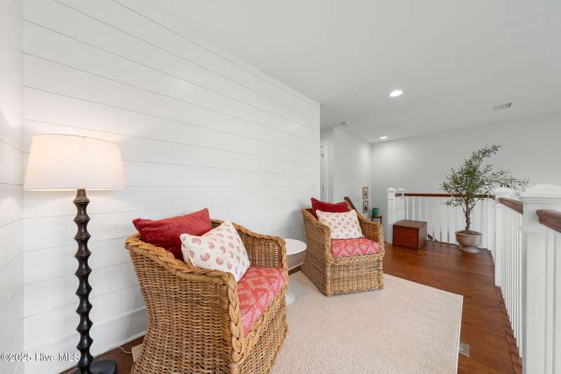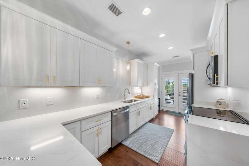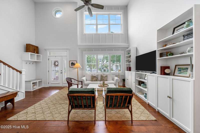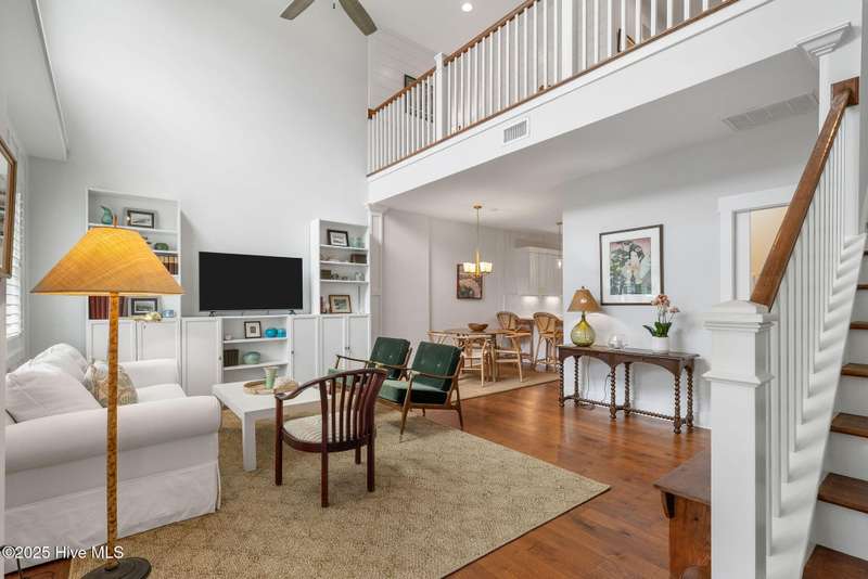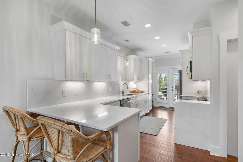 Thoughtfully finished RiverLights townhome with main-level primary bedroom and designer details. Entry opens to vaulted ceiling. Custom trim and hardwood floors throughout. Kitchen showcases Calacatta-gold quartz with a full-height backsplash and waterfall edge, soft-close shaker cabinetry with 5-piece drawer fronts, crown molding, champagne-brass hardware, a smart slide-in range (cook/bake/air-fry), and a pantry with pull-out shelves. Convenient primary suite features a shiplap accent wall, dual-sink vanity, tiled walk-in shower, and a walk-in closet. Laundry is tucked behind a barn door. Every non-GFCI outlet includes USB ports. Upstairs, a shiplap loft offers flexible space for office or hobbies, served by a full bath with tiled tub/shower surround. One of two secondary bedrooms includes a large walk-in closet. Plantation shutters finish the main-level windows and doors; custom shades appoint the upstairs bedrooms. Smart thermostats and ADT Security System add convenience and piece of mind while traveling or out enjoying all things that Wilmington offers. Storage is plentiful under the stairs and above the detached one-car garage, which includes a golf-cart outlet. French doors lead to a private, fenced patio and an additional exterior outlet. All appliances convey. Move-in ready! Take advantage of low maintenance living and all of the RiverLights amenities. HOA fees cover exterior maintenance and master insurance (wind and hail). Ideal for active lifestyles or busy professionals. Only one block from the walking trail around the lake. Amenities include clubhouse, fitness center, saltwater pool, playgrounds, parks, dog park, and upcoming pickle ball. Trails, sidewalks and streetlights throughout the neighborhood promote an active lifestyle. (HOA: 6-month rental minimum.)