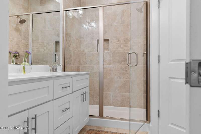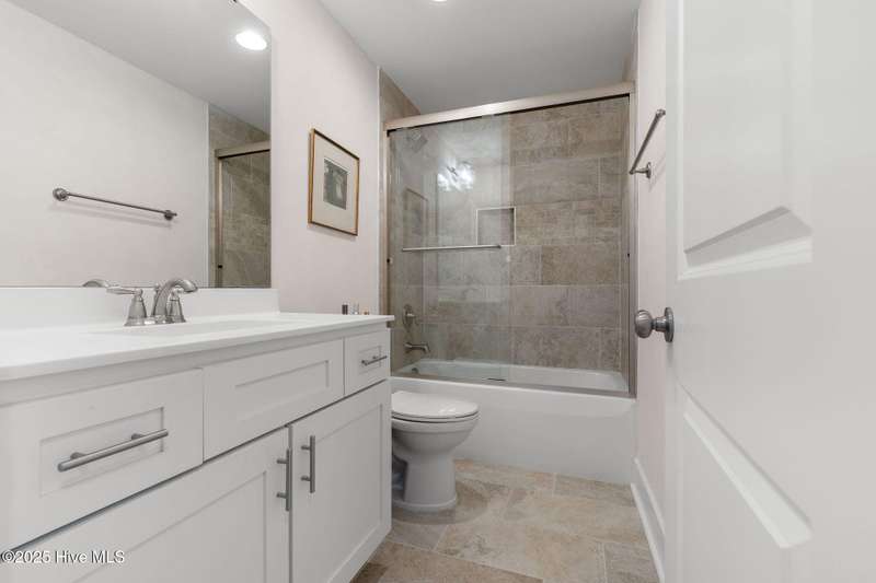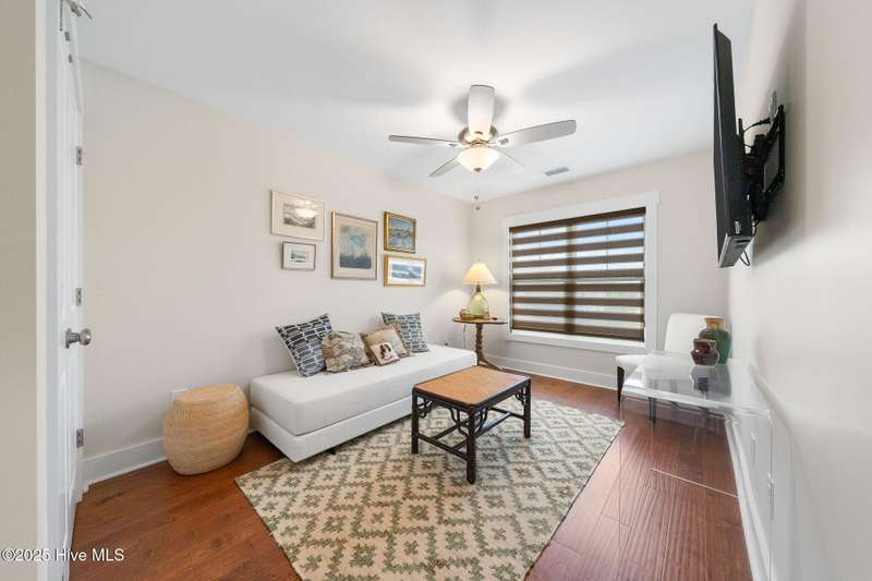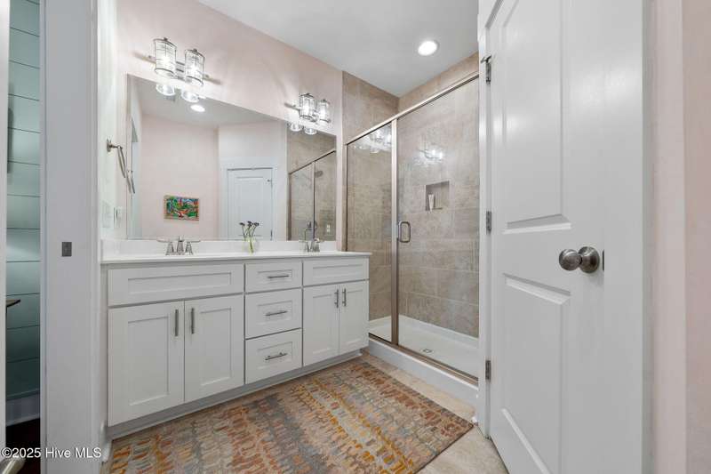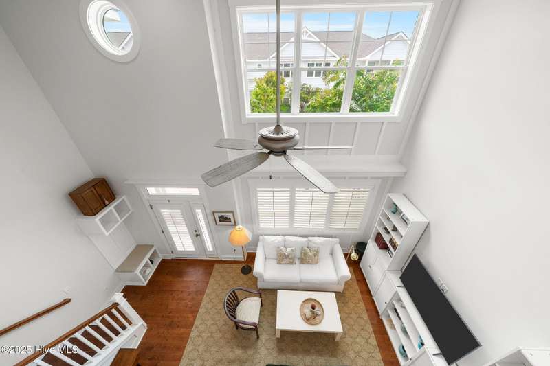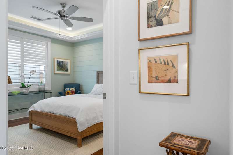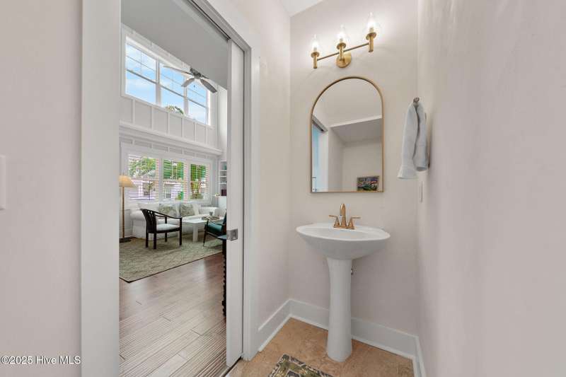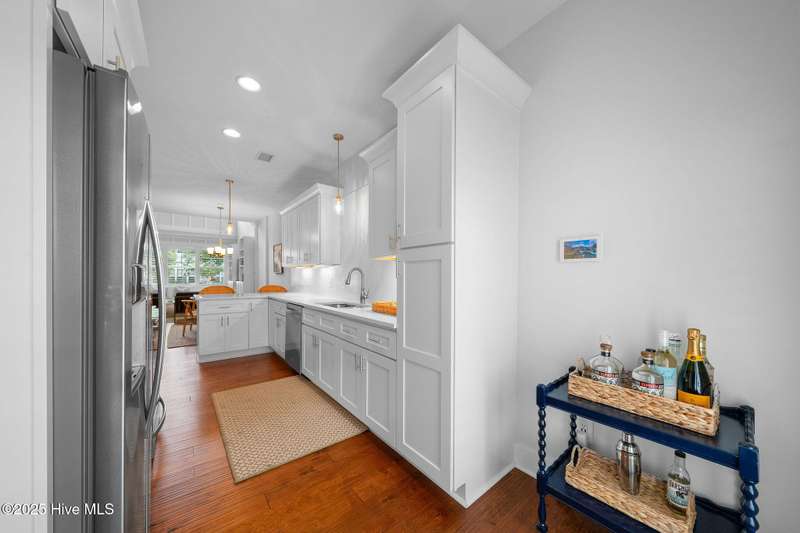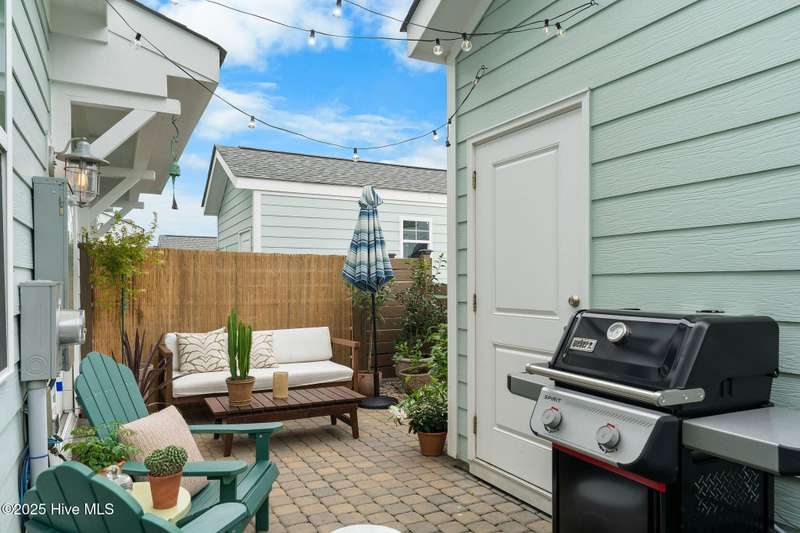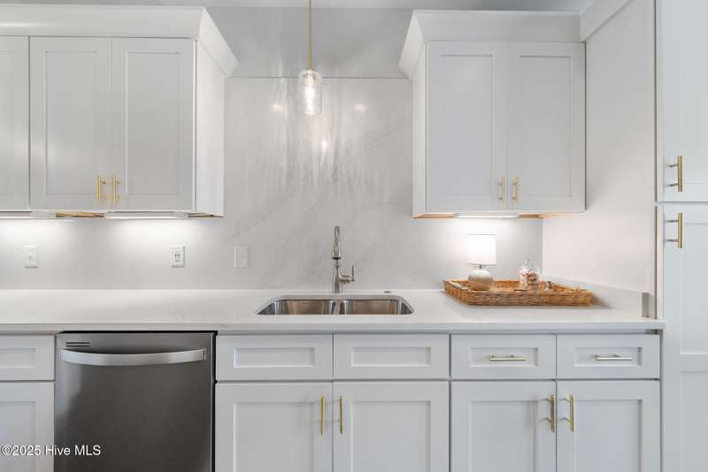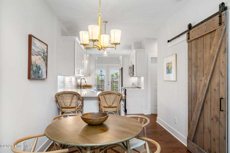 Thoughtfully finished RiverLights townhome with main-level primary bedroom and designer details. Entry opens to vaulted ceiling. Custom trim and hardwood floors throughout. Kitchen showcases Calacatta-gold quartz with a full-height backsplash and waterfall edge, soft-close shaker cabinetry with 5-piece drawer fronts, crown molding, champagne-brass hardware, a smart slide-in range (cook/bake/air-fry), and a pantry with pull-out shelves. Convenient primary suite features a shiplap accent wall, dual-sink vanity, tiled walk-in shower, and a walk-in closet. Laundry is tucked behind a barn door. Every non-GFCI outlet includes USB ports. Upstairs, a shiplap loft offers flexible space for office or hobbies, served by a full bath with tiled tub/shower surround. One of two secondary bedrooms includes a large walk-in closet. Plantation shutters finish the main-level windows and doors; custom shades appoint the upstairs bedrooms. Smart thermostats and ADT Security System add convenience and piece of mind while traveling or out enjoying all things that Wilmington offers. Storage is plentiful under the stairs and above the detached one-car garage, which includes a golf-cart outlet. French doors lead to a private, fenced patio and an additional exterior outlet. All appliances convey. Move-in ready! Take advantage of low maintenance living and all of the RiverLights amenities. HOA fees cover exterior maintenance and master insurance (wind and hail). Ideal for active lifestyles or busy professionals. Only one block from the walking trail around the lake. Amenities include clubhouse, fitness center, saltwater pool, playgrounds, parks, dog park, and upcoming pickle ball. Trails, sidewalks and streetlights throughout the neighborhood promote an active lifestyle. (HOA: 6-month rental minimum.)