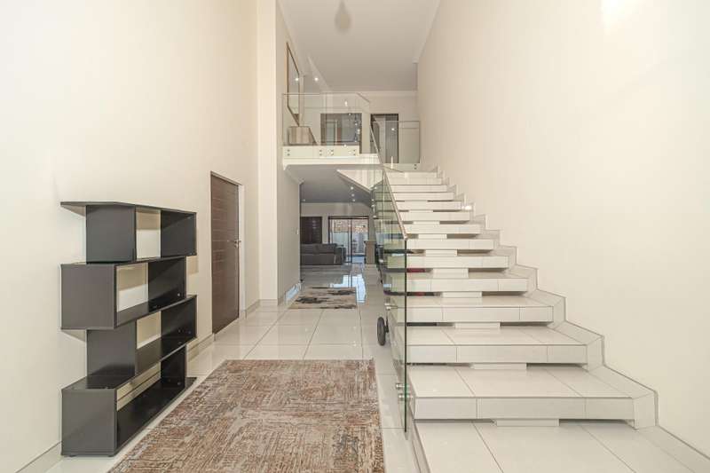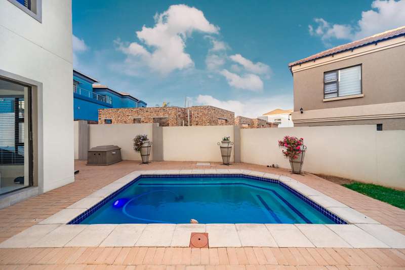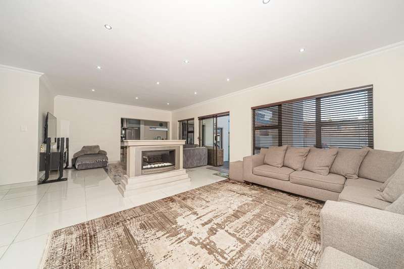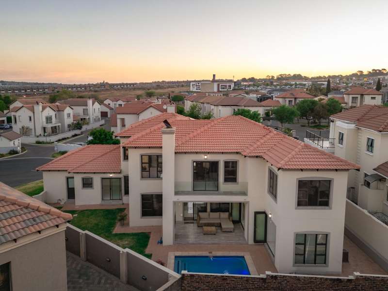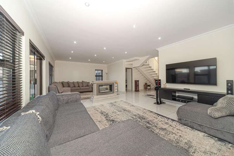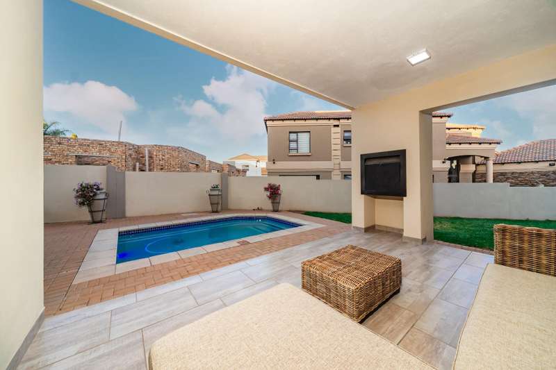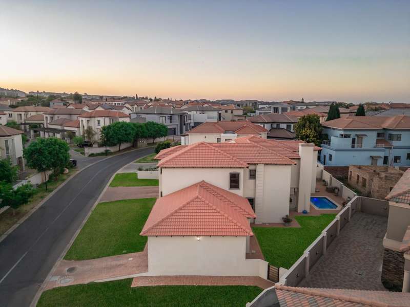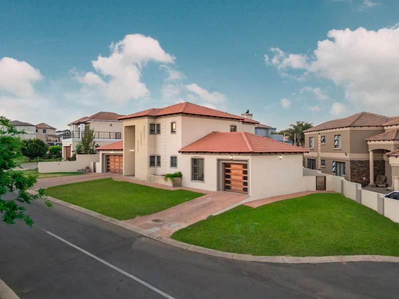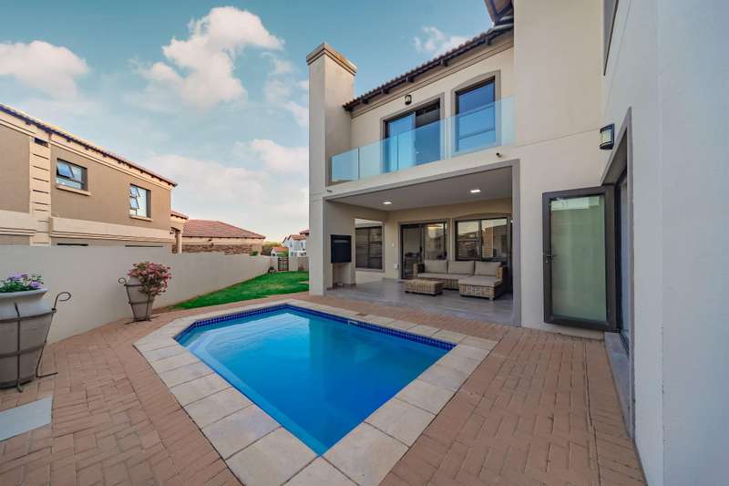 Discover this modern family home in the prestigious Blue Valley Golf and Country Estate, where luxury and comfort meet in perfect harmony. A striking double-volume entrance welcomes you, highlighted by an elegant staircase that sets the tone for the home?ÇÖs sophisticated design. The open-plan kitchen flows seamlessly into the dining area and connects to a separate scullery, making it ideal for both everyday living and entertaining. The home boasts two lounges with a central fireplace, creating a warm and inviting atmosphere. These living spaces open onto a covered patio with a built-in braai, overlooking the sparkling pool, Jacuzzi, and landscaped garden ?Çö a true entertainer?ÇÖs dream. Accommodation includes four spacious bedrooms, all ensuite. A private guest suite is conveniently located downstairs, while the upper level offers three ensuite bedrooms and a study. The main bedroom is a luxurious retreat with its own lounge area, walk-in closet, and a generously sized bathroom. This residence offers the perfect blend of style, comfort, and estate living at its finest.