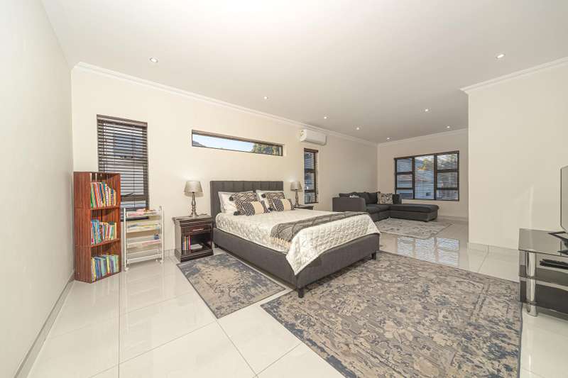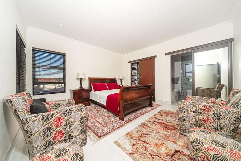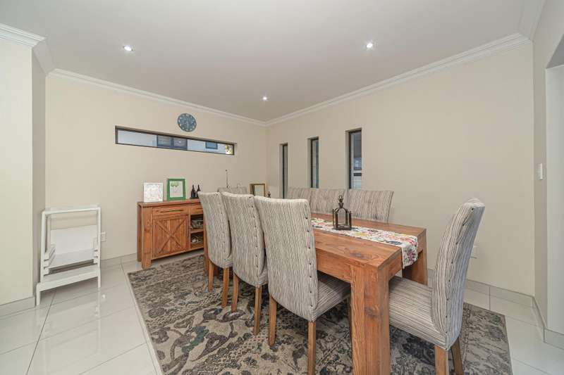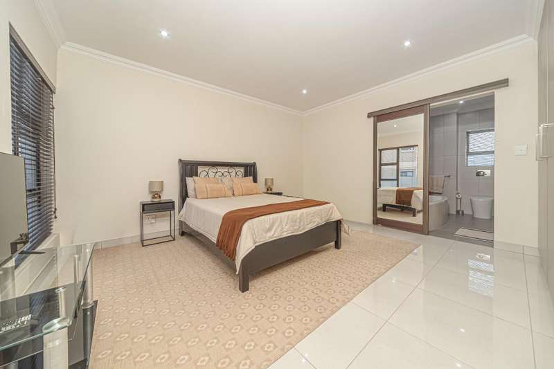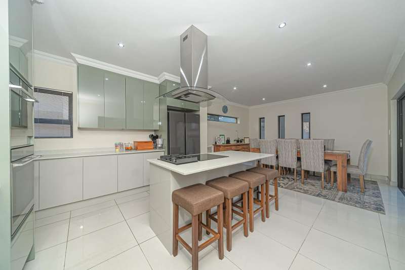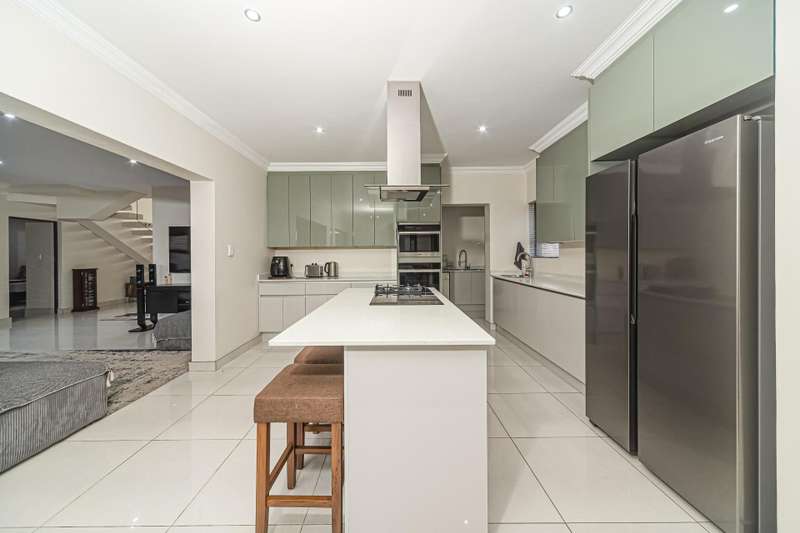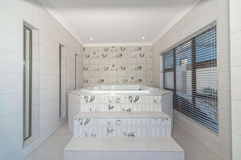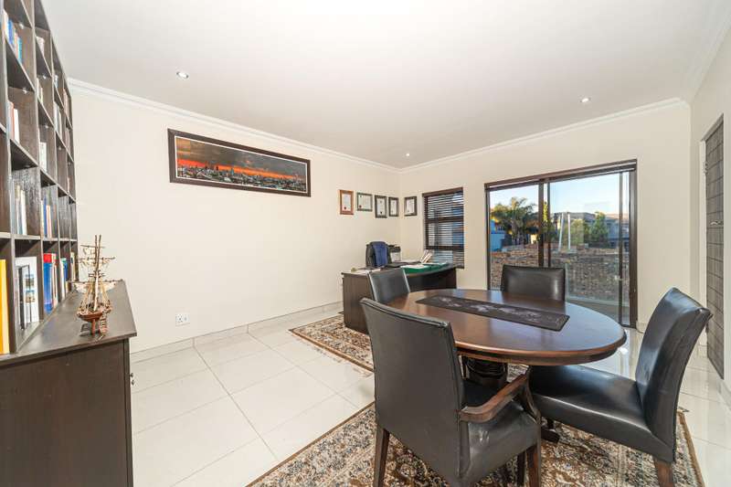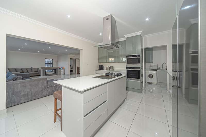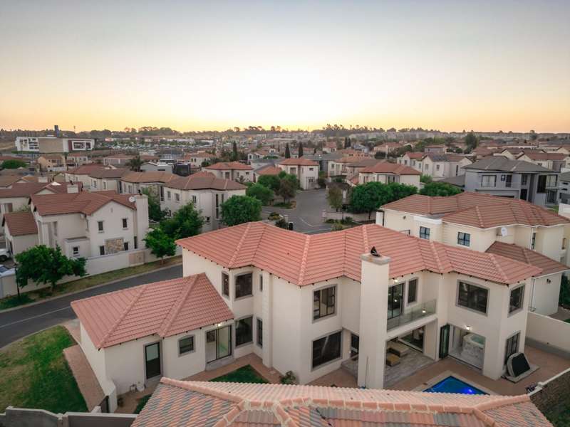 Discover this modern family home in the prestigious Blue Valley Golf and Country Estate, where luxury and comfort meet in perfect harmony. A striking double-volume entrance welcomes you, highlighted by an elegant staircase that sets the tone for the home?ÇÖs sophisticated design. The open-plan kitchen flows seamlessly into the dining area and connects to a separate scullery, making it ideal for both everyday living and entertaining. The home boasts two lounges with a central fireplace, creating a warm and inviting atmosphere. These living spaces open onto a covered patio with a built-in braai, overlooking the sparkling pool, Jacuzzi, and landscaped garden ?Çö a true entertainer?ÇÖs dream. Accommodation includes four spacious bedrooms, all ensuite. A private guest suite is conveniently located downstairs, while the upper level offers three ensuite bedrooms and a study. The main bedroom is a luxurious retreat with its own lounge area, walk-in closet, and a generously sized bathroom. This residence offers the perfect blend of style, comfort, and estate living at its finest.