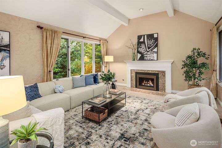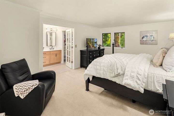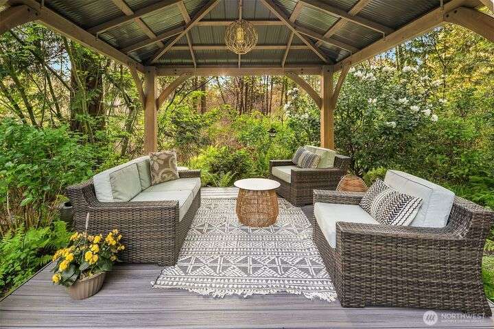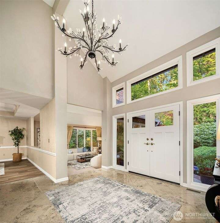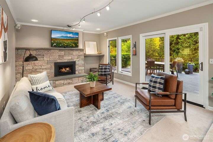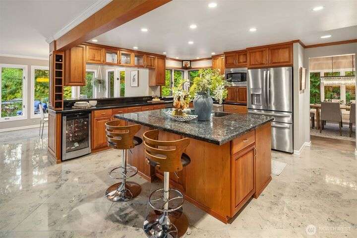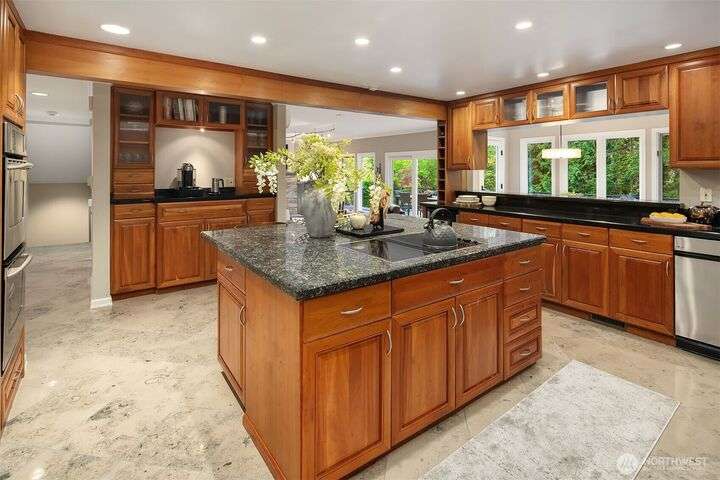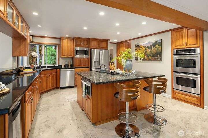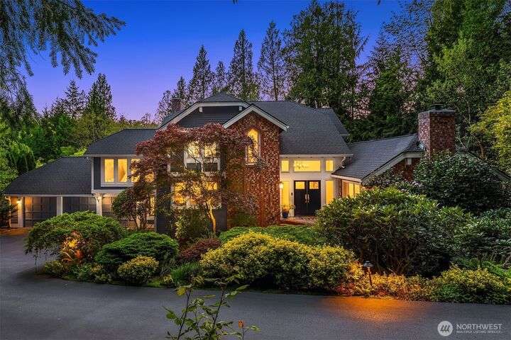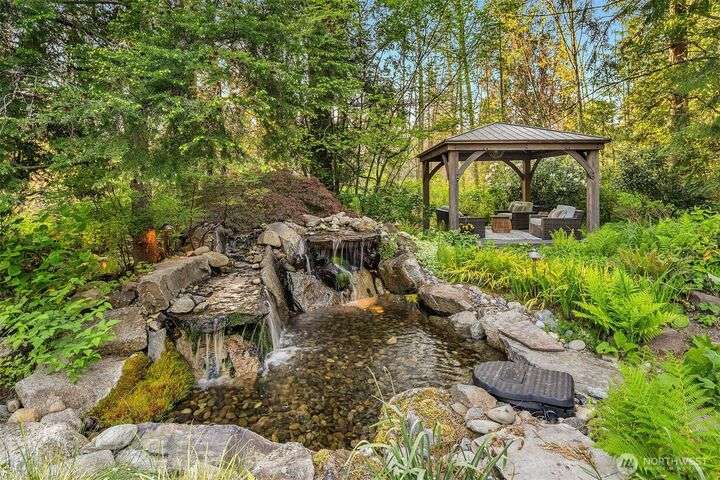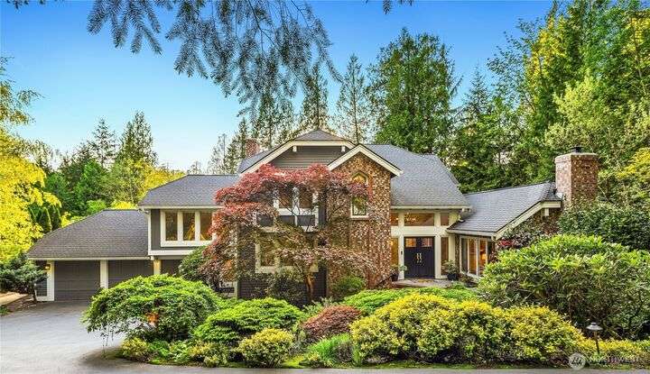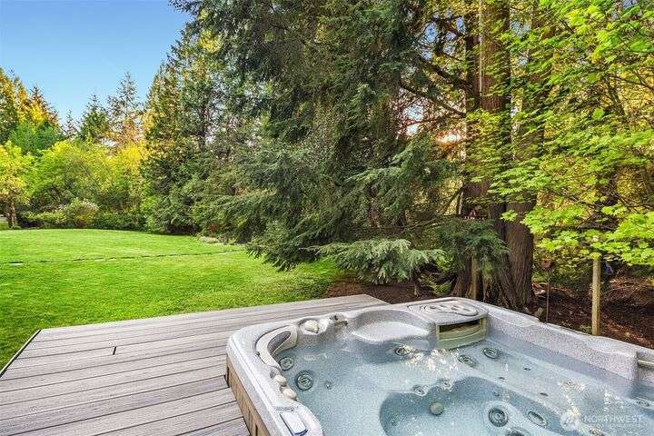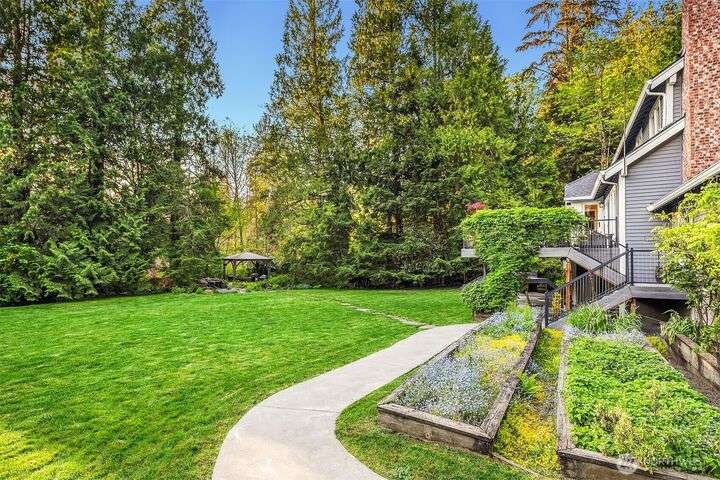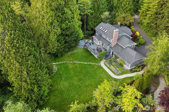 Impressive updates! Stunning estate style home on a sunny 1+ acre backyard oasis! Inviting living room has vaulted ceilings & wall of windows. Elegant dining room. Remodeled Chef’s kitchen offers dual ovens, warming drawer, large island & built-in buffet. Family Rm flows seamlessly to entertaining deck. Main floor office. Sumptuous primary suite has new renovated bath. Fabulous bonus rm! Lower level has full guest suite w/exceptional versatility: Kitchen, large bonus, Bdrm, bath, exercise rm & hidden storage. Separate entry is a perfect guest suite/entertaining area. Sunny backyard offers multiple decks, covered patio, huge level lawn, gazebo w/waterfall, hot tub, potting shed & more. Sought after Cherry Crest Elem. Home on sewer-No septic!
