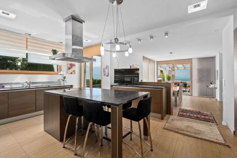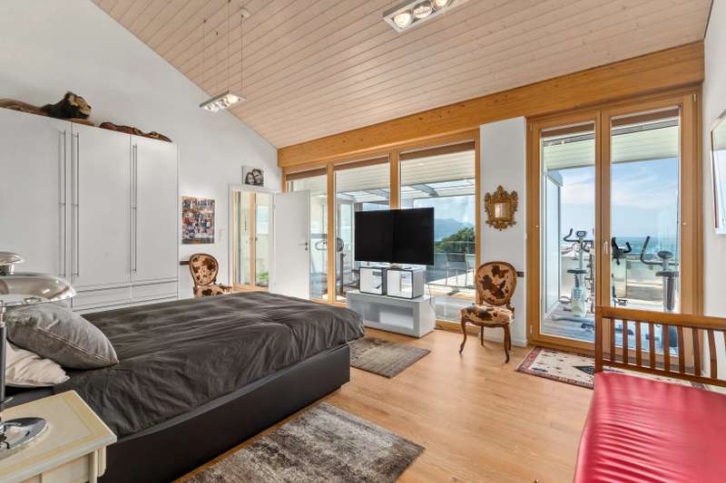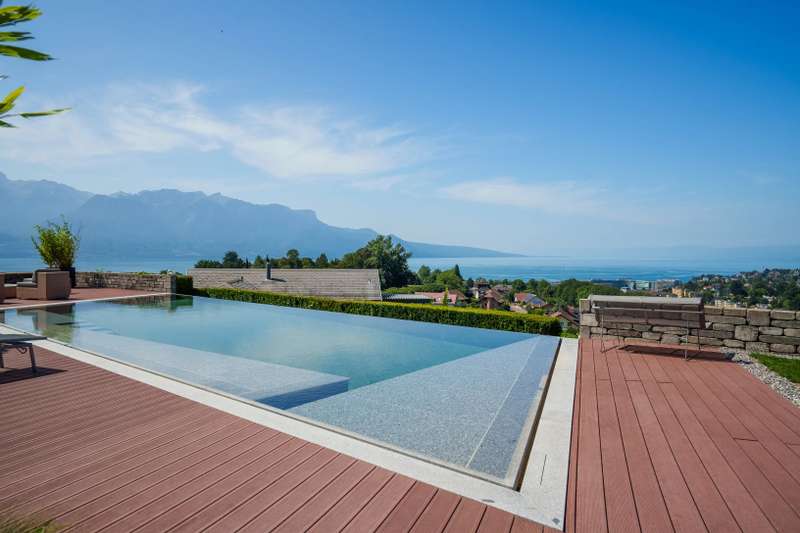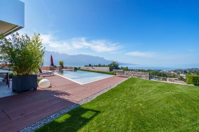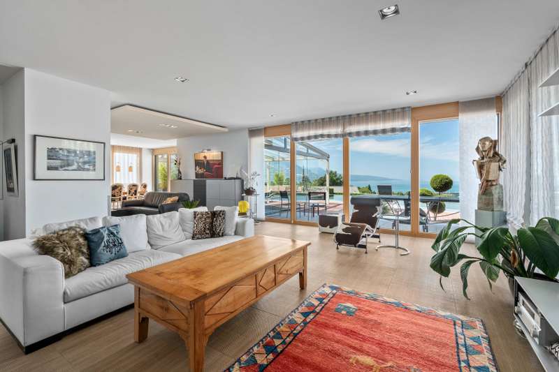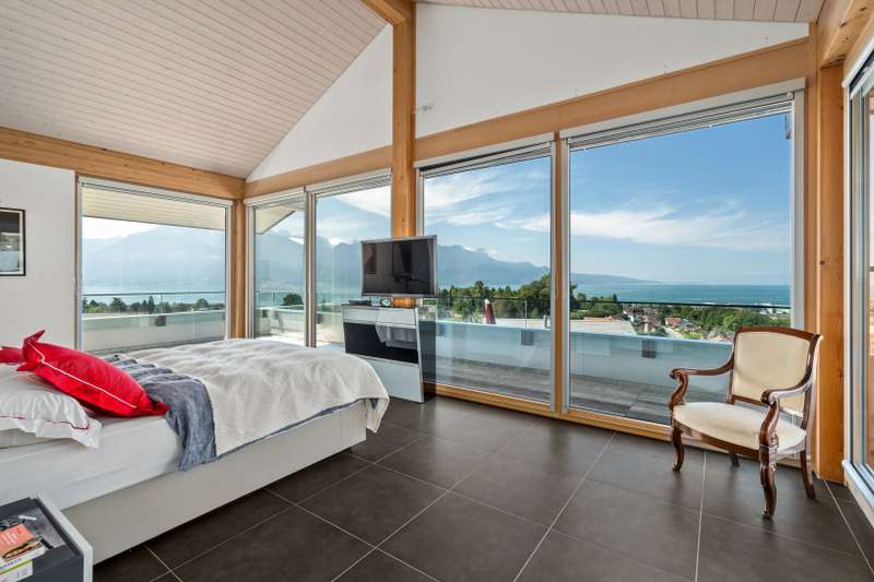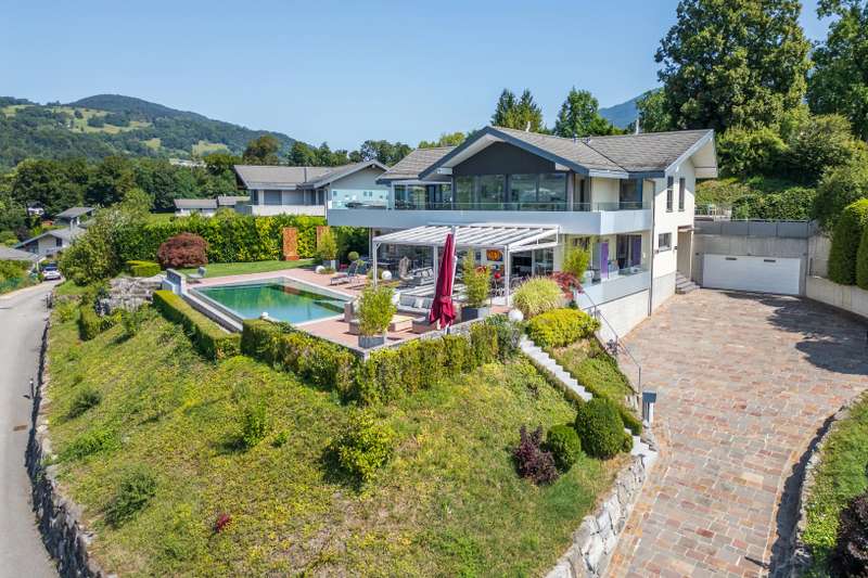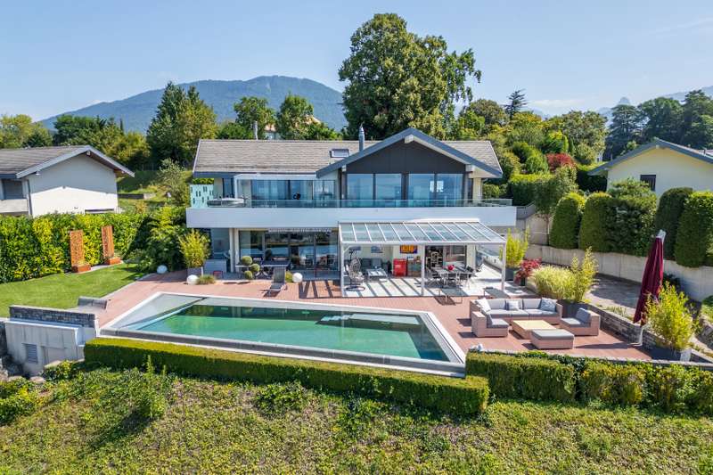 Located within a private and secure estate, this magnificent high-end property offers an idyllic living environment, combining tranquility with excellent accessibility. Thanks to its modern design and large bay windows, the villa is bathed in natural light throughout the day and enjoys breathtaking views over the entire lake and surrounding vineyards. Situated on a generous 1,836 m² plot, the property boasts an impressive 424 m² of usable space. The ground floor features vast reception areas, including an entrance hall with guest restroom, a spacious living room with a fireplace, a dining area, and a large fully equipped kitchen with a central island. This level also includes a large bedroom with an en-suite shower room. A vast terrace, complemented by a heated stainless steel infinity pool with a mirror effect, two cellars, a laundry room, and two garages accommodating three vehicles, complete this floor. Upstairs, you will find two spacious and voluminous en-suite bedrooms, one of which features a veranda. Each has access to a large terrace with a jacuzzi. Additionally, there is a generous hall, a bedroom with an en-suite shower room, and a sauna area for your well-being. The high ceilings throughout the villa create an unparalleled sense of space and volume. Every detail has been carefully considered, with high-quality finishes and meticulously selected materials. Residents of the prestigious Jolimont estate have the privilege of accessing a communal building that houses an indoor swimming pool and a wellness area. This property is the most exclusive in the neighborhood. Thanks to its dominant position and orientation, privacy is preserved, whether by the pool, on the terraces, or in the bedrooms.