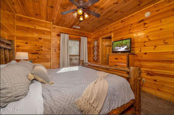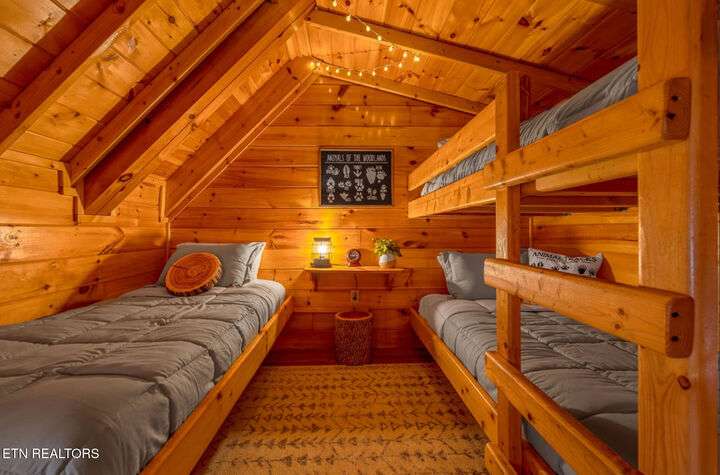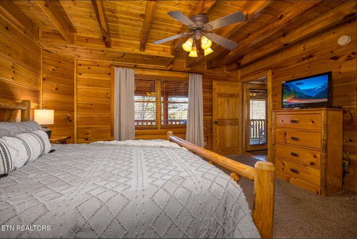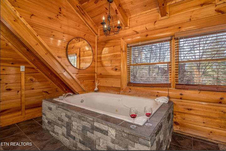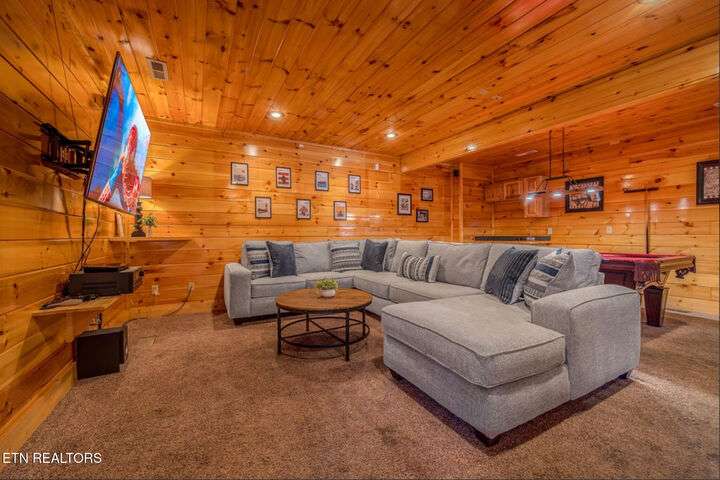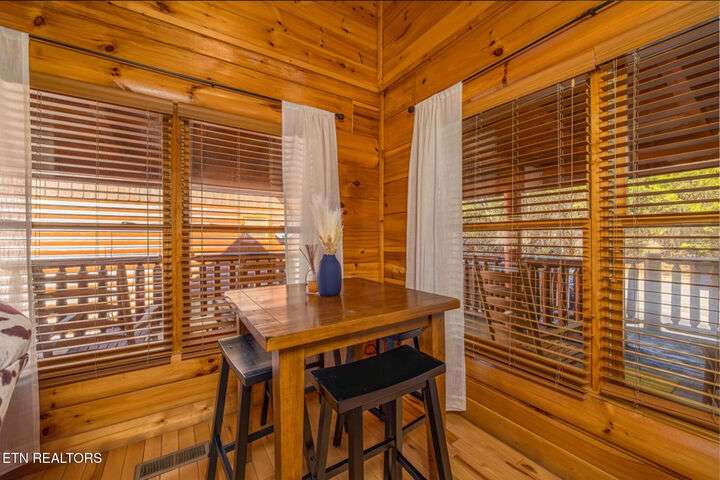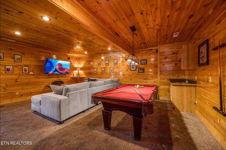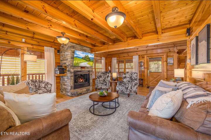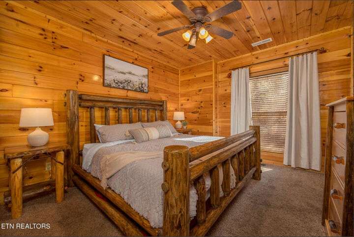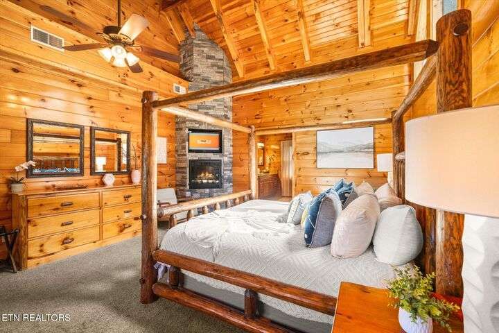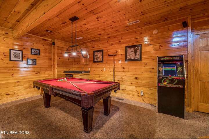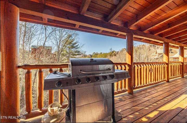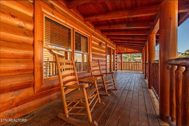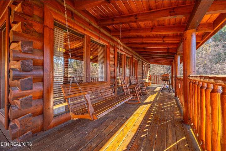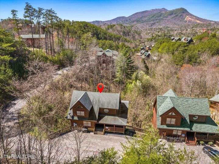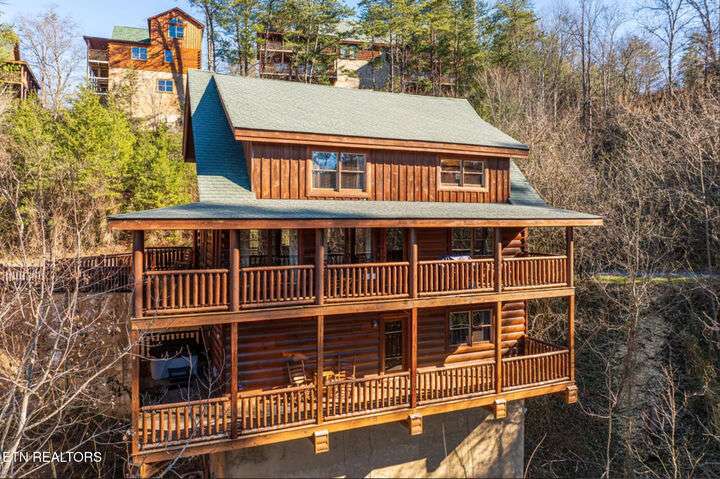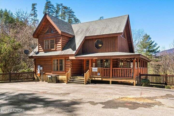 HUGE PRICE REDUCTION!!! MOTIVATED TO SELL THIS UNIQUE LUXURY LOG CABIN LIKE NO OTHER WITH INCREDIBLE MOUNTAIN VIEWS!!! The cabin name is ''Playhouse Cinema''. Just wait until you see what's inside!! When you enter look up & you will see what sets this cabin apart and makes it unique. There is a ''Custom Built Log Cabin Playhouse'' which was perfectly crafted for the kids and family to enjoy!! It is much more than just a playhouse for children, though. It actually functions as their very own private area to sleep, play, watch TV and more. I love the front porch with rocking chairs but take a closer look inside and take note of the vaulted ceilings, lighting, furniture & 3 beds for sleeping! It will literally entertain them for hours on end!! On this level there is also an oversized Master Bedroom that has very tall vaulted/beamed ceilings, a floor to ceiling stone fireplace and a bedside Jacuzzi. The Master Bath on this level is Huge and has double vanity sinks, Granite countertops, a shower and lots of storage space-closets. This cabin has been meticulously maintained by the owner who has upgraded the cabin with thousands of dollars in the finest furnishings. When you walk into this cabin you will notice the large foyer with high top table and seating to the right. The Living Room is very large and spacious. It features a floor to ceiling Stone Fireplace, Beamed Ceilings, Sleeper Sofa, Loveseat, and even more additional seating. The dining area has a large dining table with seating for 8 guests. The Fully Equipped Kitchen has lovely granite countertops. There is a Breakfast Bar with additional seating and tons of counter space. A half bath just off to the side is also very convenient for all guests to use. On the main level is another oversized bedroom with King Size Bed, and private bath. The main level of the cabin has a completely covered walk around deck with rocking chairs, bbq grill and even a swing where you can relax and take in the most breathtaking Mountain Views!!! Now lets go downstairs and discover the Cinema Room with comfortable lounging area for a large number of guests to enjoy watching their favorite movie!! There is a full size Pool Table, Multi-Cade Game, and even a Wet Bar!! Let the fun begin!!! Two more huge bedrooms on this level have their very own private baths as well. The deck on this level wraps around the cabin and there is a Hot Tub to enjoy in privacy while taking in those Mountain Views!! This log cabin is nestled in the private and gated community of Bear Creek Crossing Resort. This highly sought after Resort is located just minutes to all the attractions, entertainment, and dining. Bear Creek Crossing Resort is a well known cabin community that is popular for its breathtaking 65' waterfall, indoor and outdoor pools, miniature golf course and play area for children. This Cabin is easily accessible and the roads are good. Families love staying here as noted by all the incredible reviews!! This cabin has 4 bedrooms, 4 full baths and 1 half bath and can easily accommodate up to 13 guests. The cabin is perfect for large groups of people, multiple families or family reunions! All bedrooms in this cabin have King Size Beds, Plasma TV's with DVD player's and their own private bathrooms with granite countertops. High Speed Comcast Cable Internet Lines are currently being installed all through this resort, though the current internet and tv work exceptionally well. Cabin being Sold Fully Furnished!!