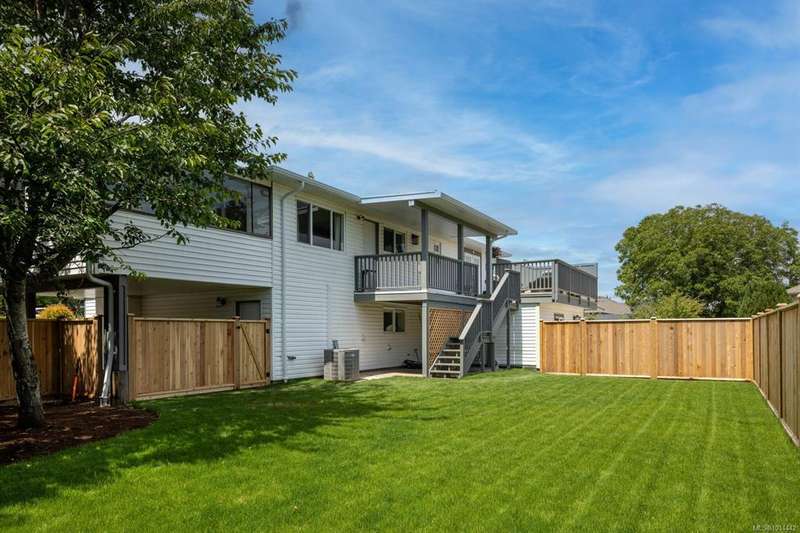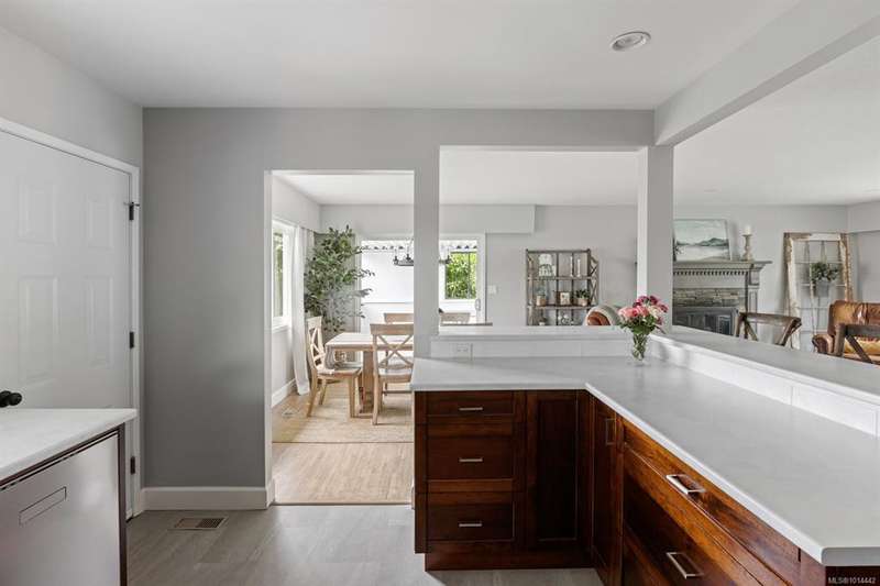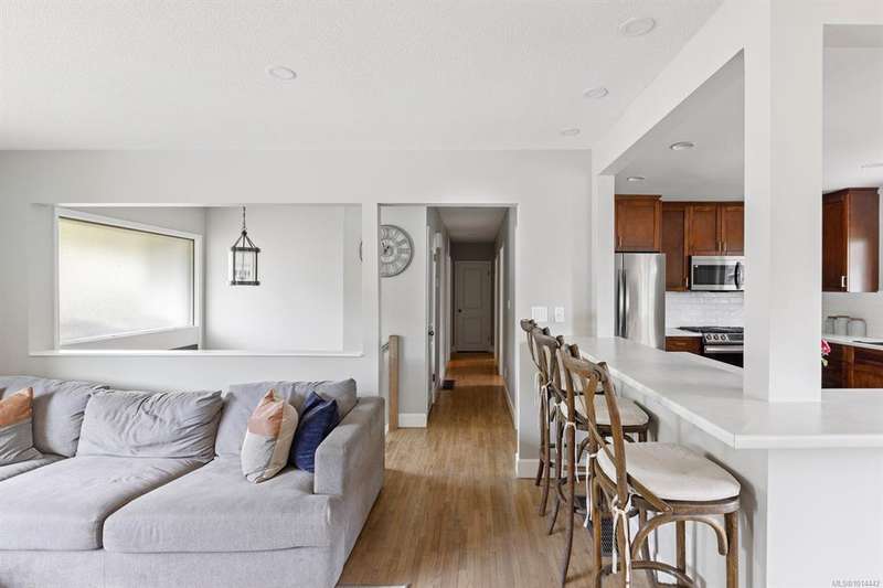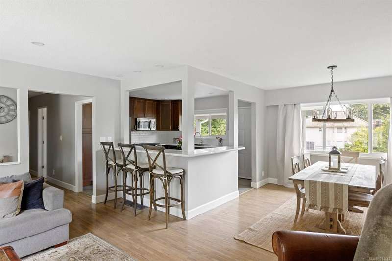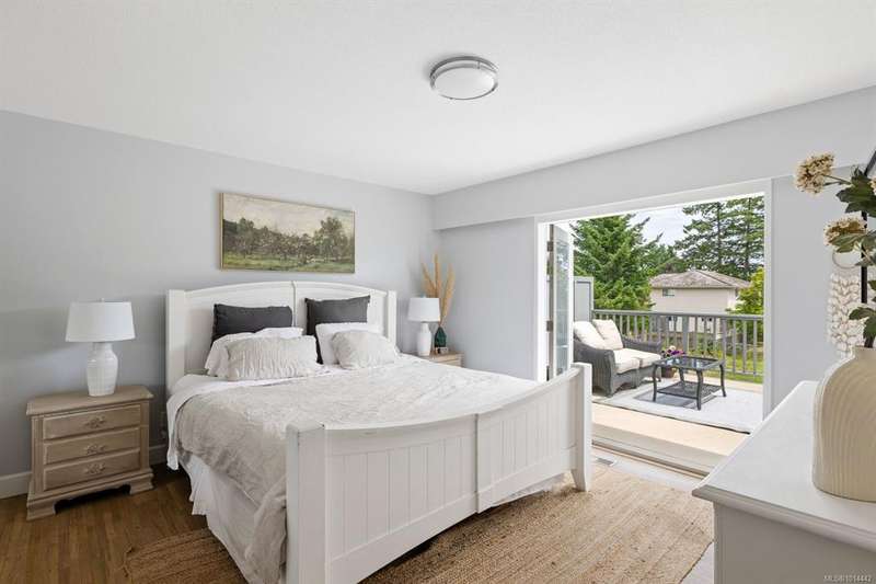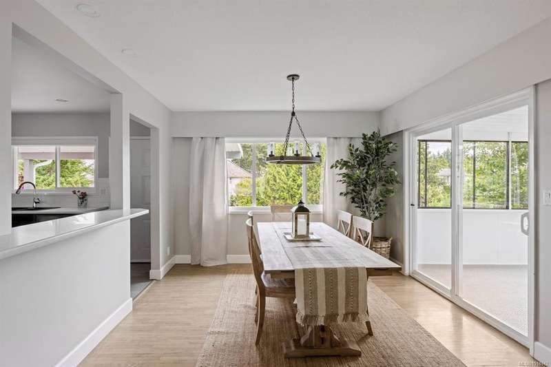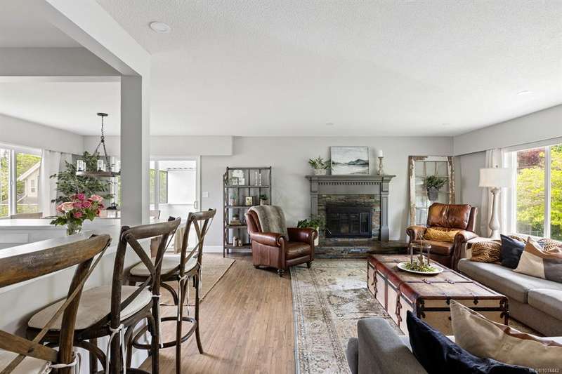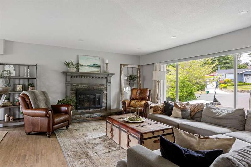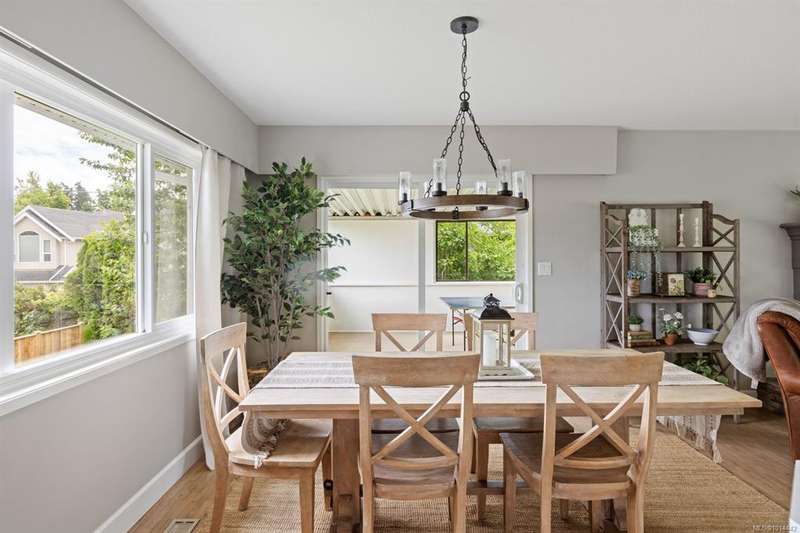 Beautifully renovated 4 bed/3 bath home with timeless appeal in sought-after Tanner Ridge! Offering 2,465 sqft of refined living space, the main level features 3 bedrooms, including a generous primary with sundeck access and a spa-like 5-piece bath. Enjoy an open-concept layout with hardwood floors, abundant natural light, and a stylish kitchen with wood cabinetry and stainless steel appliances. The lower level includes a spacious family room, 4-piece bath, laundry, and a 1-bed in-law suite. Highlights: wood burning fireplace, gas gas furnace with A/C, vinyl windows, new roof, and a large garage/workshop. Outside, relax in the fully fenced yard with manicured gardens, a sundeck, and covered patio—perfect for kids and entertaining. Close to parks, schools, and just minutes from Saanichton and Sidney.