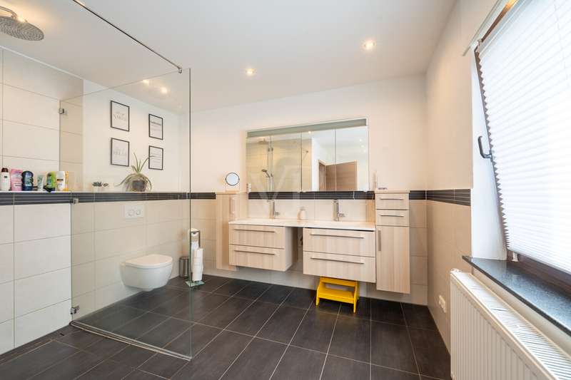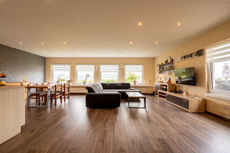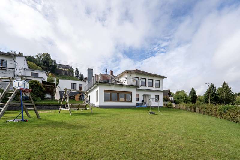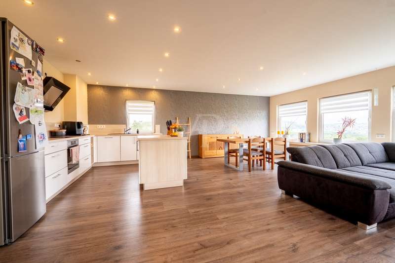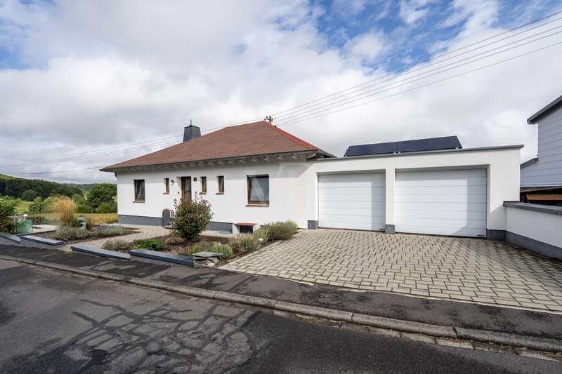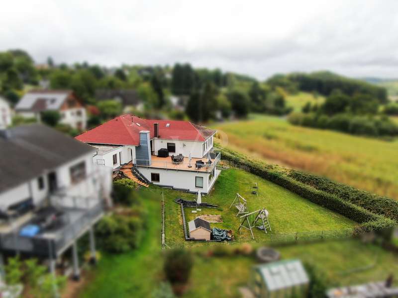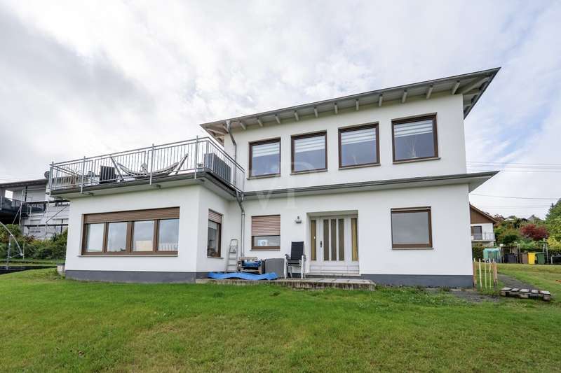 Surrounded by picturesque nature, this well-kept bungalow, which was extensively renovated in 2015, is located in the small village of Molsberg near Wallmerod. The spacious main apartment on the first floor offers comfortable living on one level and impresses with a light-flooded, open-plan living/dining area with integrated kitchen, three bedrooms, a modern bathroom with bathtub and shower, a guest WC and a spacious roof terrace with far-reaching views of the countryside. A separate entrance leads to the approx. 95 sqm granny apartment in the basement. Here you will find a living room, 2 bedrooms, a modern shower room and a small kitchen. Special features: -open living/dining area well-maintained, open fitted kitchen in main apartment -modern bathroom with bath and shower in main apartment -Pellet-fueled fireplace -spacious terrace with unobstructed distant views -balcony power plant -Garden with additional terrace -separate 3-room granny apartment in the basement Two garage parking spaces round off the offer.