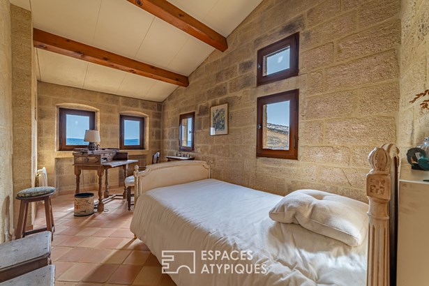 As a bonus, you will discover a pretty 25sqm courtyard which offers the possibility of installing a small pool. In a subtle play of levels and via a very beautiful central stone staircase, on the first floor you will discover a pleasant room which serves as a painting workshop, then a living room of almost 45sqm offering magnificent solid parquet flooring and a generously sized fireplace. , and an office with a balcony, all enjoying a breathtaking view.