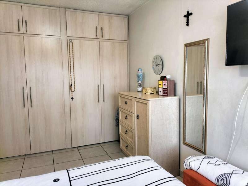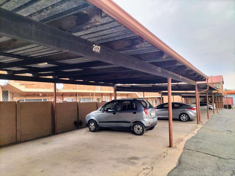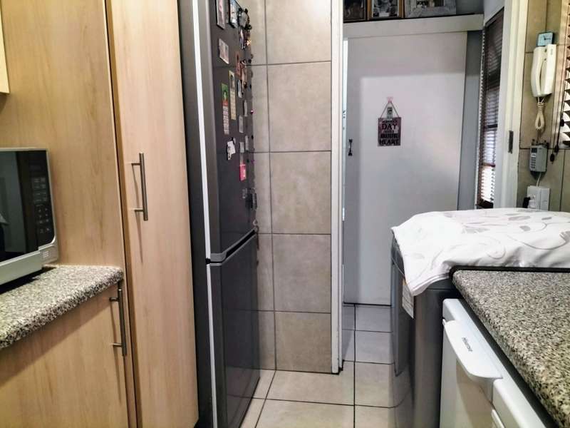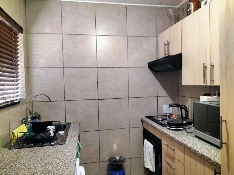 * A separate kitchen with fitted cupboards. There's an under-counter oven, hob and extractor fan. The window blinds are a fixture. The back door opens out to the passage and the complex parking area.