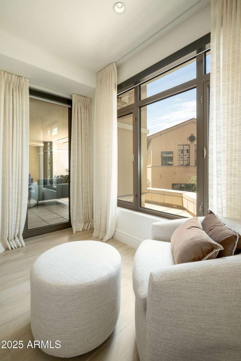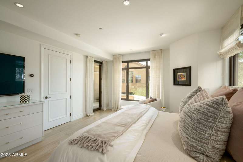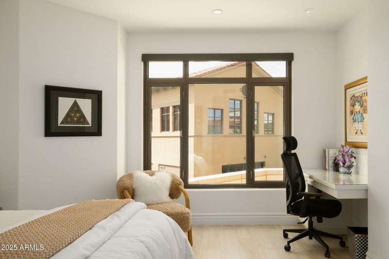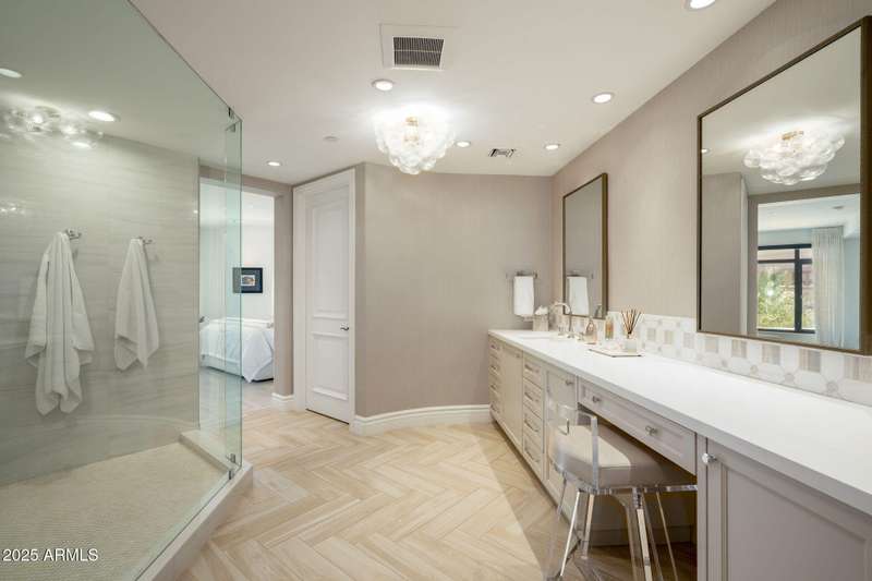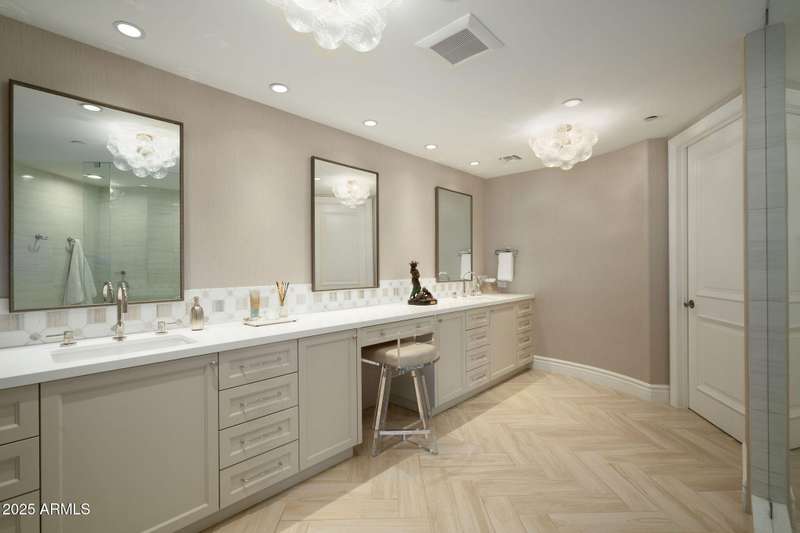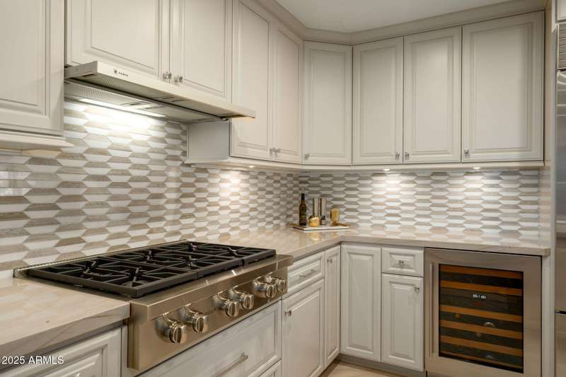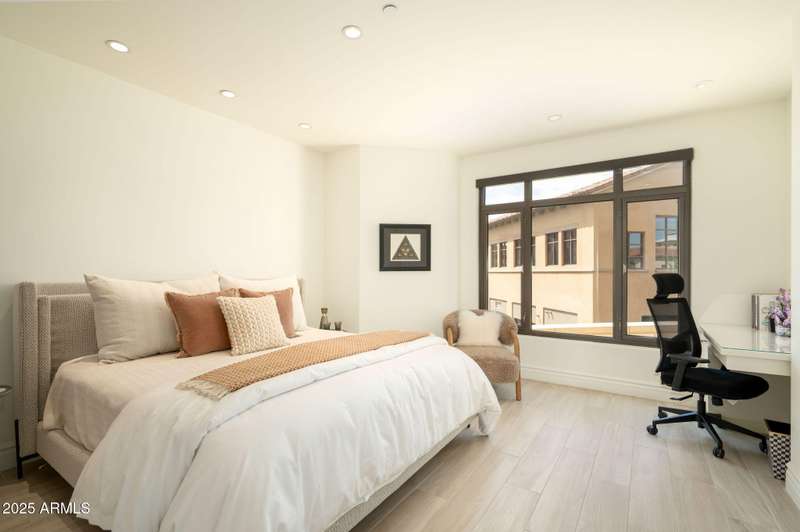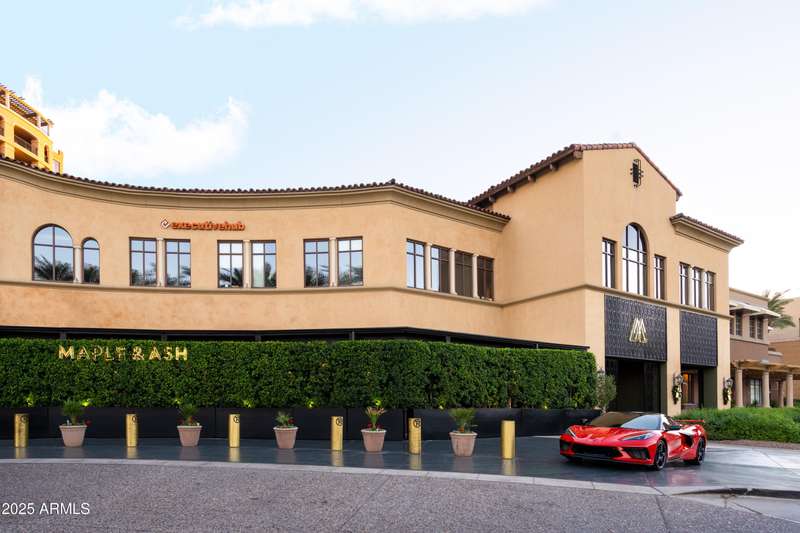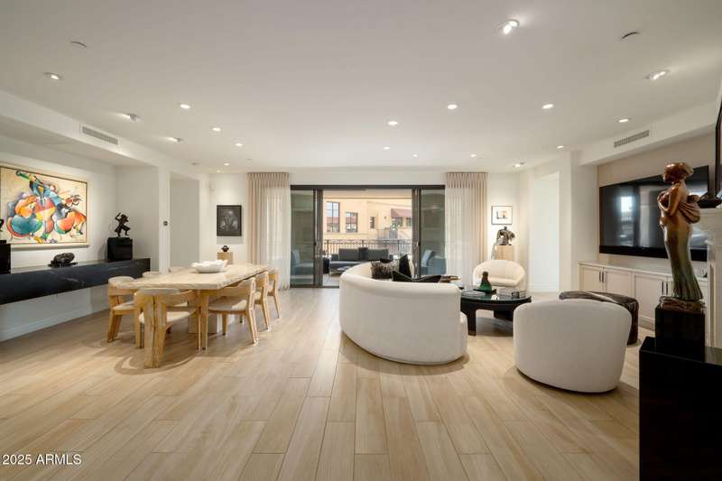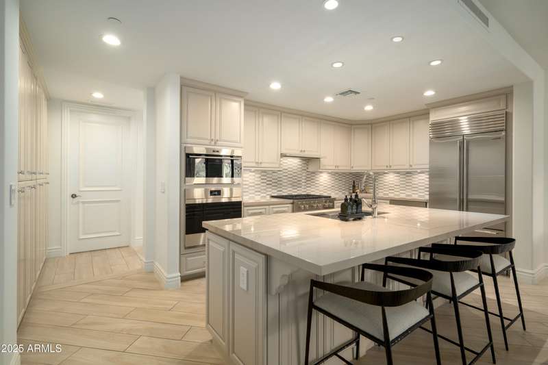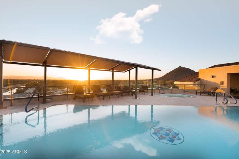 Experience elevated waterfront living in the heart of Scottsdale's premier high-rise community. This meticulously redesigned 3-bedroom, 3.5-bath residence offers 2,503 sq. ft. of sophisticated design, fully remodeled between 2022 and 2023 with a reconfigured floor plan, modern finishes, and timeless details. Striking north and west architectural views, while interiors showcase porcelain wood-look tile throughout (no carpet), fresh paint, automated blackout shades, directional art lighting, and a marble-trimmed fireplace. A floating leathered granite buffet in the dining room and dimmable lighting throughout create the perfect backdrop for entertaining. The chef's kitchen is a true showpiece with an extended quartzite island, marble backsplash, custom pantry, new Sub-Zero fridge, Wolf 6-burner gas range with oven and microwave, Bosch dishwasher, Sub-Zero wine chiller, and refined cabinetry. The redesigned laundry includes quartz counters, hanging space, and upgraded full-size washer and dryer. The primary suite is a sanctuary, featuring a private patio exit, built-in furnishings, custom wall coverings, blackout shades, and a fully reimagined bath with an enlarged walk-in shower, dual vanities plus makeup area, marble accents, and a Toto toilet. Each guest suite is equally refined, offering en-suite baths, new vanities, custom cabinetry, blackout shades, and thoughtful additions such as built-in desks, murphy bed, and storage. Residents enjoy premier community amenities including valet, concierge, rooftop pool and spa, fitness center, club room, and more, along with the convenience of two dedicated parking spaces and a private storage unit. All of this is set just steps from Scottsdale's best dining, shopping, art galleries, and entertainment.