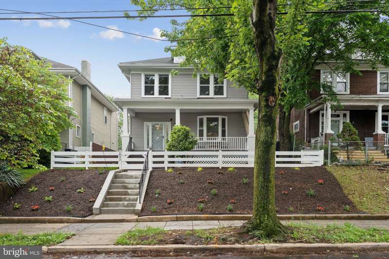 Incredibly charming single family home. Open, contemporary and flooded with sunlight. Wonderfully welcoming wrap around porch. Table space kitchen, separate dining room with two story atrium with skylights. Large living room leading to rear deck. Two master bedroom suites on upper level. Above grade lower level with family room, bedroom and full bath. 2 parking spaces in rear