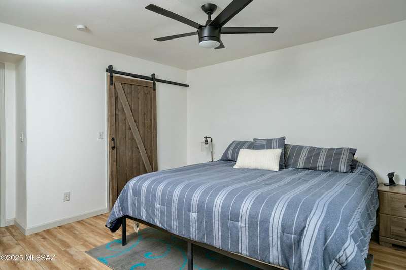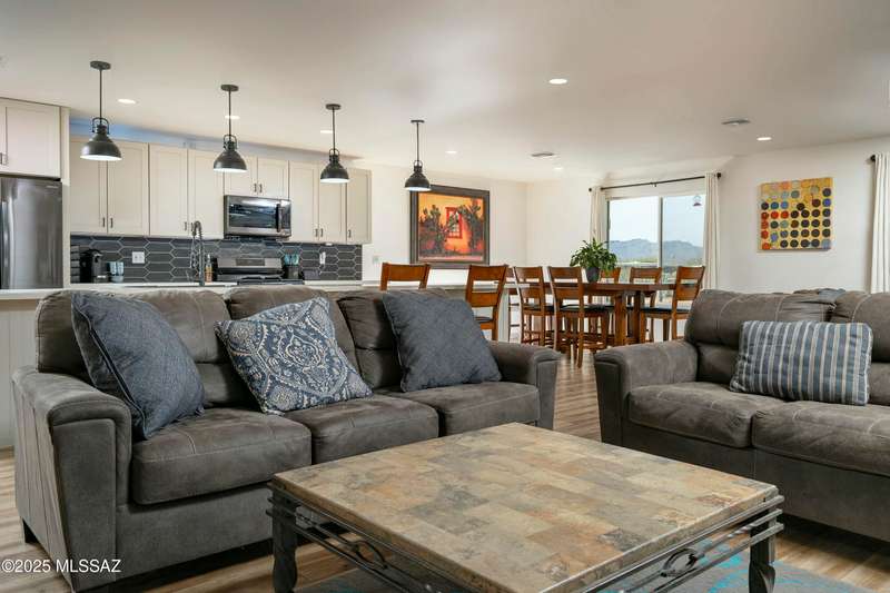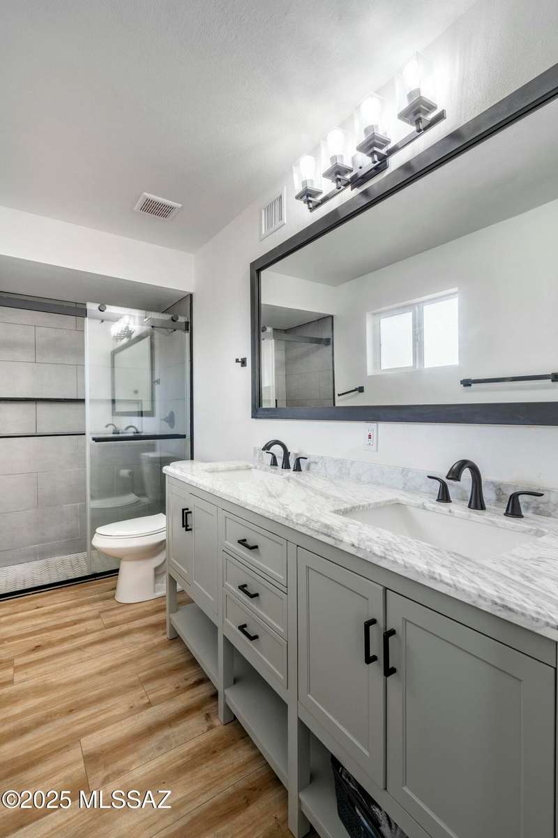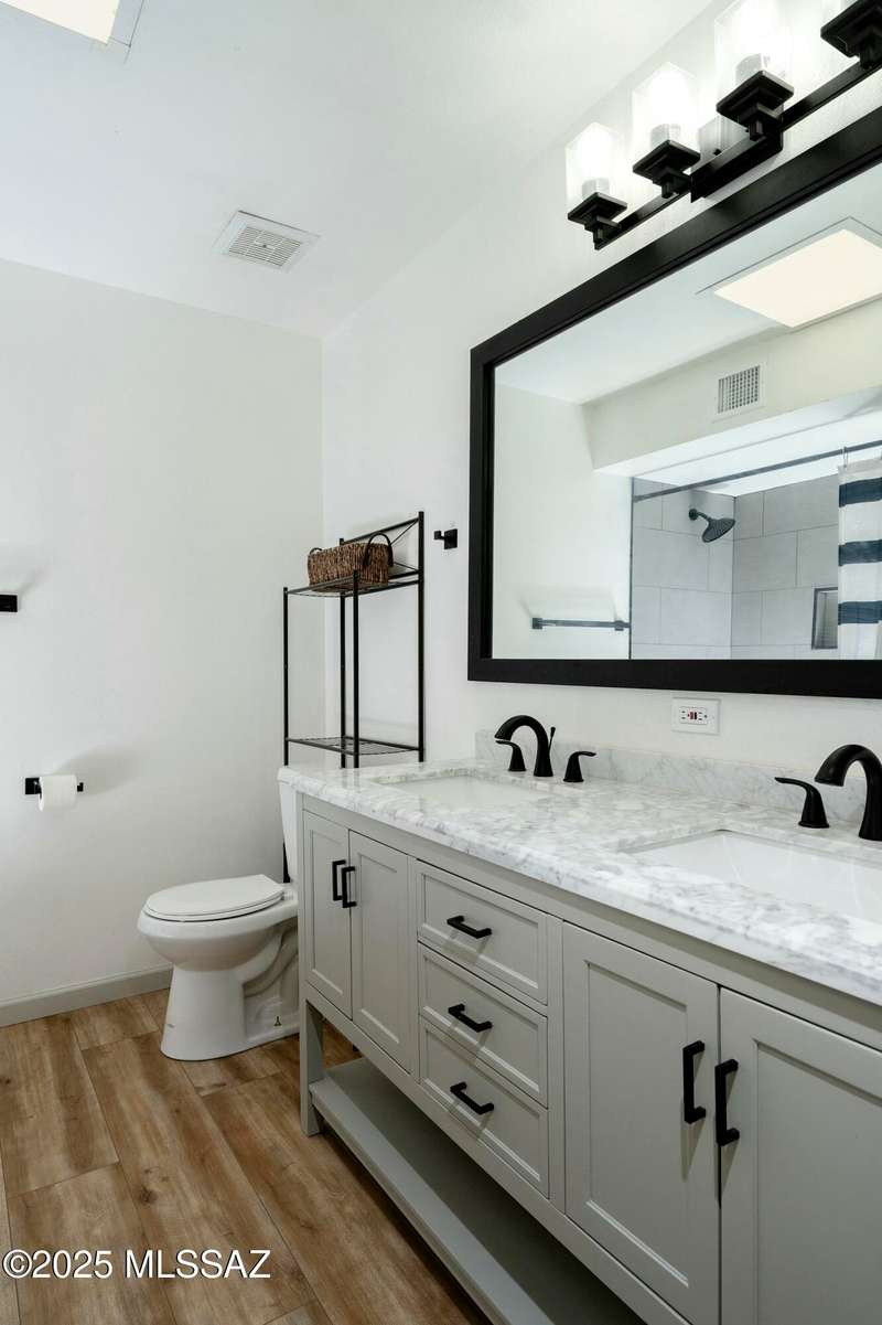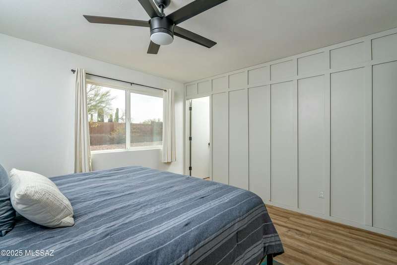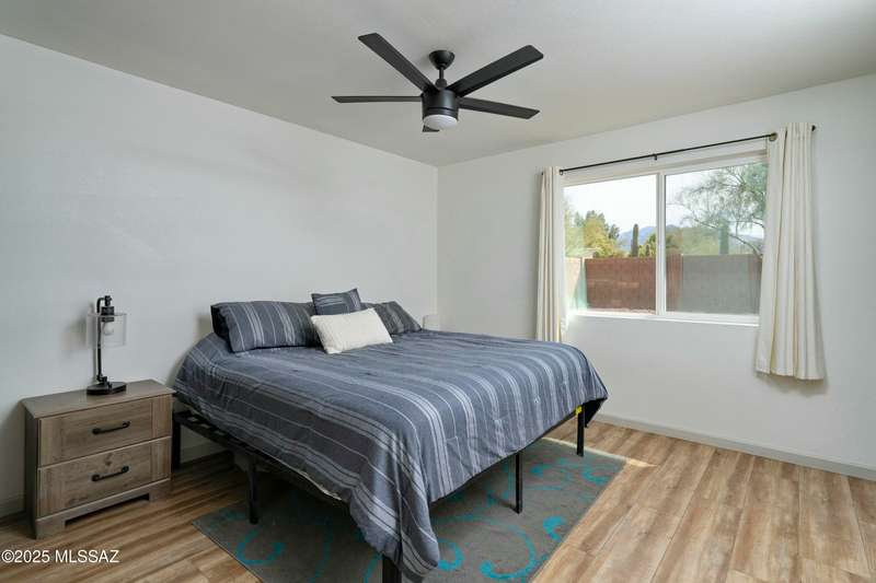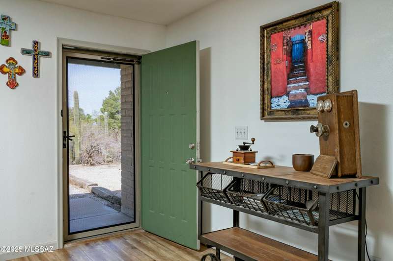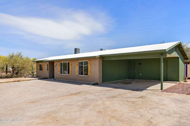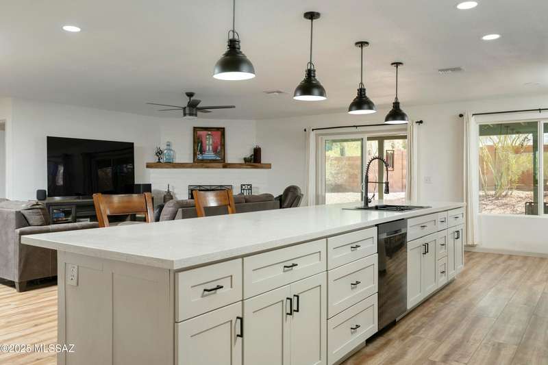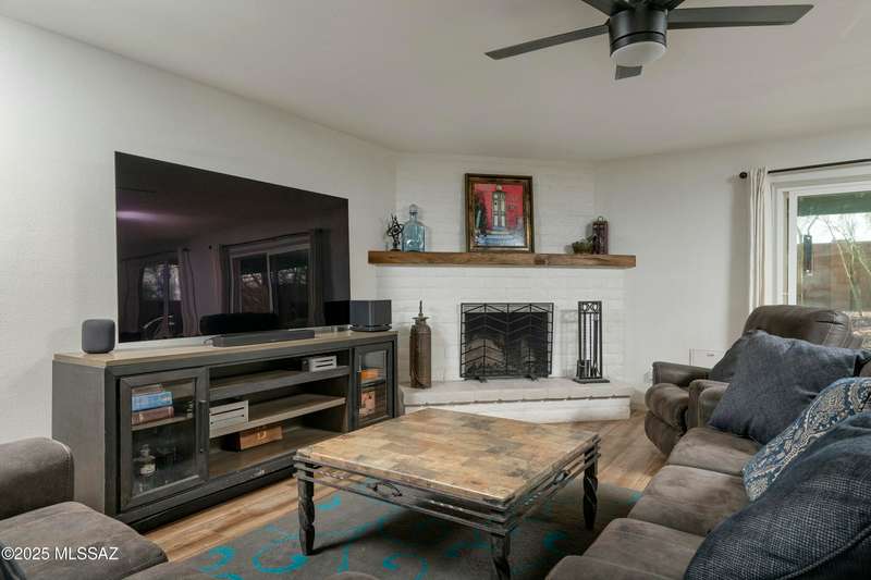Stunning 4 bed/2 bath, 2,075 sq ft home in Casas Adobes on a large lot with no HOA. Private lot w/ mountain views and located on a cul de sac. Completely remodeled with gorgeous vinyl flooring throughout. Enter to a large great room with a stunning kitchen featuring modern white cabinets and quartz countertops. Huge kitchen island with tasteful pendant lighting...the perfect space for entertaining. Great room features a cozy gas fireplace ideal for the colder Tucson nights. Primary suite with walk-in closet, tastefully remodeled bathroom and secret room for extra storage. Newer HVAC, hot water heater, and windows. Large laundry room and room off carport with tons of storage. This one is ready to go...just move in!