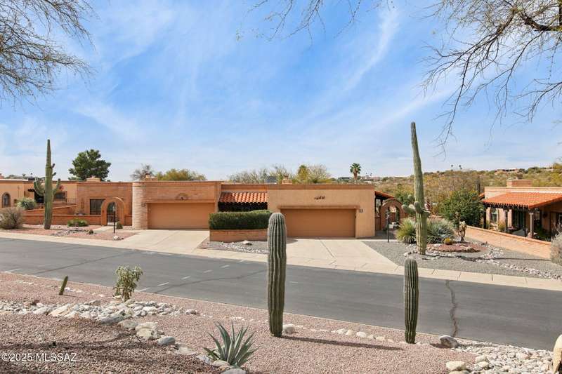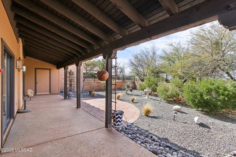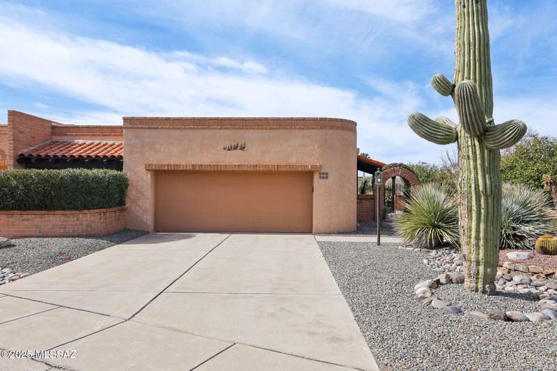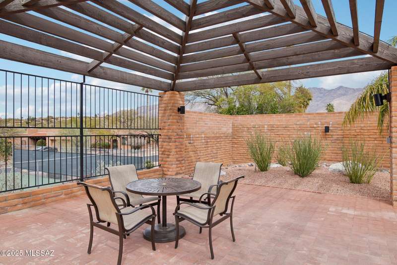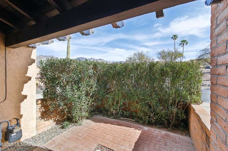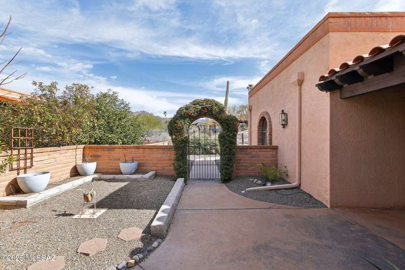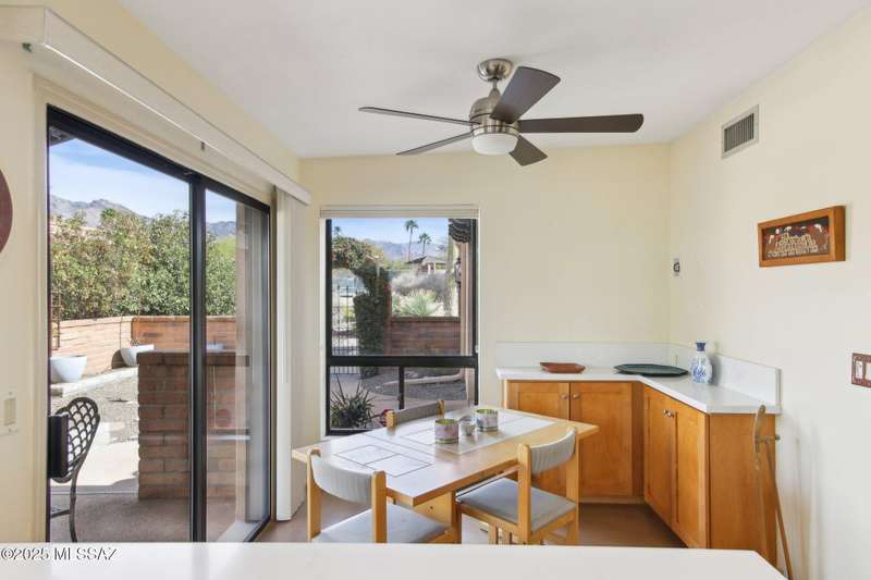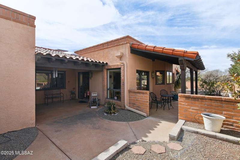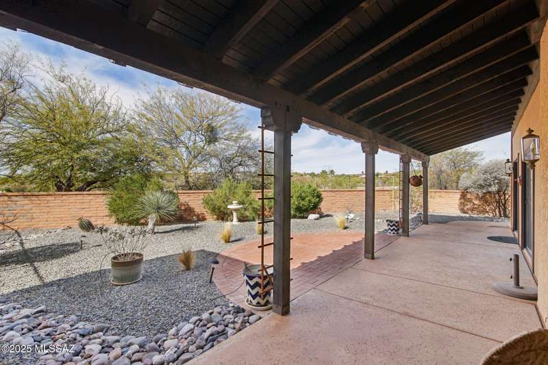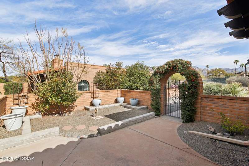 Southwest Desert Living at its finest! This beautifully maintained home offers stunning mountain and desert views, along with breathtaking sunsets and an unbeatable location. Featuring a modern, updated kitchen and bath with sleek fixtures and finishes, the home also boasts skylights and ceiling fans that enhance the airy, open atmosphere. The inviting beehive gas fireplace in the living room and multiple porch/patio areas create the perfect retreat for easy, peaceful living. The walled entry courtyard, side porch, rear porch, and low-care landscaping capture the essence of desert living. Ideally situated near the community pool, spa, and tennis courts, with easy access to shopping, medical services, and recreational areas, this home provides both convenience and tranquility.