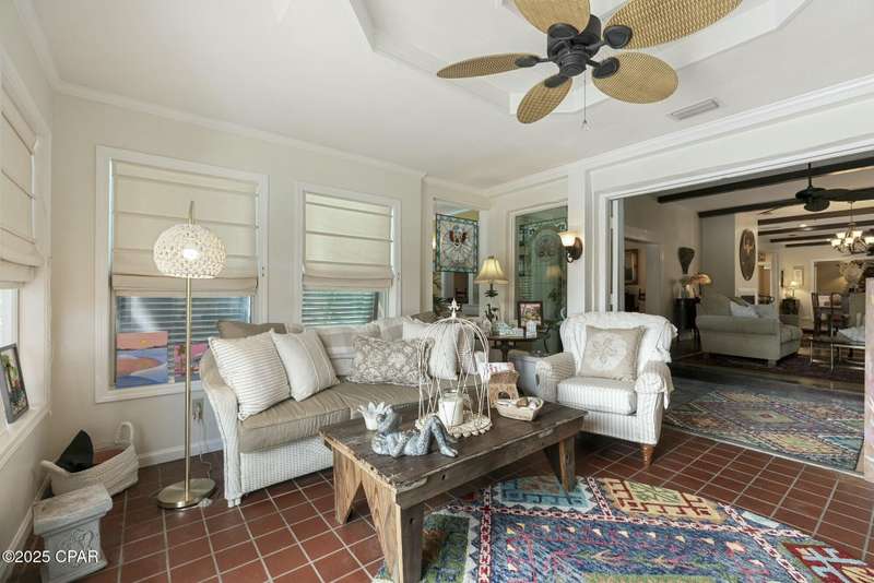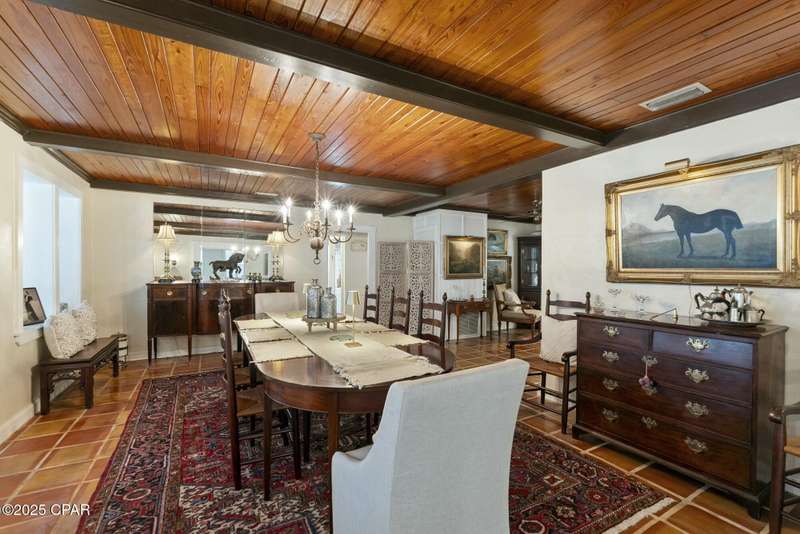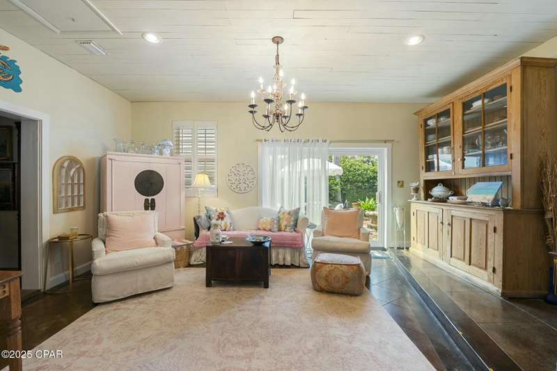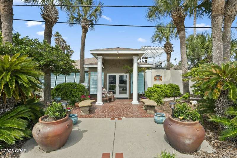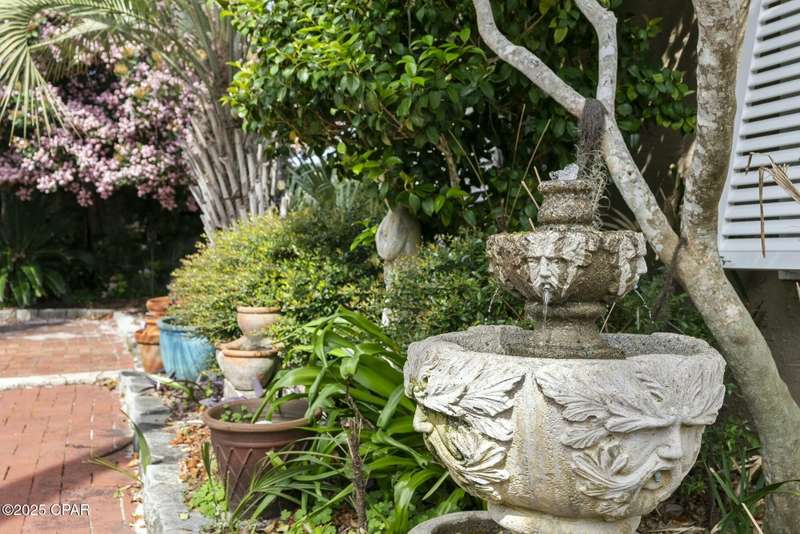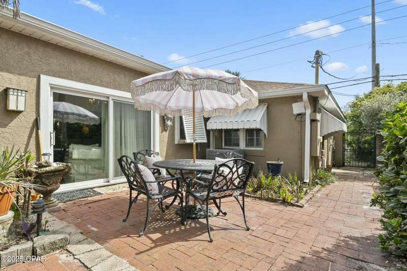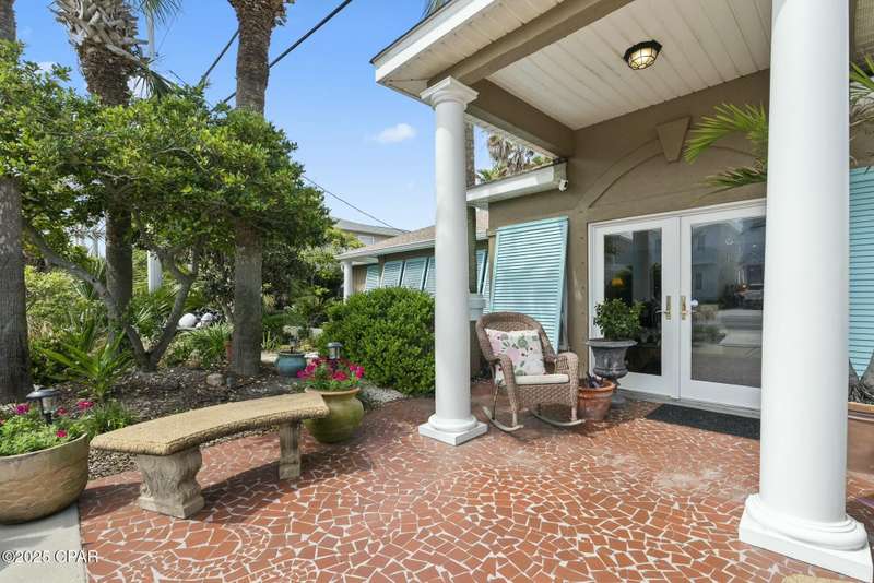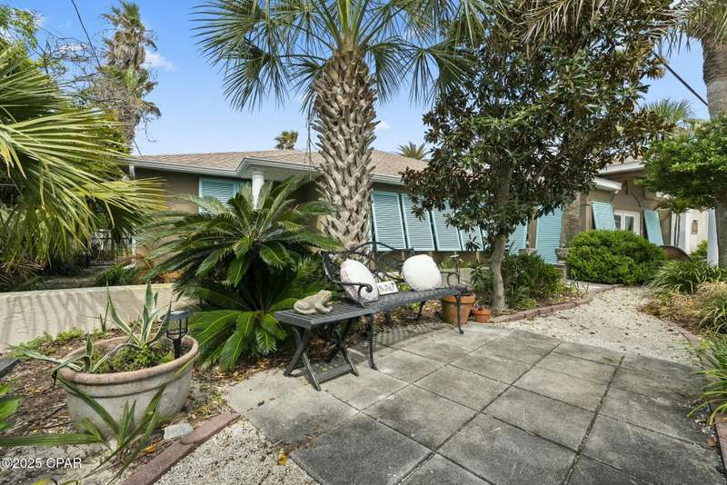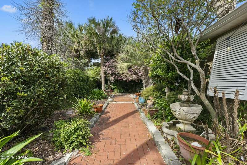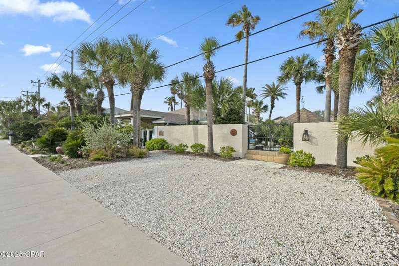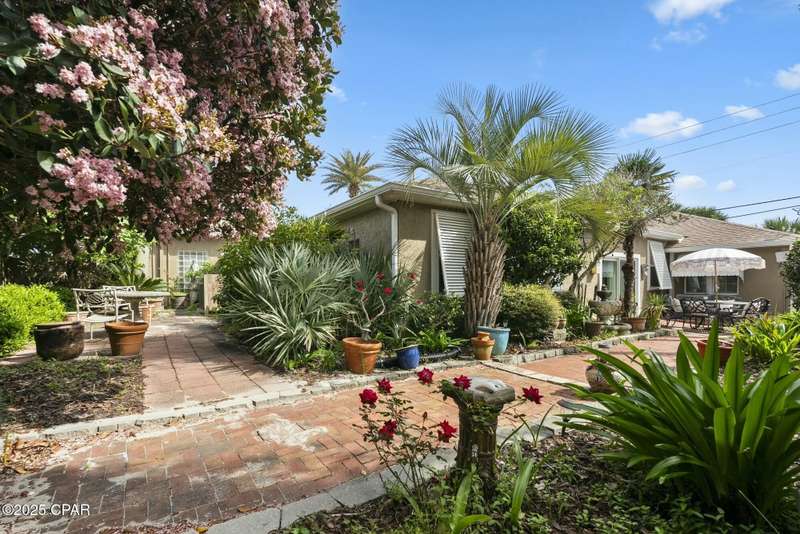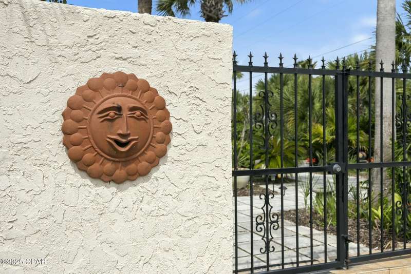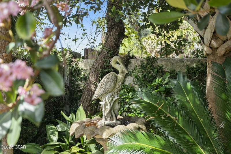 AVAILABLE to show 8/25 - 9/3. Step back in time to timeless coastal elegance at this true mid-century treasure. Built in 1952, this solid concrete block home is a beautifully preserved gem that blends vintage charm, historic character, and relaxed coastal living--just steps from the Gulf of Mexico. Rich in craftsmanship and soul, this six-bedroom, four-bathroom property is located in the highly sought-after Laguna Beach community and offers a rare opportunity to own a piece of Old Florida magic, directly across from Public Beach Access 80.This expansive, private coastal estate has been thoughtfully expanded to over 4,297 square feet and is quietly tucked behind lush garden walls, offering privacy and tranquility. Once inside the gates, you'll discover a world of its own, where tropical landscaping, cascading wisteria, and tranquil fountains surround an enchanting outdoor retreat. At the heart of it all lies a sparkling saltwater pool, a shaded gazebo, and a Gulf-view deck--perfect for everything from quiet mornings to sunset gatherings.The main residence features four bedrooms and three bathrooms, showcasing timeless mid-century architecture highlighted by original woodwork, tongue-and-groove ceilings, and elegant stamped concrete floors. Bright and airy interiors are filled with natural light and authentic character throughout. A formal sitting room, anchored by a grand piano, provides the perfect space for hosting elegant soirees or intimate evenings. Two front bedrooms share a charming retro-tiled hall bathroom, evoking a sense of nostalgia and classic design. Additionally, two spacious master suites, each with its own private ensuite bath, offer comfort and privacy for family or guests.Separated from the main home by a private entrance, the charming guest house offers two bedrooms and one full bathroom. This inviting space includes an open-concept kitchen and living area, in-unit laundry, and large sliding glass doors that open directly to the pool and gardens. With its own entrance and lockout capability, the guest house is ideal for visiting family, in-laws, vacation rentals, or use as a secluded home office.Every corner of this property is designed to inspire a deep connection to its surroundings--from sun-drenched mornings by the pool to candlelit dinners under the stars in the garden courtyard. Offered nearly fully furnished, the home is turn-key and filled with carefully curated touches that reflect timeless style and soulful elegance.Whether you're seeking a peaceful sanctuary, a multi-generational retreat, or an exceptional income-producing investment, this rare Laguna Beach estate offers unmatched flexibility, space, and charm--just steps from the sugar-white sands of the Gulf. This is more than just a home. It's a hidden world waiting to be discovered.
