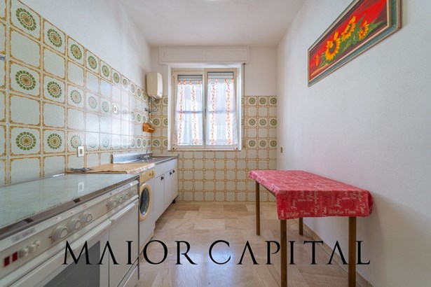 The kitchenette is separate from the living area—a rare and valuable detail for this type of property—and is further enriched by a convenient storage room/pantry, perfect for optimizing space.