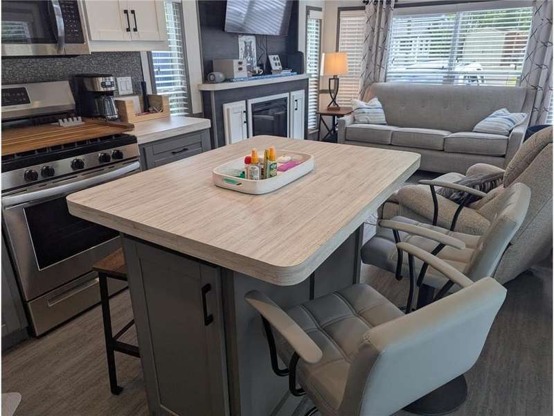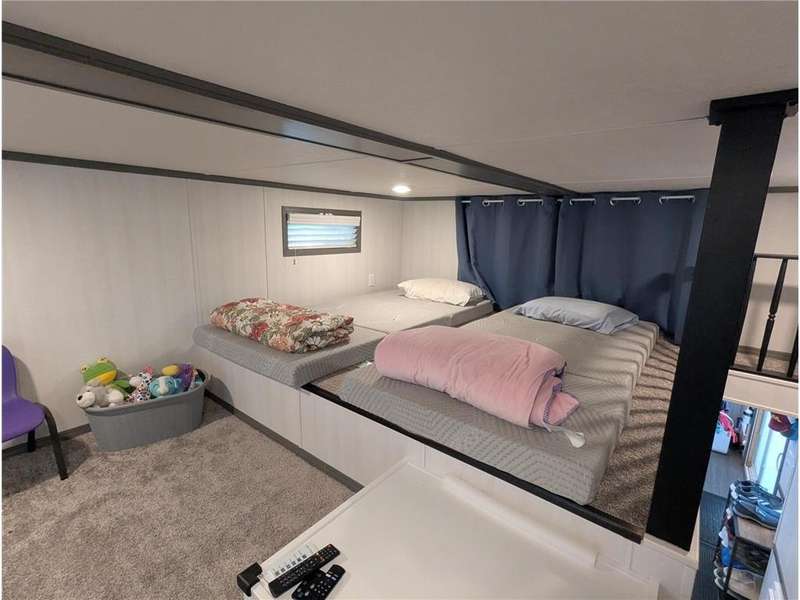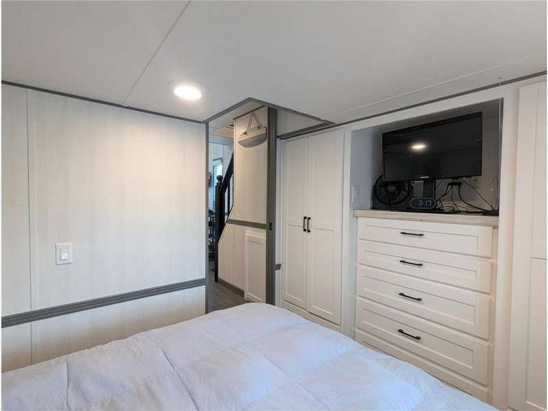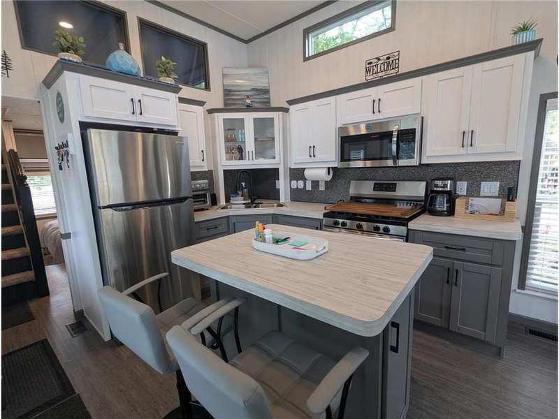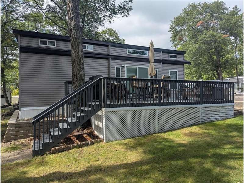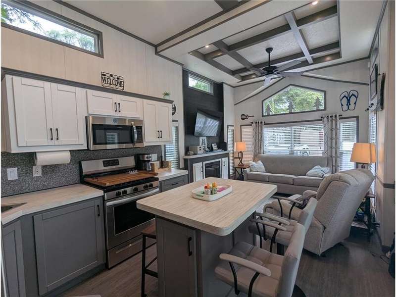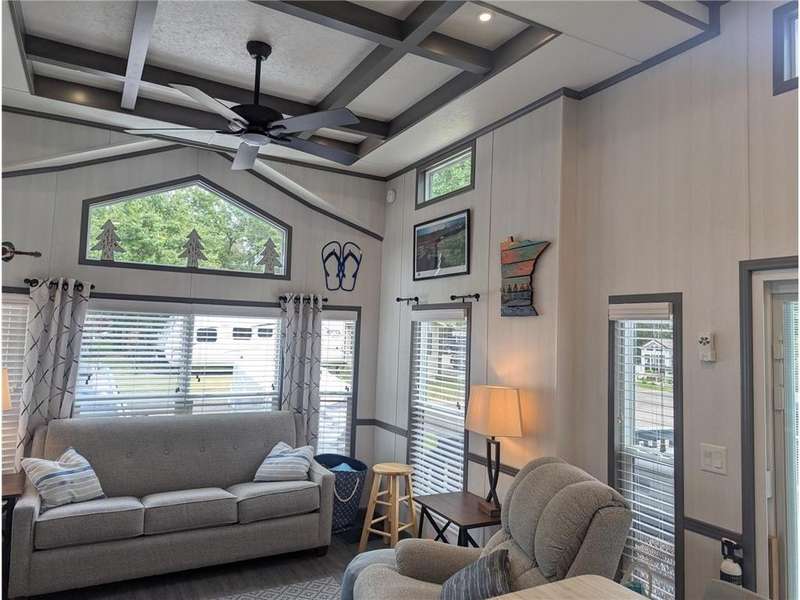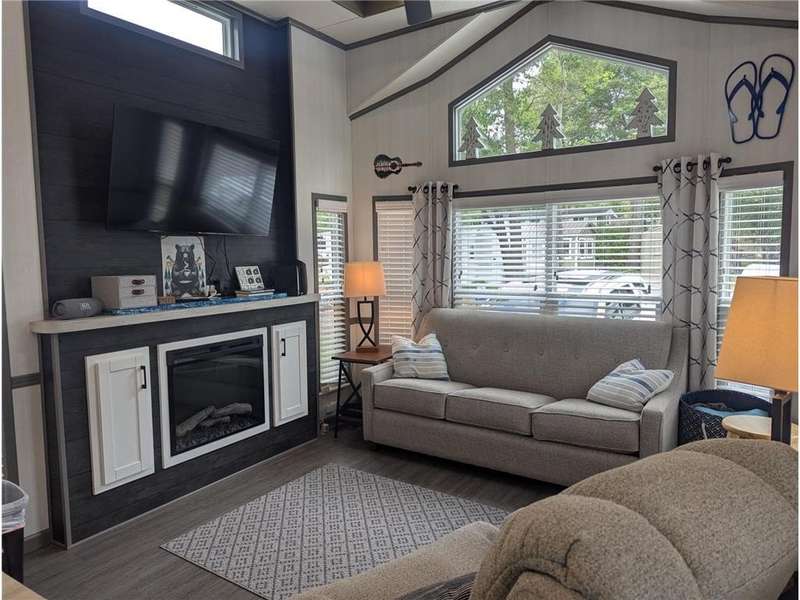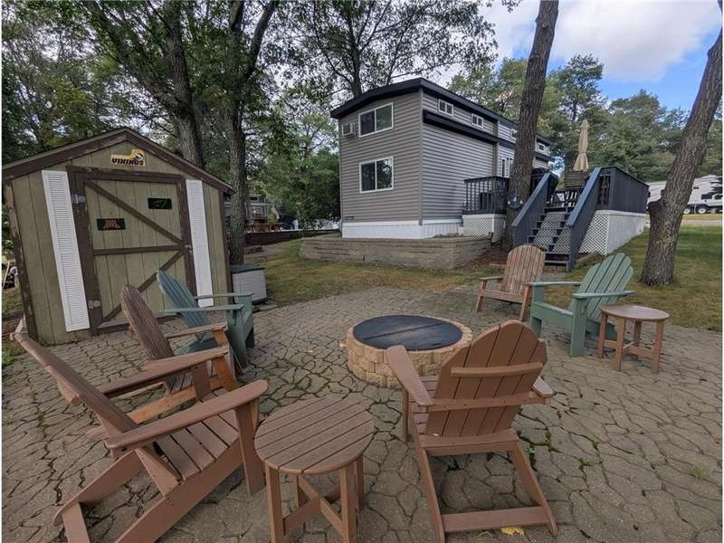 Exceptional, privately owned lot in Whitebirch RV & Camping Resort. Included with the lot: 2023 Woodlands Loft Shore Park Model, Large Wood Deck alongside Park Model, retaining wall has created a level Paver Patio Fire pit area, Storage Shed, 3 Deck Lockers and firewood. Lot is on the outside and overlooks the storage area that gratefully creates a nice breeze all summer long. Step onto the wood deck to maintenance free deck furniture (Loveseat, 2 chairs, coffee table, bistro table, umbrella and 4 bistro chairs, 2 barstools, round glass top table, grill and 2 deck lockers) Paver firepit area has 6 Adirondack chairs and 2 tables. Retaining wall was replaced in 2024. The main living area is open and bright, with plantation shutters throughout. Color palette is modern with grey/white tones, high ceilings, ceiling fan, windows up high for sunlight. Top of the line pullout sofa, recliner, flat screen TV over electric fireplace. The kitchen area has a warm and inviting layout, lots of storage, full-size stainless-steel appliances (microwave, range, and fridge), Eat-in kitchen island is the perfect size with 4 counter barstools. Continue down the hallway you’ll find a rare hallway built-in cabinet. Main bedroom is at the rear of Park Model and has a queen bed w/storage under, Built-ins have 2 full closets with lots of drawer storage and a Flat Screen TV. The roomy bathroom has a gorgeous built-in vanity, spacious shower and full-size commode. Ascend the hallway stairs to the “private” loft area with 4-foot ceiling height, curtains hide two windows that overlook the main living space. There are 3 memory foam sleeping pads, AC, fan, TV and closet to complete the loft. Hard to beat the beauty of this property,so call me for your private showing. Included in the sale: All furniture inside/outside, décor, pot, pans, silverware, gas lawn mower, battery powered weed whip and leaf blower, Seller will be taking personal items plus a small exclusion list. Shared amenities: Pools & Hot Tub, Showers/Changing Area & Coin Laundry in 2 Areas, Table Tennis, Volleyball, Pickle Ball Court, Horseshoes, Playground. Special Events are ongoing throughout the Summer Breezy Point Resort Shared Beach Access & Dock Use for 7 Days at a Time