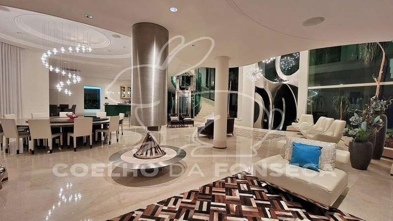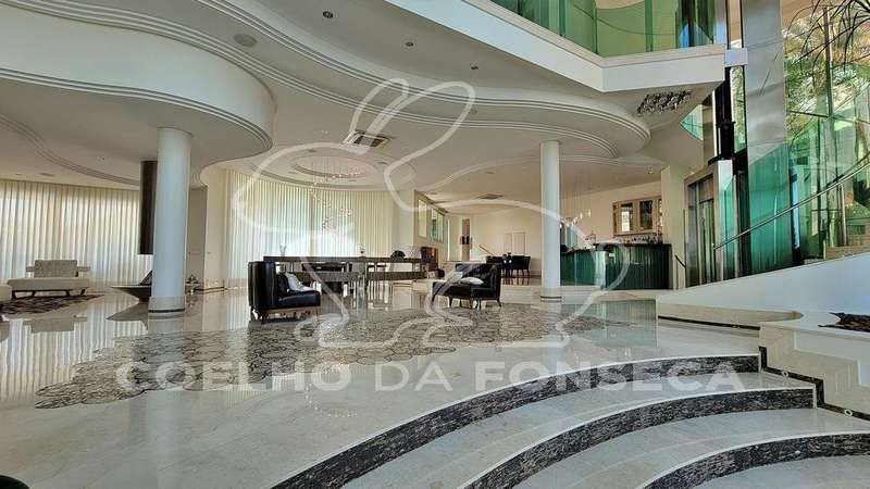No piso térreo possui living com pé direito duplo, cinema, sala de jantar, bar, academia, salão de beleza, sauna, banheiro para piscina, escritório, suíte para hospedes, 2 lavabos, cristaleira, cozinha, churrasqueira e forno de pizza, lavanderia apoio