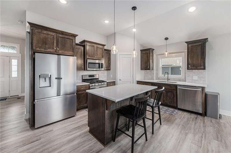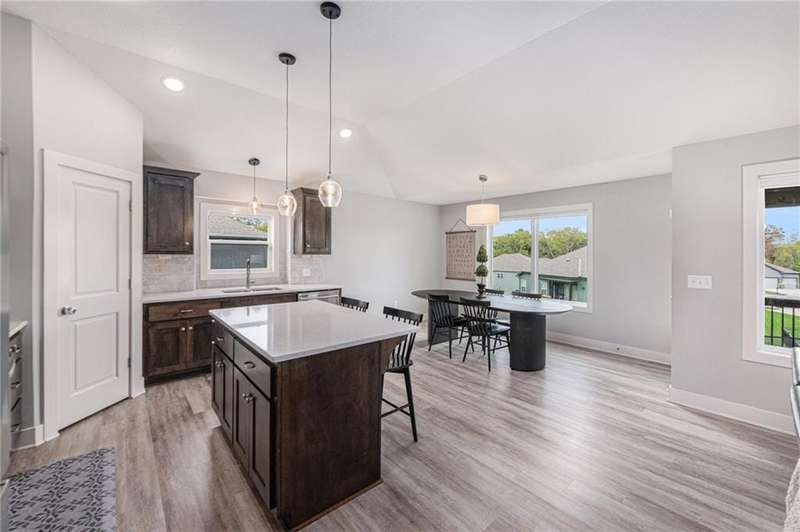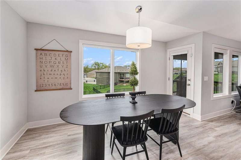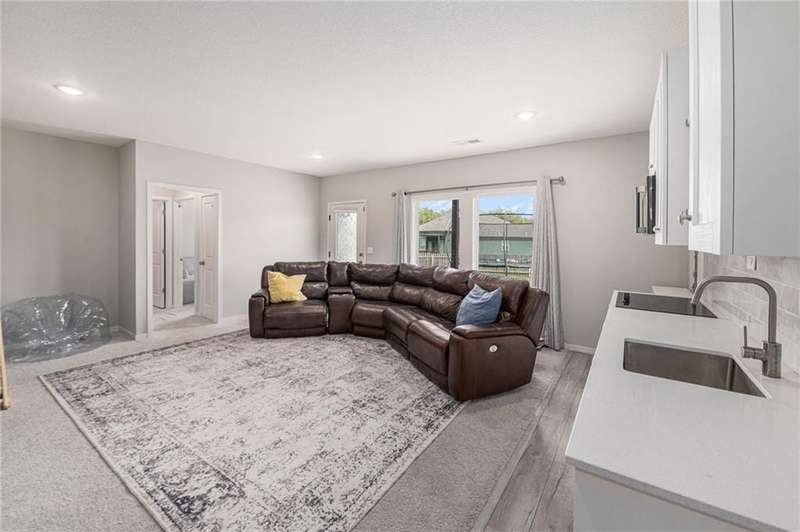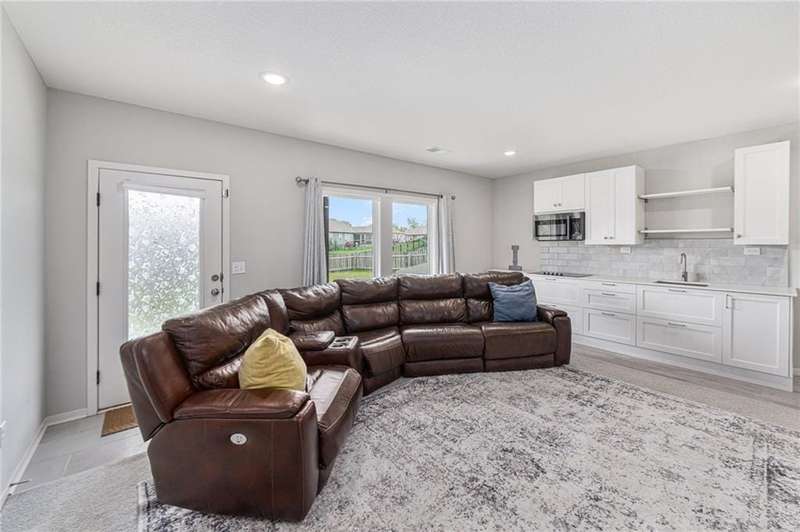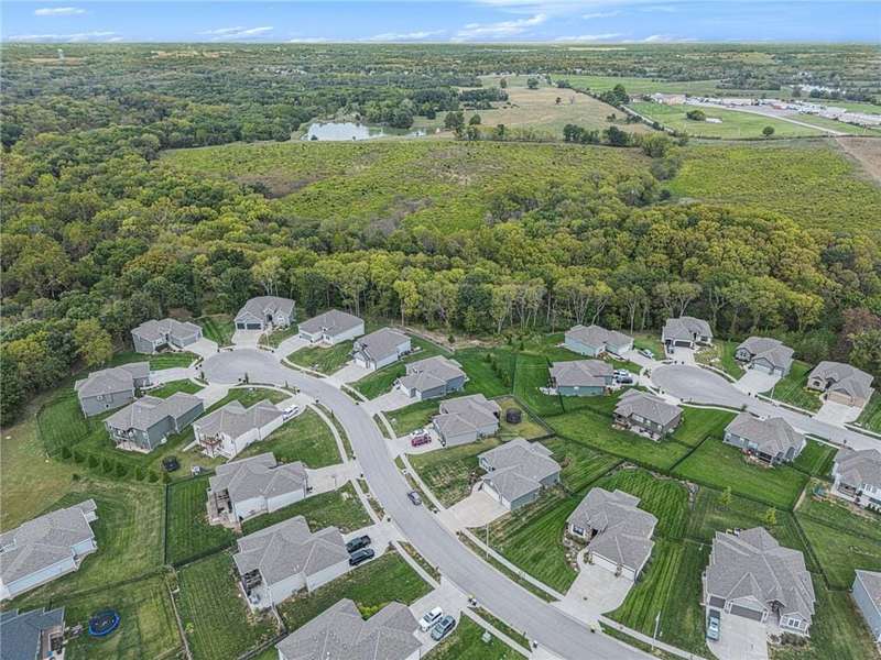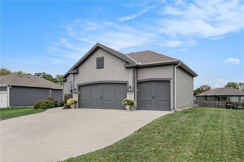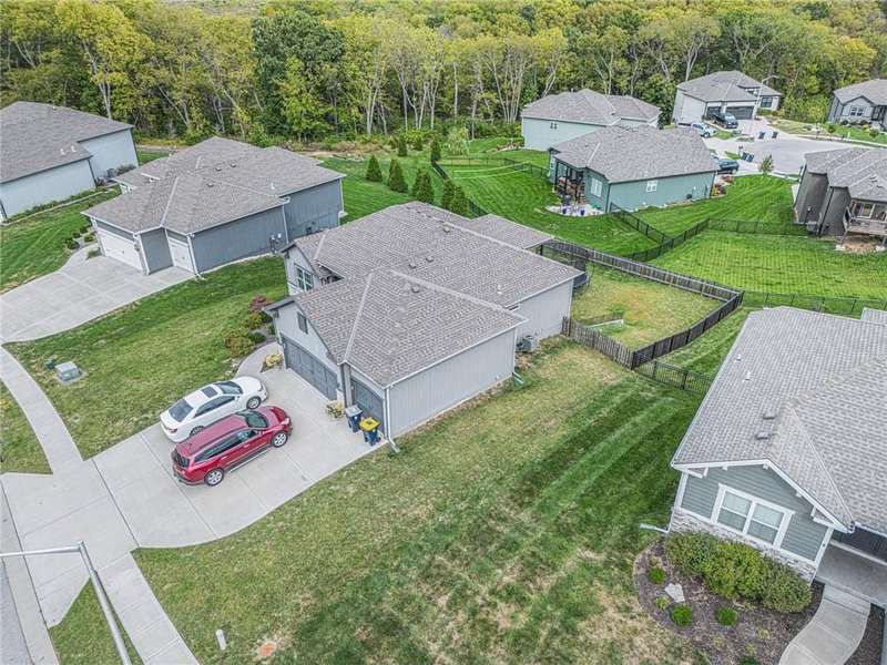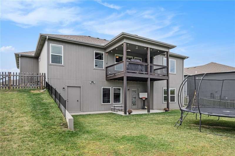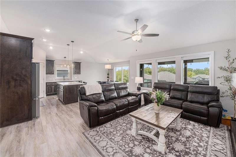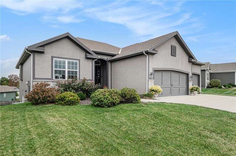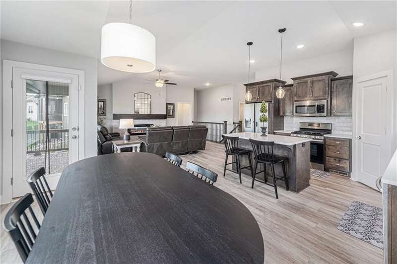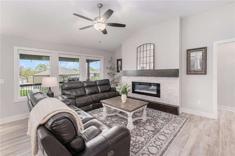 This beautiful 4 bedroom, 3 bath reverse 1.5 story home, offers over 2,900 sq ft of finished living space in a desirable Woodland Creek neighborhood with a community pool. The open concept main level features a spacious living room with a gas fireplace and plenty of natural light. The modern kitchen includes quartz counters, custom cabinets, a large island, walk-in pantry, gas stove, and stainless steel appliances. Adjacent to the kitchen is an eat-in area with access to a covered back deck that is perfect for relaxing or entertaining. The master suite on the main floor includes a tray ceiling, large walk-in closet, and private bath with dual sinks and a walk-in shower. Also on the main level are a second bedroom, full bath, and laundry room. The finished walkout lower level adds two more bedrooms, a full bath, a second kitchen area with laundry hookups, and flexible living space with access to a fenced backyard and patio that is ideal for kids, pets, or outdoor fun. A spacious 3 car garage and extra storage space complete this move-in ready home.Located in a highly sought-after neighborhood with easy access to shopping, dining, parks, top-rated Smithville schools, and just minutes from Smithville Lake and bike trails, this home combines comfort, style, and convenience. Dont miss your chance to see it!