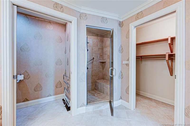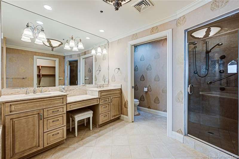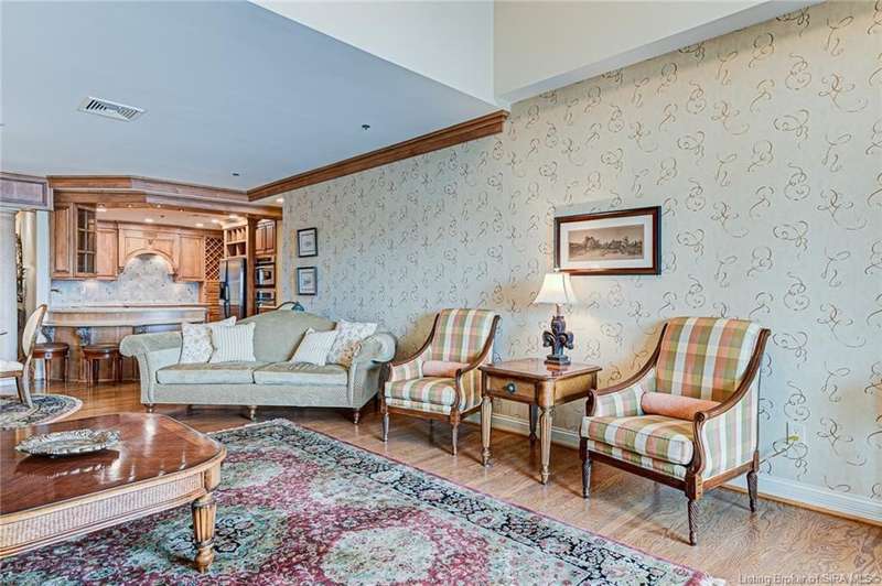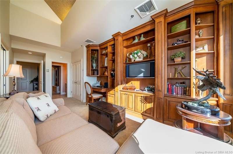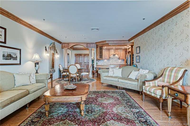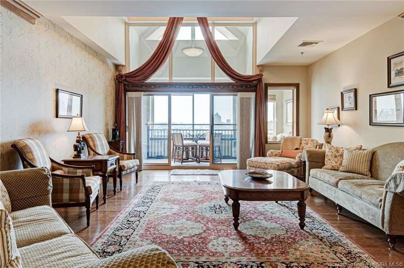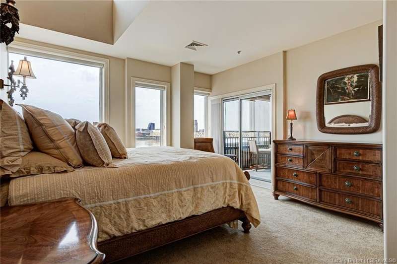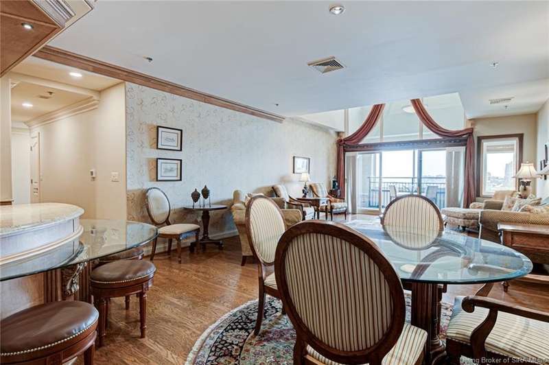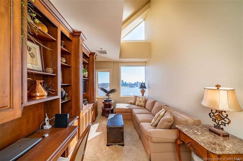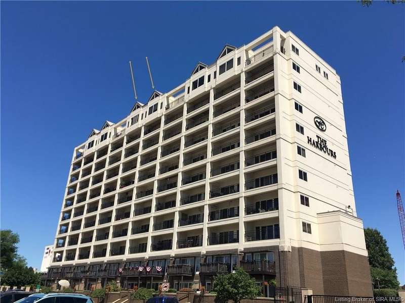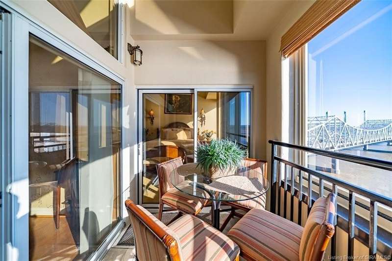 Welcome to THE HARBOURS PENTHOUSE 1112 - This sought-after community offers an unparalleled lifestyle with its blend of luxury, convenience & stunning view of the Ohio River & Louisville Skyline. The open living area has vaulted ceilings only in Penthouses. Hardwood floors flow through foyer (w/inlaid marble), living, dining, kitchen & hallway. The living room opens to an enclosed balcony w/sliding window allowing 4 season use. Look East in the evening & enjoy the LED lights on the Big Four Walking Bridge. The kitchen has abundant custom cabinets, separate cooktop, wall oven, GE Advantium Microwave, warming drawer all in Stainless Steel. The Primary bedroom is set up to focus on the view, vaulted ceiling & has access to the patio. The primary bath features a walk-in shower w/ multiple shower heads, soaker tub, double vanities, water closet & walk-in closet. The Primary has a den w/custom built-ins, vaulted ceiling & can also serve as a 3rd guest room. The 2nd bedroom shares a Jack-n-Jill bath w/the den & 3rd bedroom. Each bedroom has its own vanity & share a tub/shower. Bonus half-bath. Deeded parking 361 &362. HVAC & Water Heaters 2022. Prime location for Thunder Over Louisville, neighboring multiple restaurants. Harbours is a premier property with gated entries, fitness center, indoor & outdoor pools, grills on-site, patio/gazebo areas. Monthly HOA covers amenities, cable, high speed internet, HBO, Showtime, water, sewer, trash water softner & master insurance.