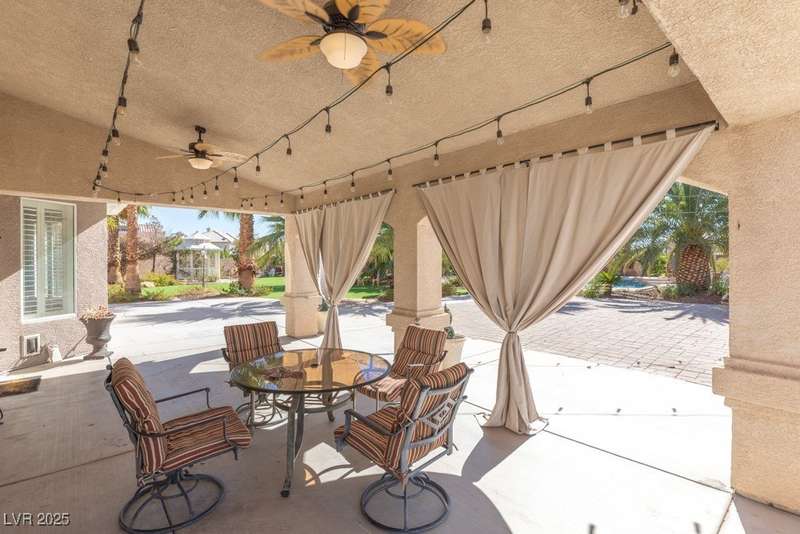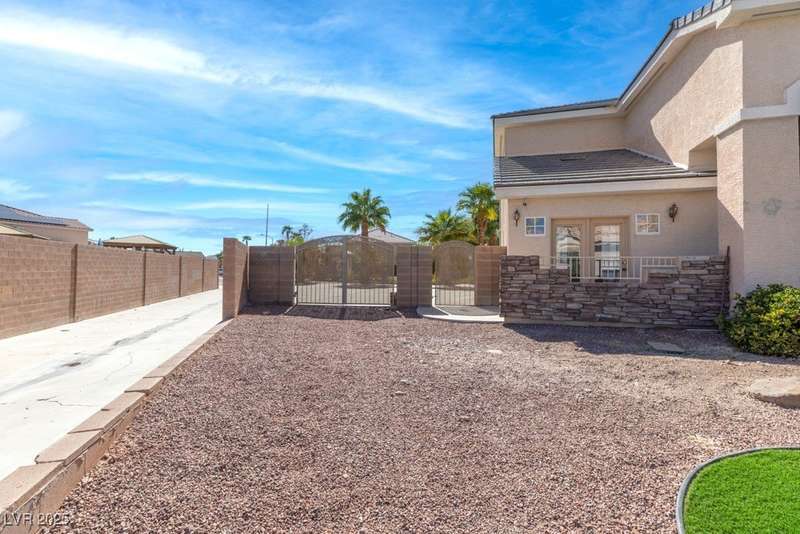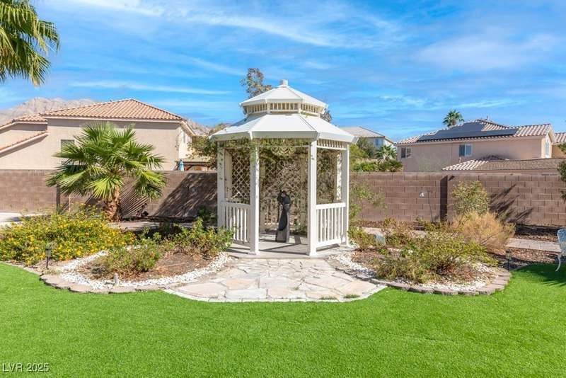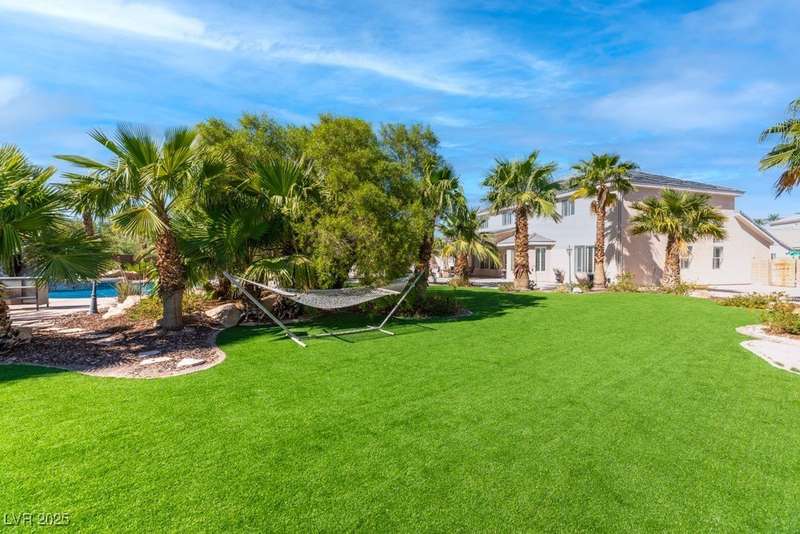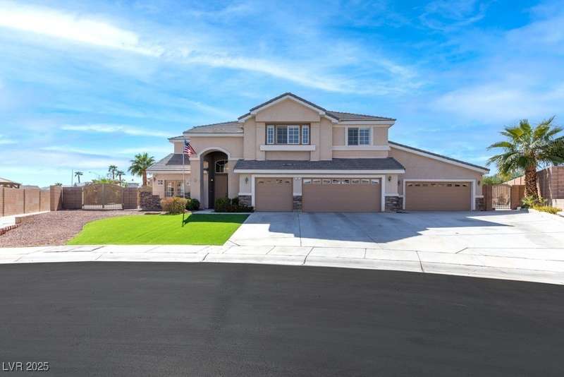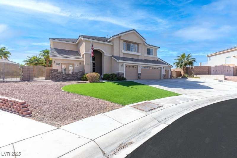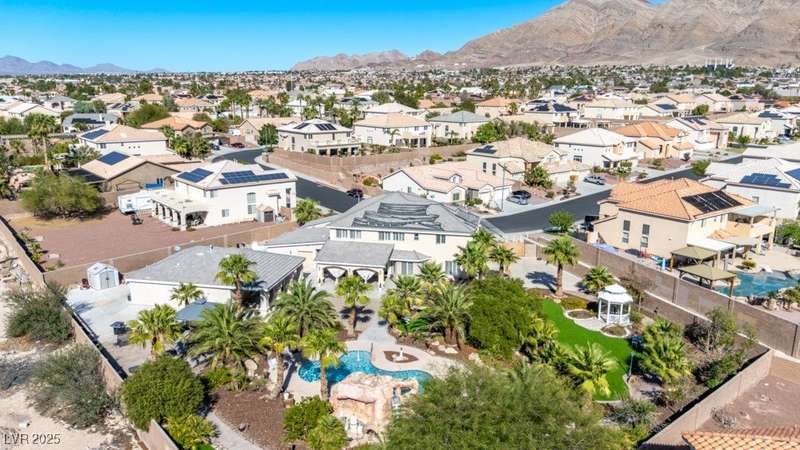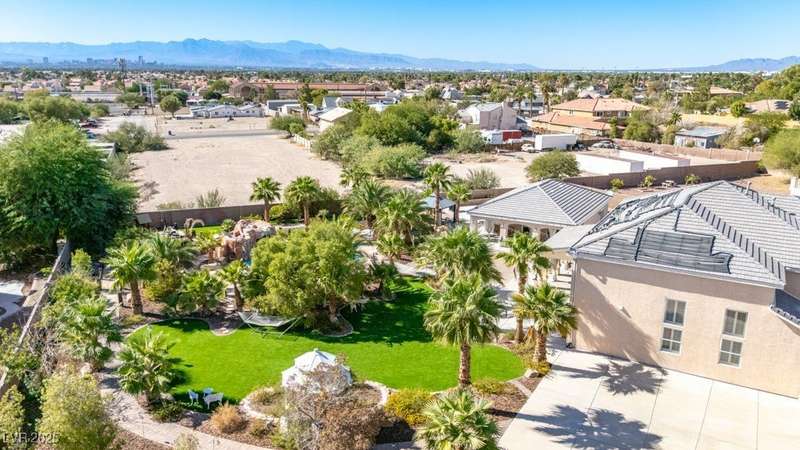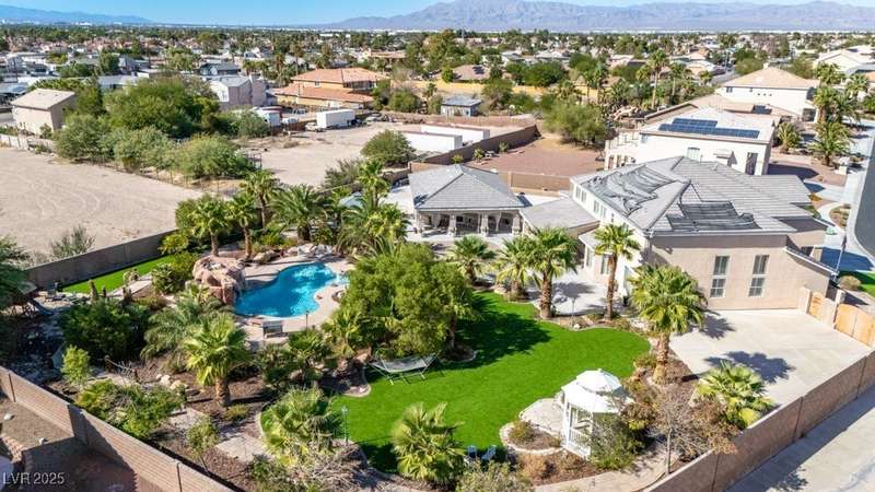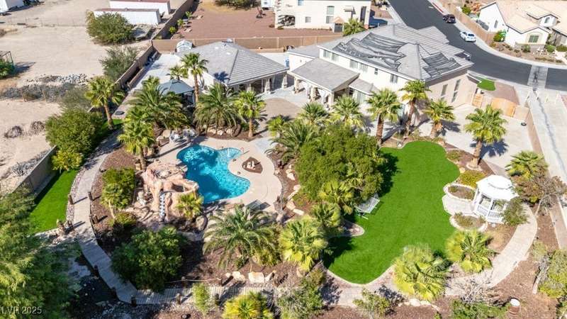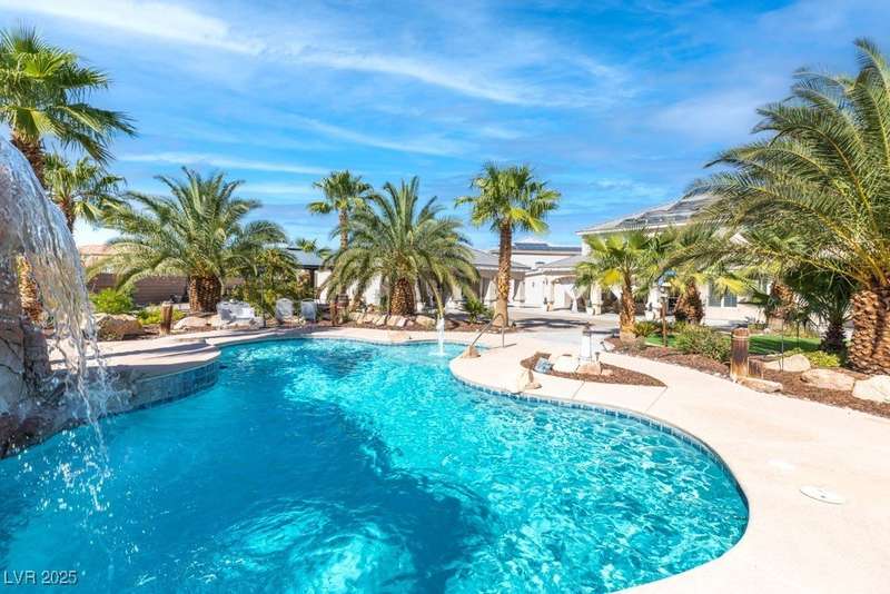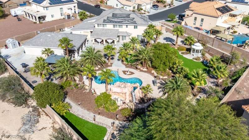 Rare near-1 acre lot with incredible Strip and city views. This property sits on a an oversized pie-shaped corner lot (the largest in the subdivision) and offers everything for true entertaining living. The main house features 6 bedrooms, an open floor plan, plantation shutters, stainless steel appliances, and a large primary suite with a walk-in shower. The separate full-size guest house is ideal for visitors or a mother-in-law suite and includes its own full kitchen, family room, bedroom, and laundry area. Outside, enjoy huge covered patios, light-up gazebos, and a stunning backyard with a waterfall, private cave, and low-maintenance turf. There’s also a massive 5-car garage, RV and boat parking with plenty of room to spare, and open space for entertaining. Sprawling backyard with low-maintenance good looking turf, multiple sitting areas, pool and spa. Rare combination of modern, newer style construction with a very large lot size. Come make this beautiful estate yours today!