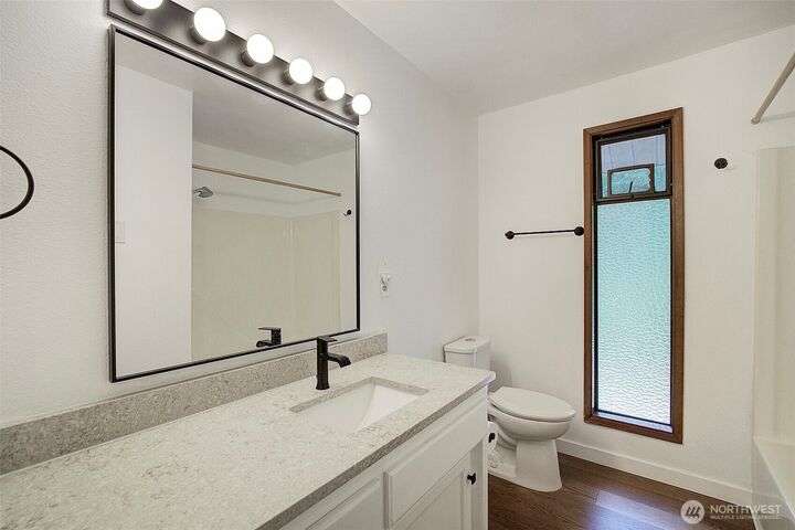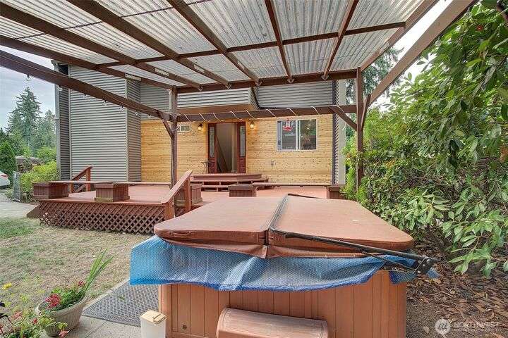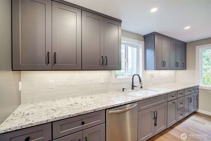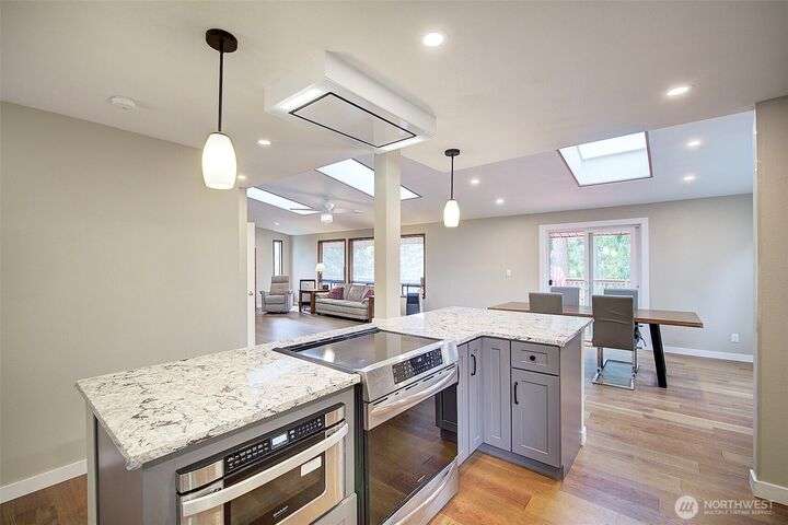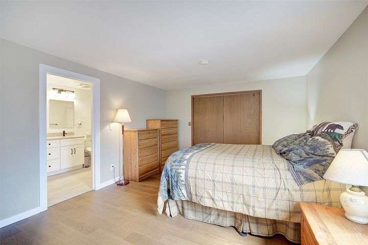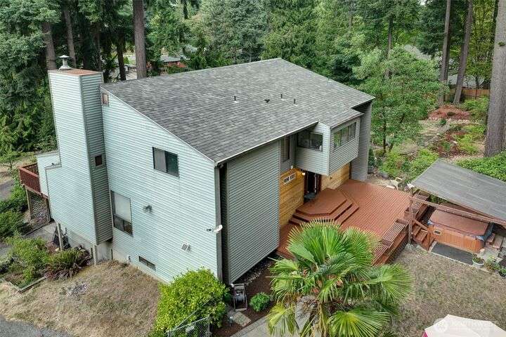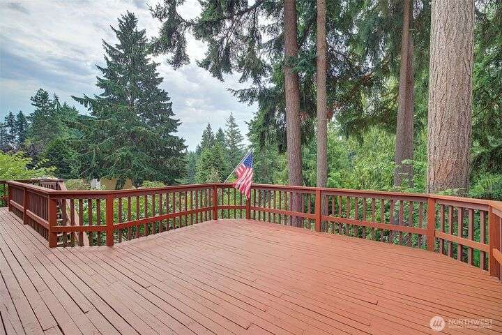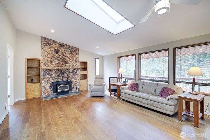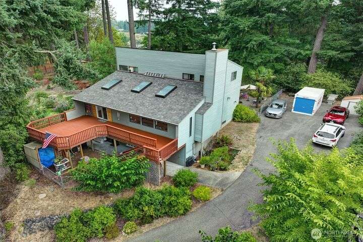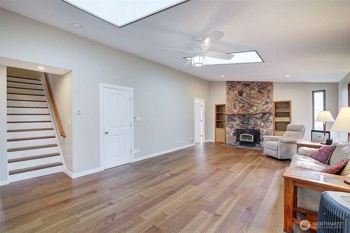 Beautifully remodeled Lake Tapps home on private half-acre backing to a greenbelt! The main floor features a spacious primary suite w/ a 3/4 bath w/ heated floors & a walk in tile shower. Completely updated main floor. kit w/quartz counters, stainless appliances,& beautiful hdwd floors, plus a bright din & liv area w/ vaulted ceilings, skylights,& a cozy fireplace, fresh interior paint and new carpet. Upstairs offers 2 bdrms & a den/office, the daylight basement adds a bedroom, fam rm, flex space, & ¾ bath. Enjoy fresh finishes throughout, mature trees,& plenty of room to live, work, and entertain in this move-in-ready home has portable a/c units. HOA dues includes access to 3 parks including boat launch.Complete main floor remodel in 2023.