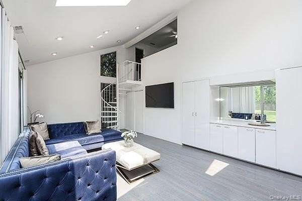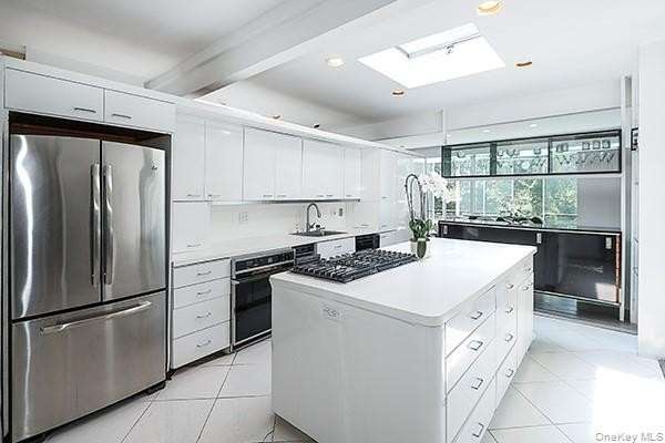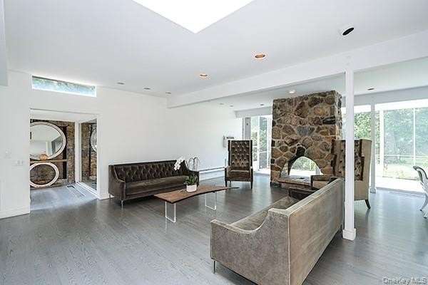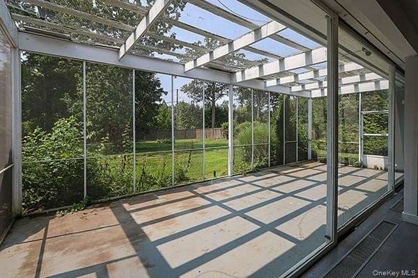 Exquisite Sun-Drenched Contemporary Ranch in the Heart of Kings Point Built by award-winning architect George Nemeni, this stunning home sits on a flat, meticulously manicured property and offers the perfect blend of elegance and comfort. The main level features a spacious primary suite with full bath, three additional bedrooms, and two full baths. The sun-filled living room with fireplace opens to a private dining room with floor-to-ceiling windows, leading to a glass-enclosed sunroom and backyard. The gourmet kitchen boasts a wide center island, white cabinetry, stainless steel appliances, and ample storage, flowing seamlessly into a large den with wet bar, oversized windows, and sliding doors to the pool and patio. A staircase from the den leads to a versatile upstairs office and storage space. Laundry room conveniently located off kitchen. Outdoors, enjoy a built-in gas grill, lush landscaping, and a pristine in-ground pool. Additional highlights include exceptionally low taxes and a prime Kings Point location.