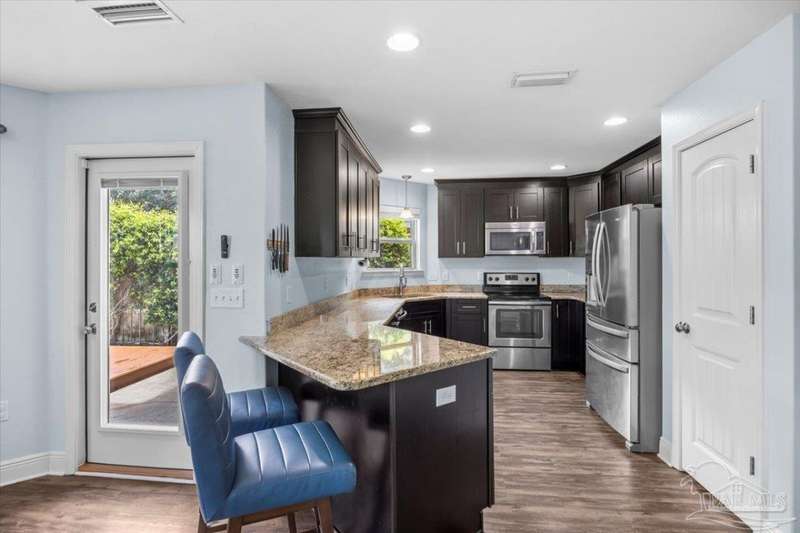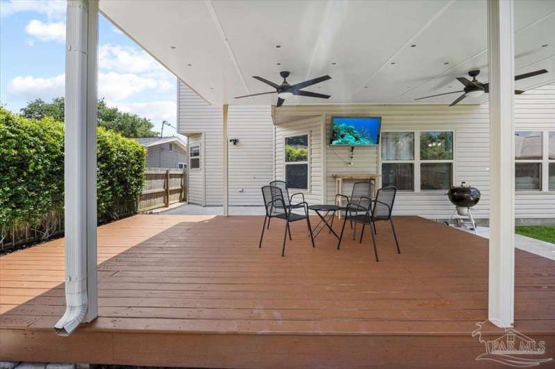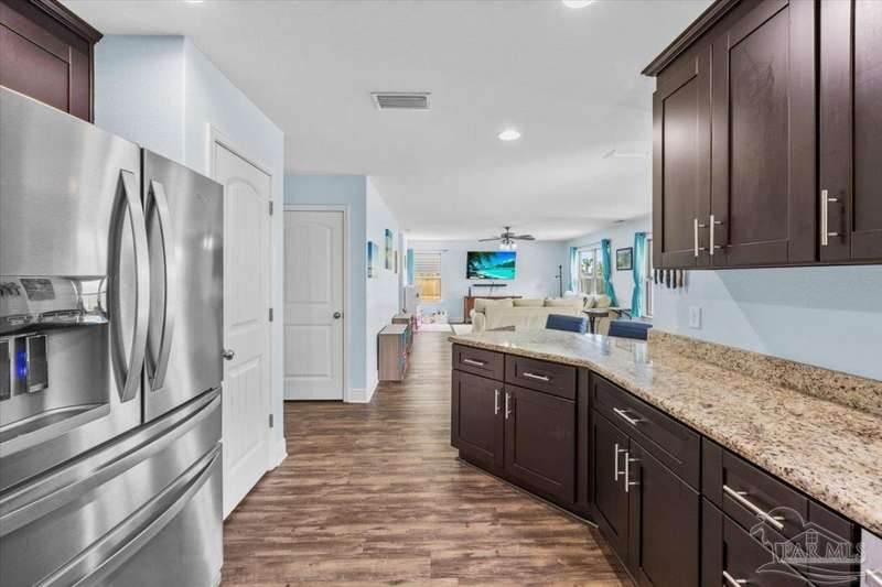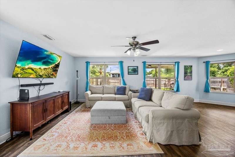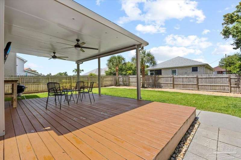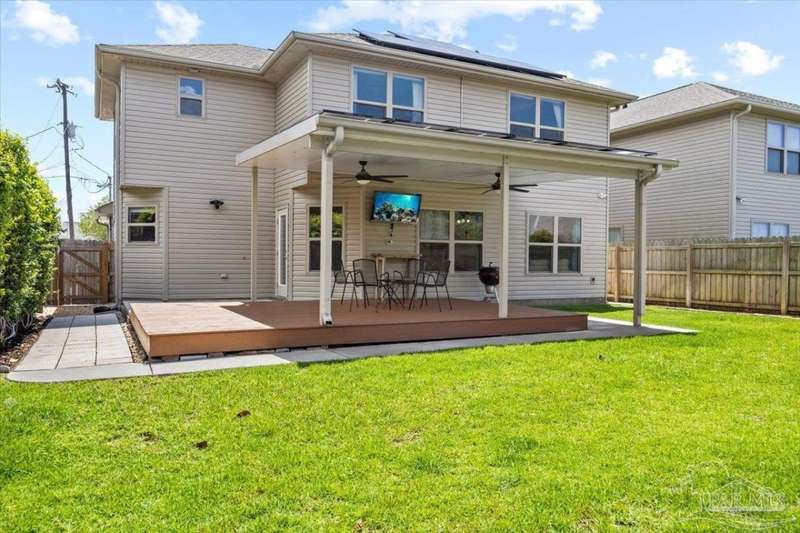 SELLER ASSISTED CLOSING COSTS | LOW RATE VA ASSUMABLE LOAN AVAILABLE FOR QUALIFIED BUYERS | PAID-OFF SOLAR PANELS!!! Welcome to your ideal coastal retreat! This beautifully maintained 3-bedroom, 2.5-bath home offers over 1,730 sq ft of thoughtfully designed living space, combining modern comfort with energy efficiency. Inside, you'll find a bright, open floor plan enhanced by luxury vinyl plank flooring, granite countertops, and stainless steel appliances-perfect for both everyday living and entertaining. The spacious main living area flows effortlessly, while the low-e vinyl windows with fabric storm shields provide peace of mind and lower energy costs. Step outside to a generously sized backyard featuring a patio and deck, ideal for BBQs, relaxing evenings, or morning coffee. Energy savings abound with a fully paid-off solar panel system (installed in 2019)-keeping average electric bills under $30/month. Major systems have also been updated with a new HVAC condenser and new water heater, offering years of low-maintenance living. Located in a quiet, established neighborhood, this home offers easy access to Perdido Key Beach, Johnson Beach, the Intracoastal Waterway, parks, boat launches, and NAS Pensacola-making it a perfect fit for military families or anyone seeking a relaxed coastal lifestyle close to everyday conveniences.