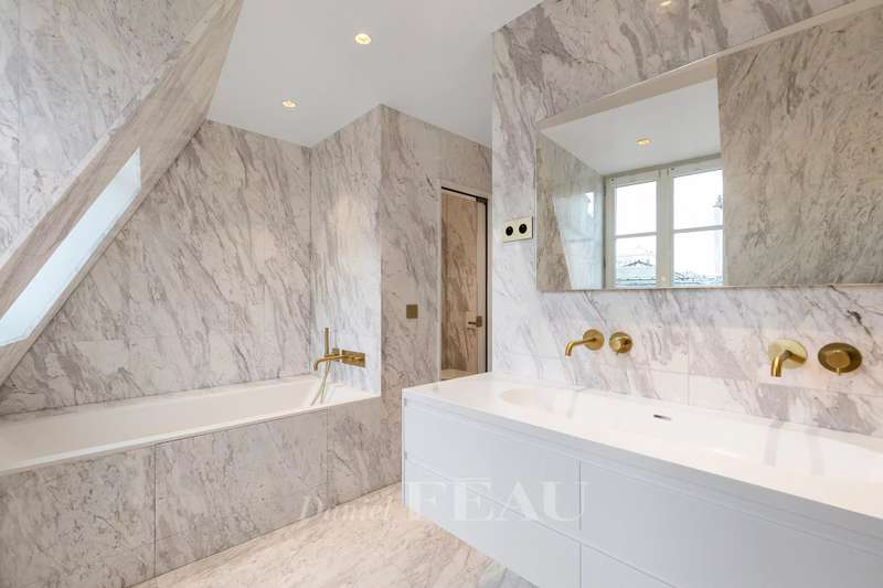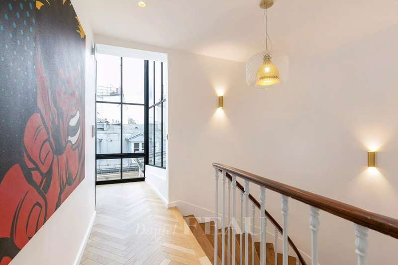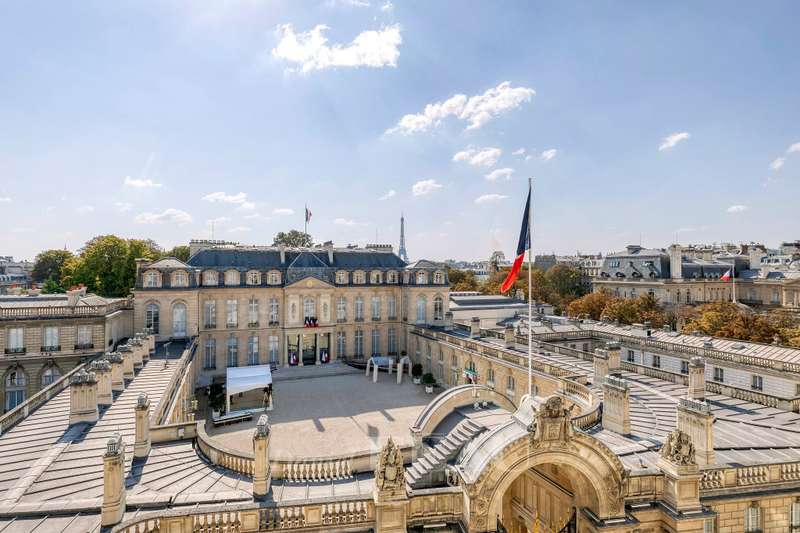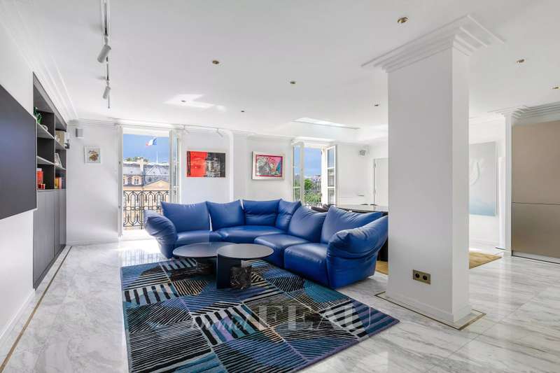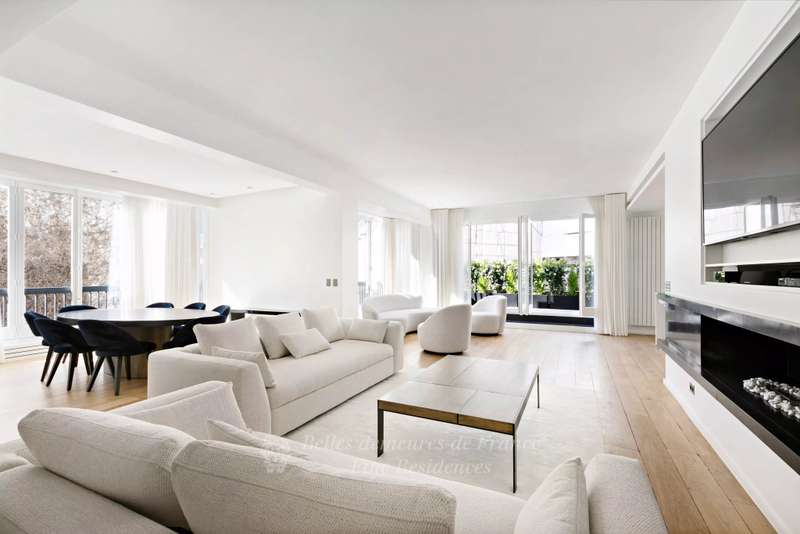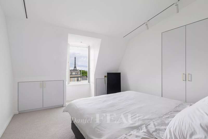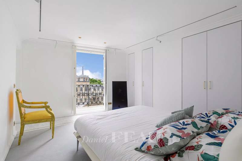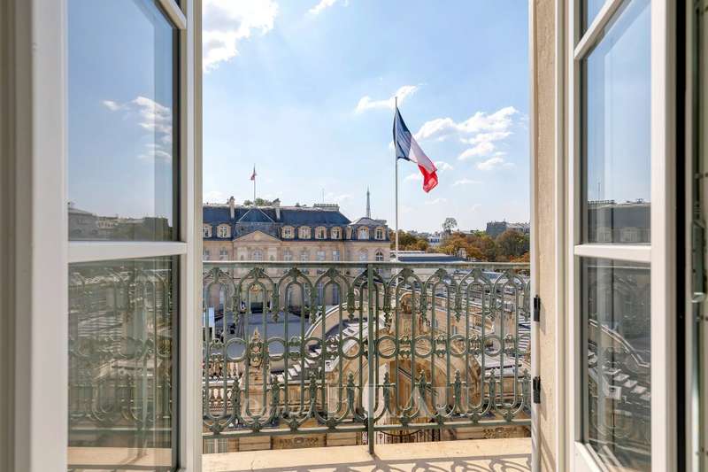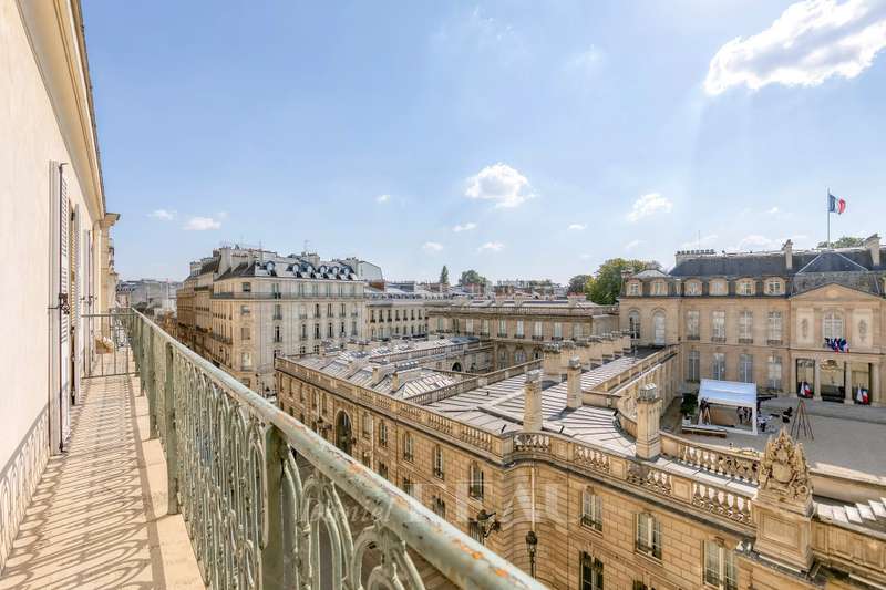 This south-west facing apartment on the top two floors of a secure 19th century building commands a stunning view of the Elysée Palace and the Eiffel Tower. 225 sqm of air-conditioned floor space and 206 sqm of living space as defined by the Carrez Law includes a double living/reception room opening onto a balcony, an open-plan kitchen, three suites with a bathroom/wc, a study with a skylight, a dressing room, a guest wc and a utility room. The apartment has been renovated in a tasteful contemporary style. With two cellars.