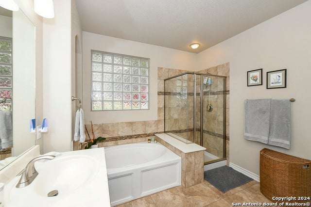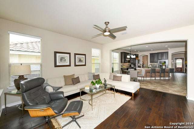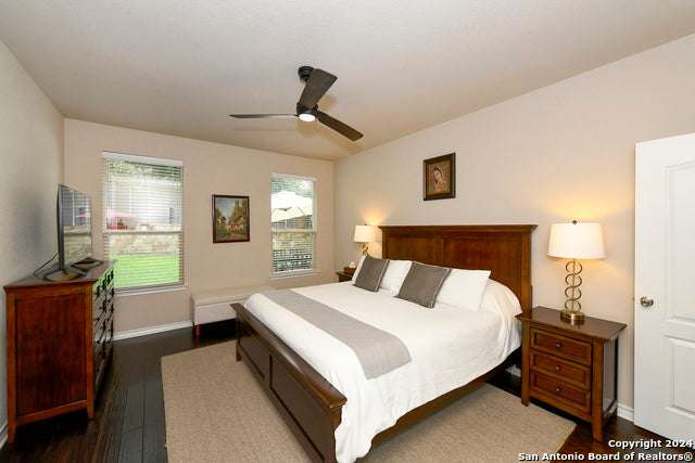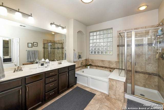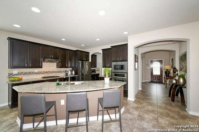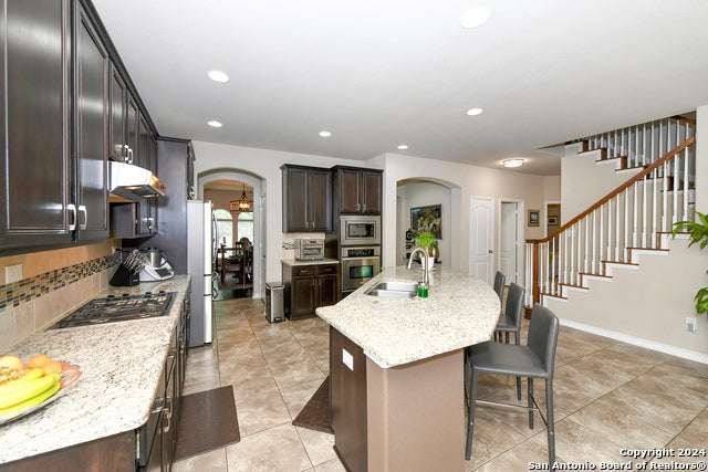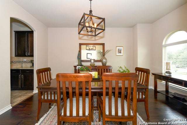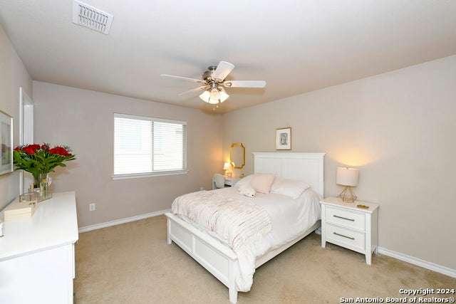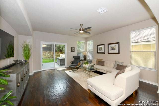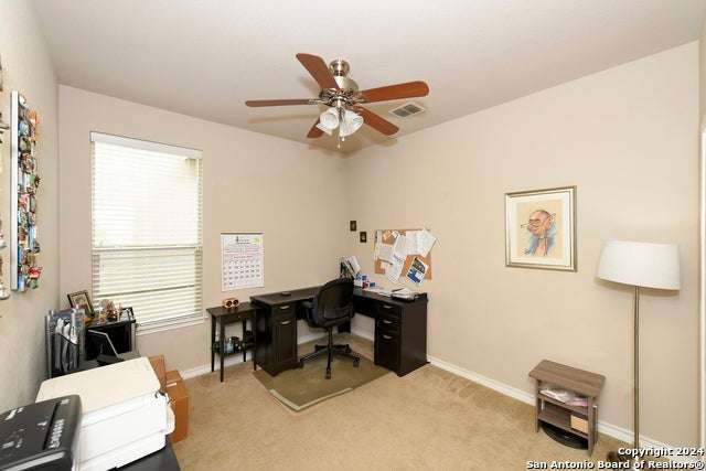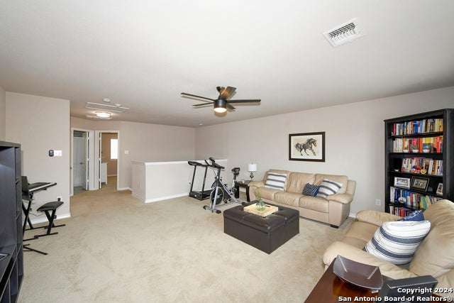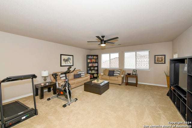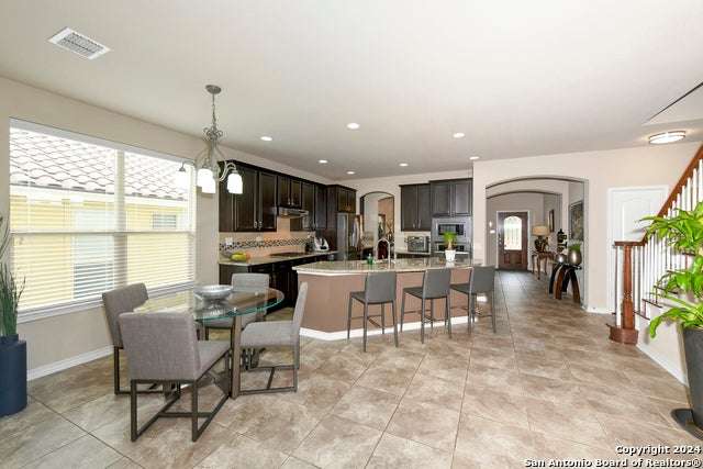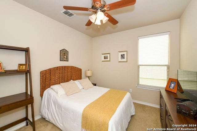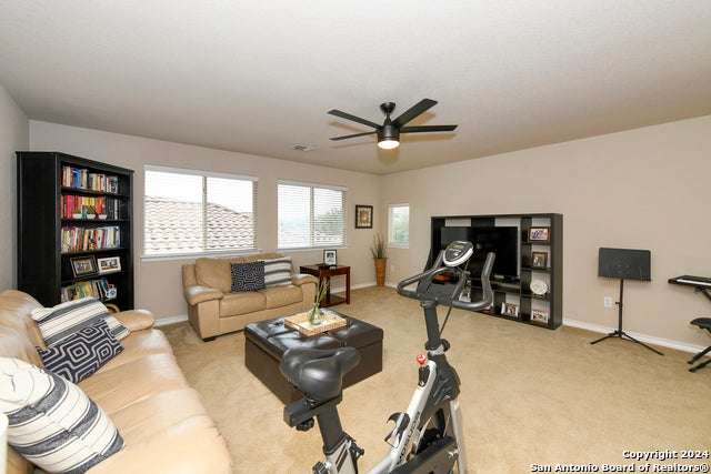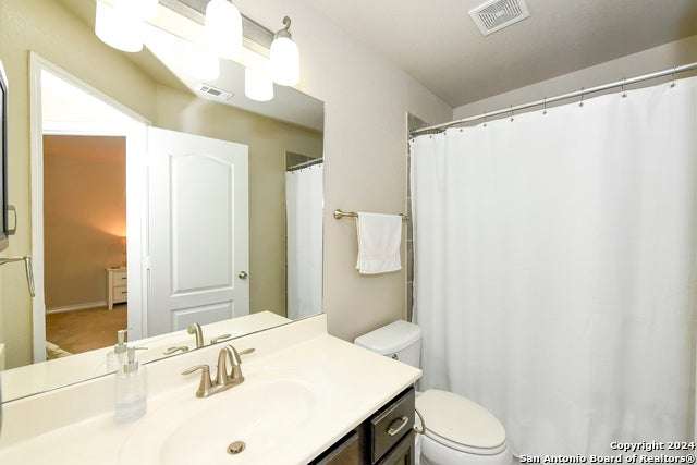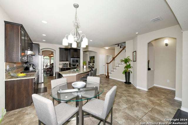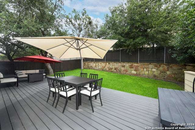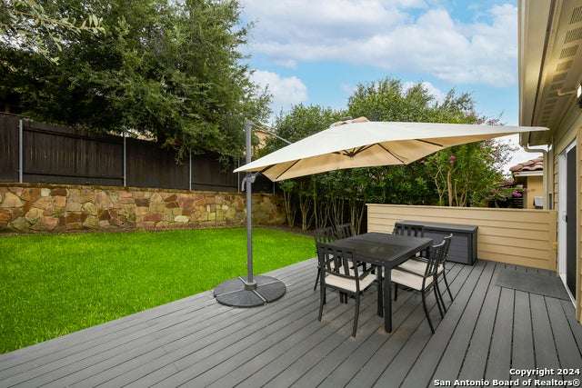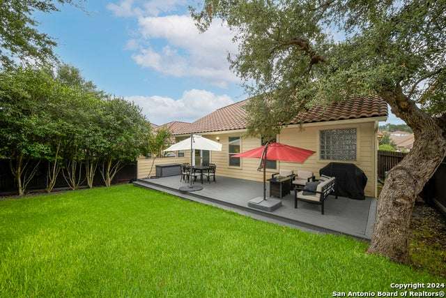 This meticulously maintained home features a desirable open floor plan and numerous upgrades. The main level boasts new flooring and an opened wall between the dining room and kitchen with an oversized island, stainless steel appliances, gas cooktop, and wall oven. Upgrades include a new deck (2022), sliding glass door (2022), attic AC unit (2024), gutters & backyard grass (2022), and modern light fixtures. Two bedrooms downstairs are separate from the primary suite, which features dual vanities, a garden tub, separate shower, and walk-in closets. The third bedroom and loft upstairs offer extra space for guests or an in-law suite. Additional features include a private study, owned water softener, and conveyable washer/dryer. The home is conveniently located near 1604, IH-10, La Cantera, and The Rim, and includes community amenities such as controlled access, a pool, park, and jogging trails.