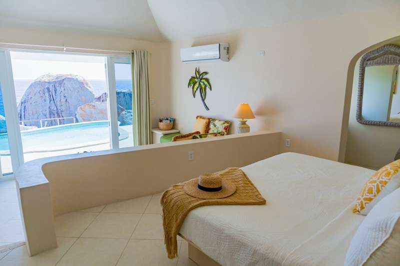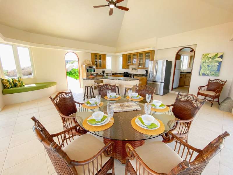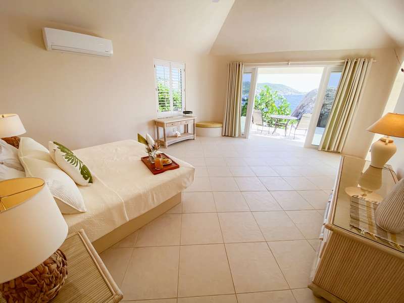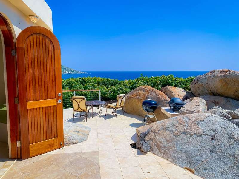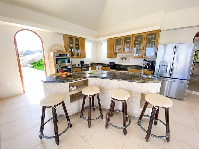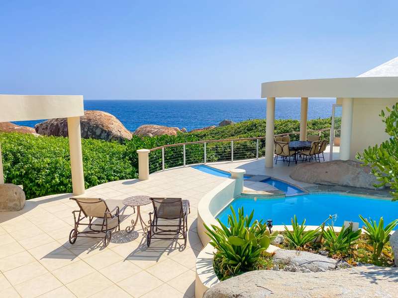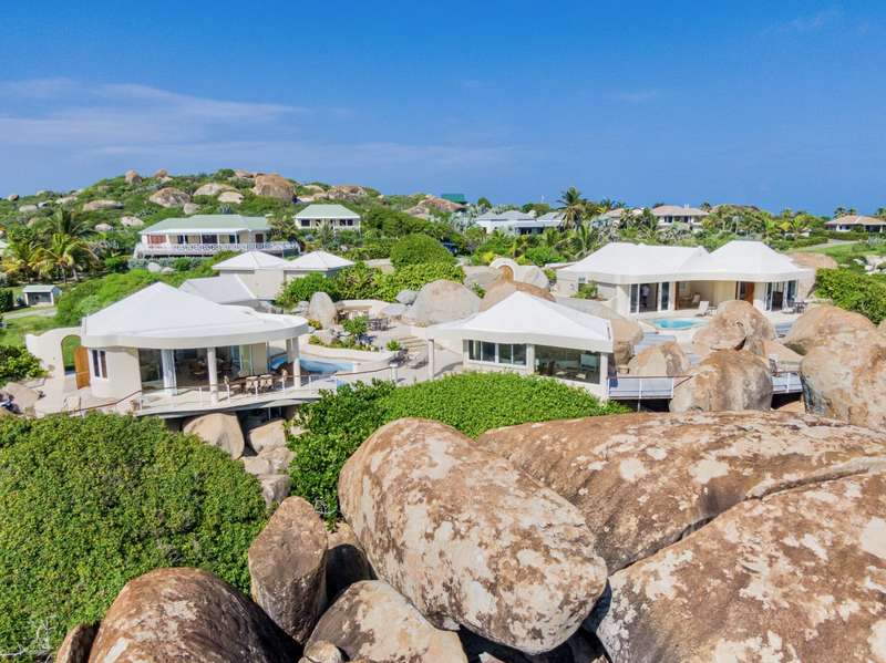 REDUCED FROM 4.5 MILLION Water's Edge was constructed in the heart of one of nature's great wonders. Located among the giant granite boulder fields of Virgin Gorda, this is a contemporary Caribbean fantasy home. It lies close to the World famous “Baths” National Park, but in a secluded, quiet and private estate. Any new owner of this unique home will enjoy sharing both the spectacular natural scenery whilst relaxing in deluxe accommodations, in a one-of-a-kind setting for one of the most extraordinary experiences in the BVI. Water's Edge was designed so that construction of the house would live in harmony with the natural environment and not distract from the location's spectacular beauty. Tucked away in a cavernous area, the exterior garden walls enclose the villa and you enter through Brazilian hardwood doors to discover the treasurers beyond. Once inside, an instant sense of awe is felt as the home is designed around a collection of huge volcanic boulders. The sensation of tranquility is instant as the panoramas of the Caribbean Ocean lure the eyes to embrace the turquoise waters. Water's Edge is uniquely connected with outdoor living as all three of the property's buildings have been constructed to fit amongst the granite rocks. Cream coloured exteriors with white peaked-roofs and orange clay tiles provide soft tones to contrast against the vibrant scenery. Large folding glass doors and picture windows frame the unhindered views while enabling a refreshing breeze to travel throughout the indoor living spaces. The patio and deck afford plenty of space featuring an outside bar area equipped with power points and a spot for an extra fridge. In addition to various hidden spaces for stargazing and sun lounging, when it's time to cool off, the 24ft pool with its unique little river and footbridge are a blessing for a refreshing dip. The home is a blank canvas waiting for the personal touches of its new owners to be implemented into the design, furnishings, and decor. The first building contains the kitchen and dining area, with state-of-the-art cooking facilities, sparkling tortoise shell granite countertops and custom wooden cabinetry. This great room offers an ocean view and is flooded by natural light from the floor length folding glass doors, which open to the outer decks. In addition to the luxury, fully equipped kitchen, a central island in the cooking area comprises bar stools and an additional small sink and station for preparing cocktails. A wine fridge compliments the open space where you can serve and entertain your guests relaxing on a unique built-in stone sofa. An expansive pantry with additional kitchen prep area links the great room to the indoor and outdoor shower, bath and laundry areas which are all accessible for pool use. From the second building, the expansive windows deliver a dramatic view of the ocean. This room was intended as the main indoor living area, and the design possibilities are endless for any new owner to craft the room with the comforts and amenities they desire. Currently this room doubles as another bedroom with access to the pool bath. The third building holds two and a half bedrooms. Both main bedrooms have direct patio access where a plunge pool is situated, while offering seclusion between the boulders and views looking out to sea. Both bedrooms contain king-sized beds, en-suite bathrooms featuring a powder areas for makeup, double sinks, and gorgeous outdoor showers constructed between the boulders. One of the bedrooms is also fitted with a small kitchenette behind double wooden doors and a pass through window, giving the owners a private place for breakfast and other meals if not wanting to use the main kitchen. The eating space is nestled under a covered patio between the bedrooms. The views are spectacular from all areas. This home brings in substantial revenue as a short-term rental. This home is perfect for anyone who enjoys entertaining. Water's Edge Virtual Tour on Virgin Gorda, British Virgin Islands Water's Edge Sun Room Virtual Tour on Virgin Gorda, British Virgin Islands Water's Edge Guest Villa Virtual Tour on Virgin Gorda, British Virgin Islands ;