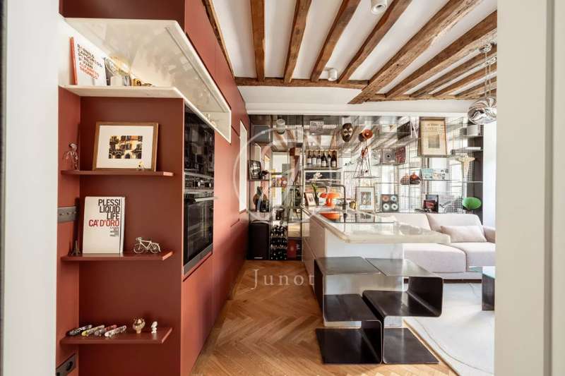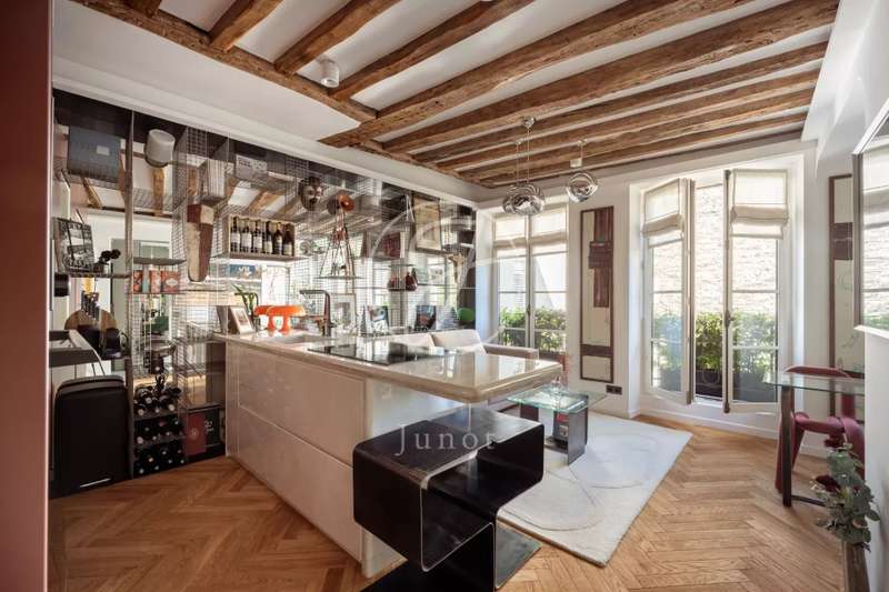In the heart of the 5th arrondissement. In an old building, on the second floor by staircase, this 42.25sqm loi Carrez apartment, entirely renovated by architect, benefits from thermal insulation through the walls and acoustic insulation through the ceiling. It comprises a living room with kitchen and dining room opening onto an open courtyard, a bedroom with plenty of storage space and a shower room with toilet. This exceptional setting offers a privileged lifestyle in the heart of a neighborhood steeped in history.