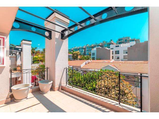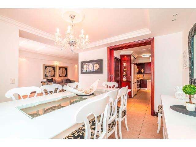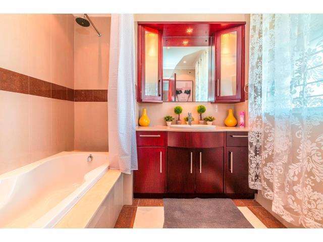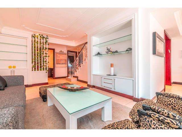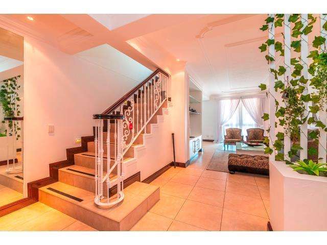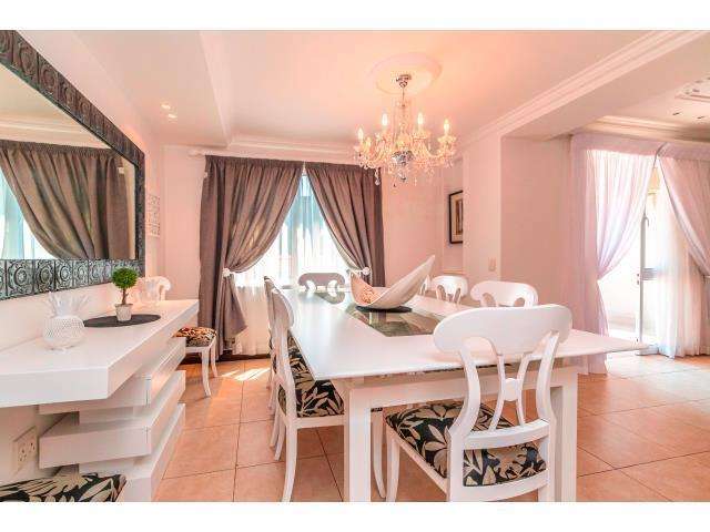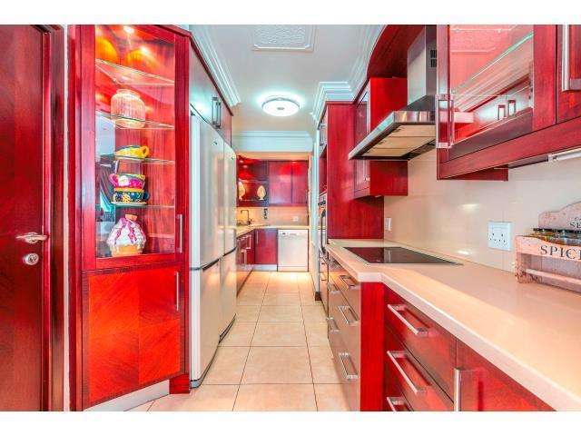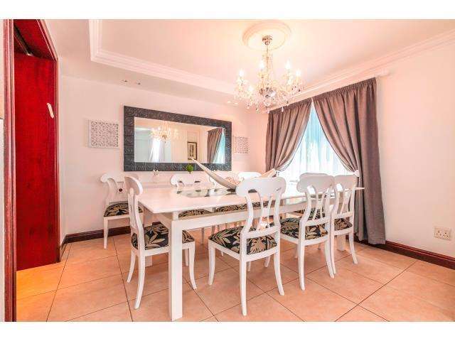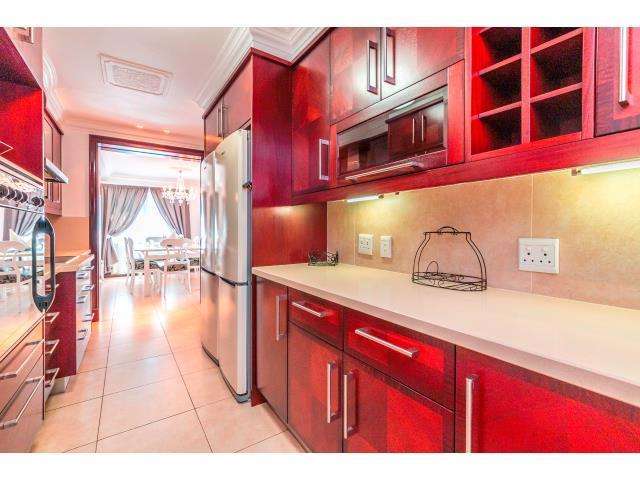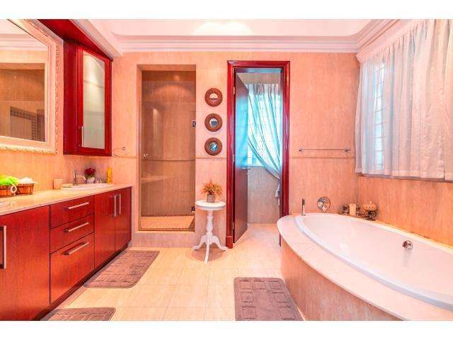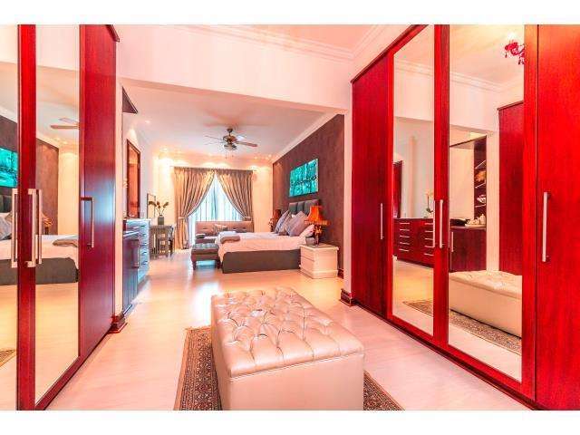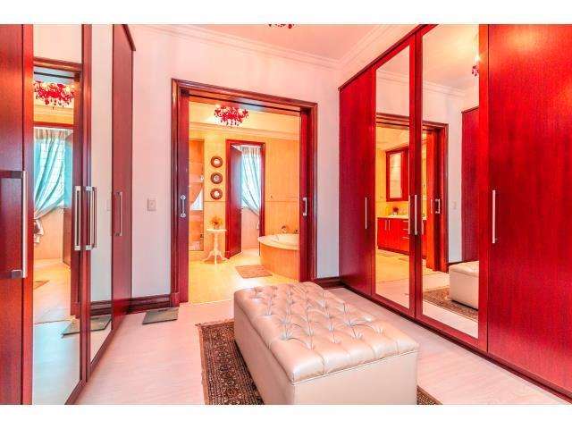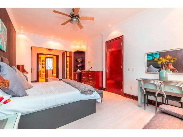 The voluminous main bedroom section with its feature ceilings and fan seamlessly flows to the baronial His and Hers dressing areas with dark Mahogany cabinetry and space that even the most fussy fashion fundi would appreciate.