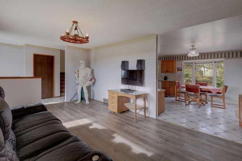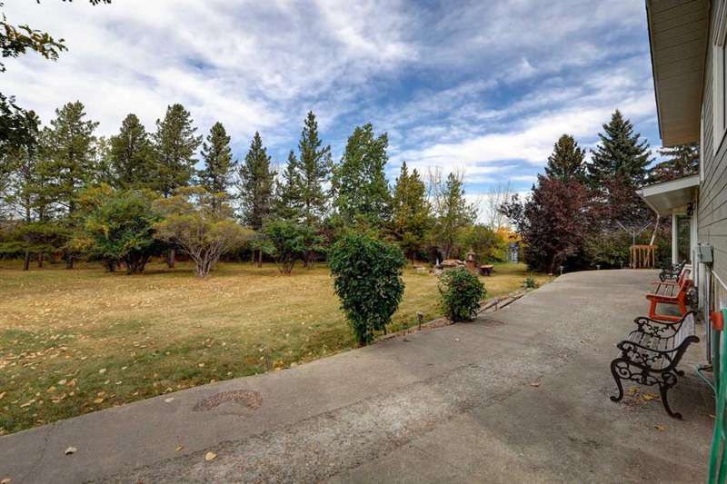OPEN HOUSE SATURDAY NOVEMBER 1ST FROM 1-3PM. Experience the best of country living just 5 minutes from town! Tucked away on 4 private, beautifully treed acres, this charming 4-level split is the perfect retreat for those craving space, privacy, and a touch of nature. Step inside and you’re welcomed by a bright open-concept kitchen and dining area that flows into the living room, where large windows frame peaceful country views. Upstairs you’ll find 3 comfortable bedrooms and 2 full bathrooms, including a relaxing primary suite with its own 4-piece ensuite. The lower level offers cozy family living with a wood-burning stove, a 4th bedroom, laundry, and an additional bathroom. Head down one more level to the basement and you’ll discover a games room (yes—the pool table stays!), bar area, plus plenty of storage and a cold room for all your extras. Recent updates mean peace of mind: new roof (2023), newer composite siding, newer septic tank (approx. 5 years), hot water tank and some new doors/windows (2025). But the real treasure is outside—whether you’re tinkering in the heated triple garage and shop, relaxing by the waterfall pond, or enjoying evenings in the bunkhouse with its own propane stove and power. There’s room for animals with a paddock and shelter, plenty of sheds for storage, RV parking, and rows of fruit trees that add both privacy and charm. This isn’t just a property—it’s a lifestyle. A place where you can breathe, unwind, and enjoy the tranquility of acreage living, all while being just minutes from Airdrie.