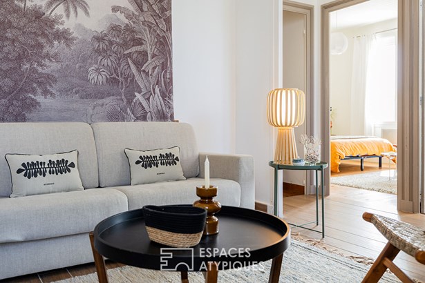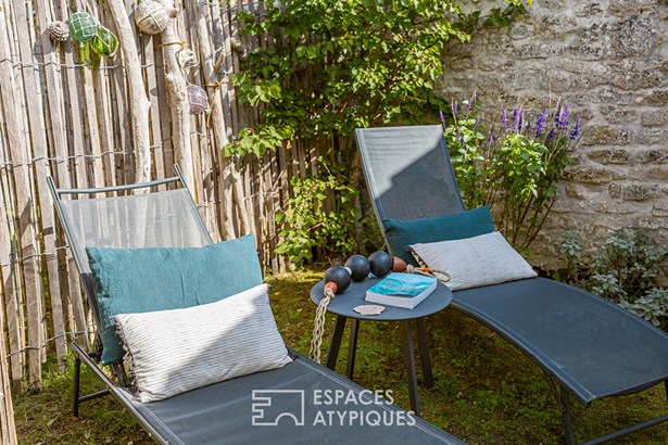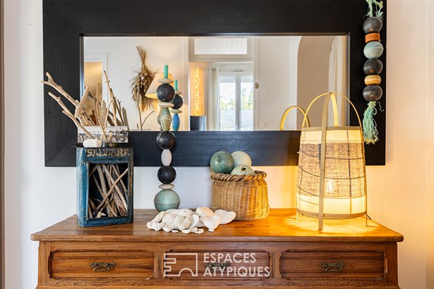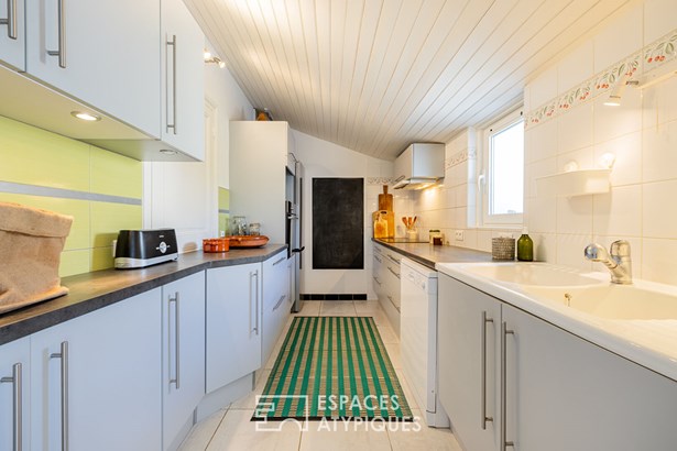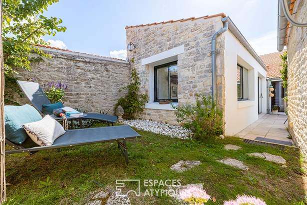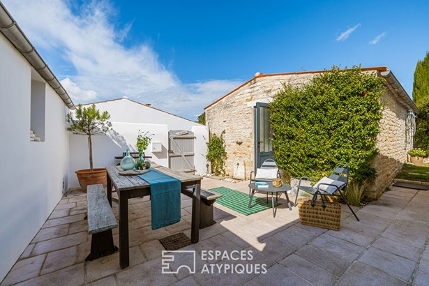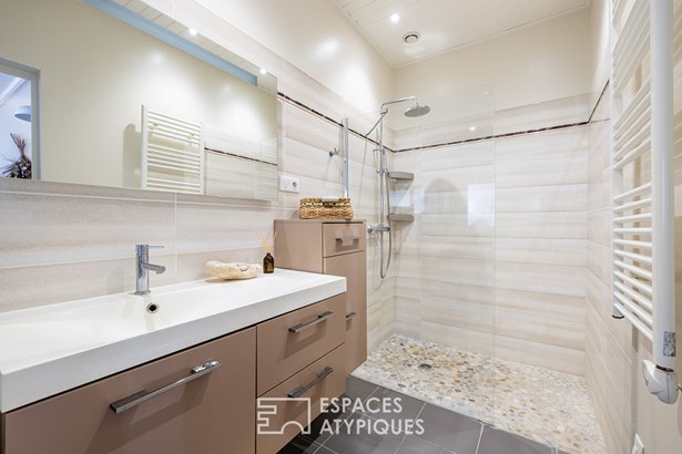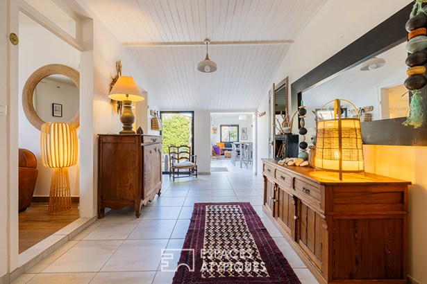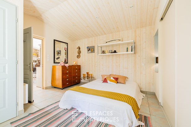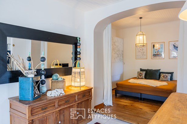 From the entrance, the main house of approximately 110 sqm is organized around an intimate patio, the promise of pleasant summer evenings. This leads to a warm summer lounge with large bay windows, ideal for relaxation and inspiring reading, in a cozy and colorful atmosphere. A large hallway then reveals a fitted and equipped kitchen, facing the patio, perfect for extending the lively exchanges of aperitifs. A second living room, with an open fireplace, becomes the heart of winter evenings, leading to the sleeping areas.