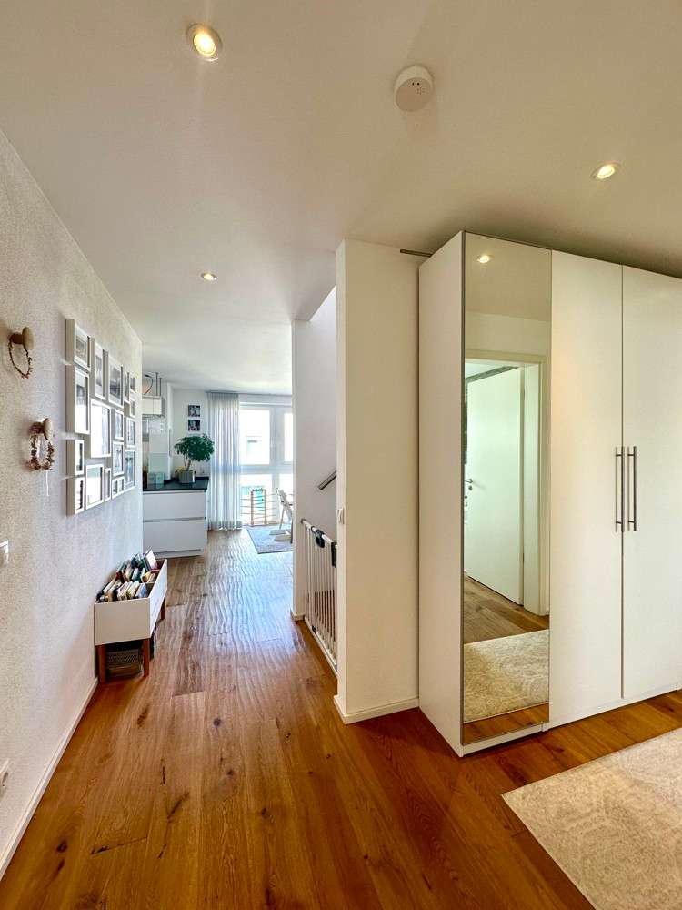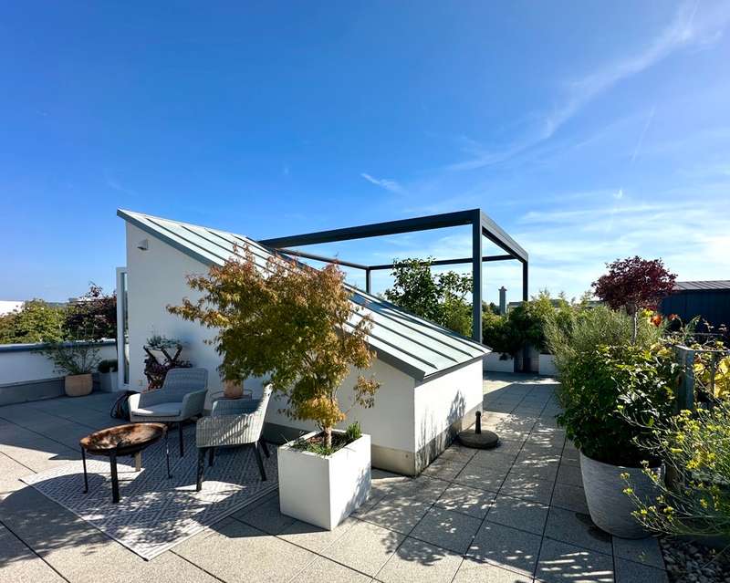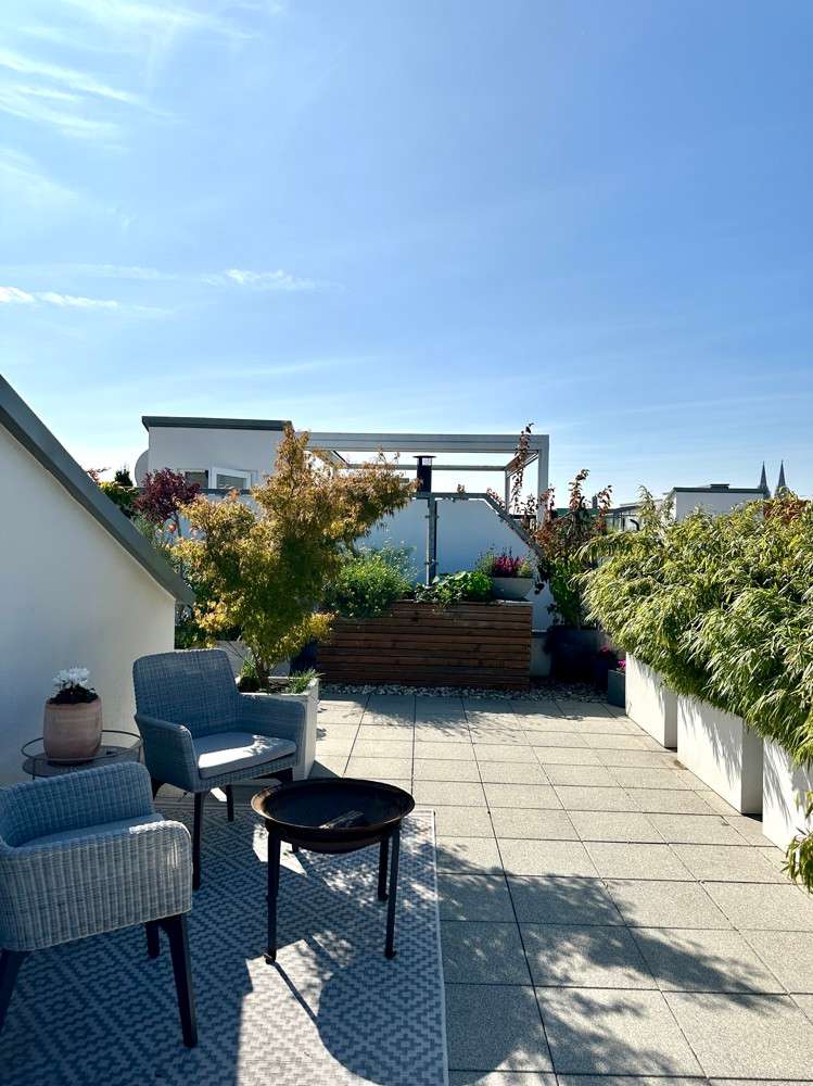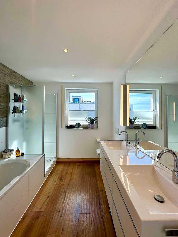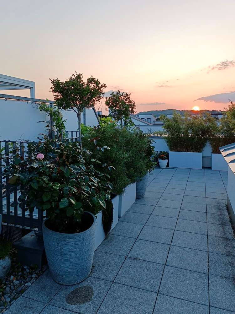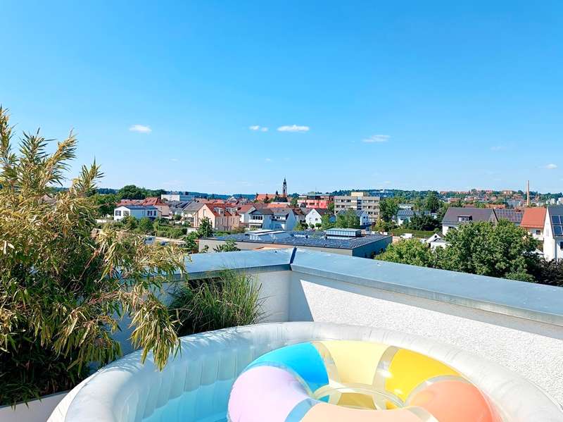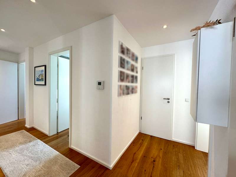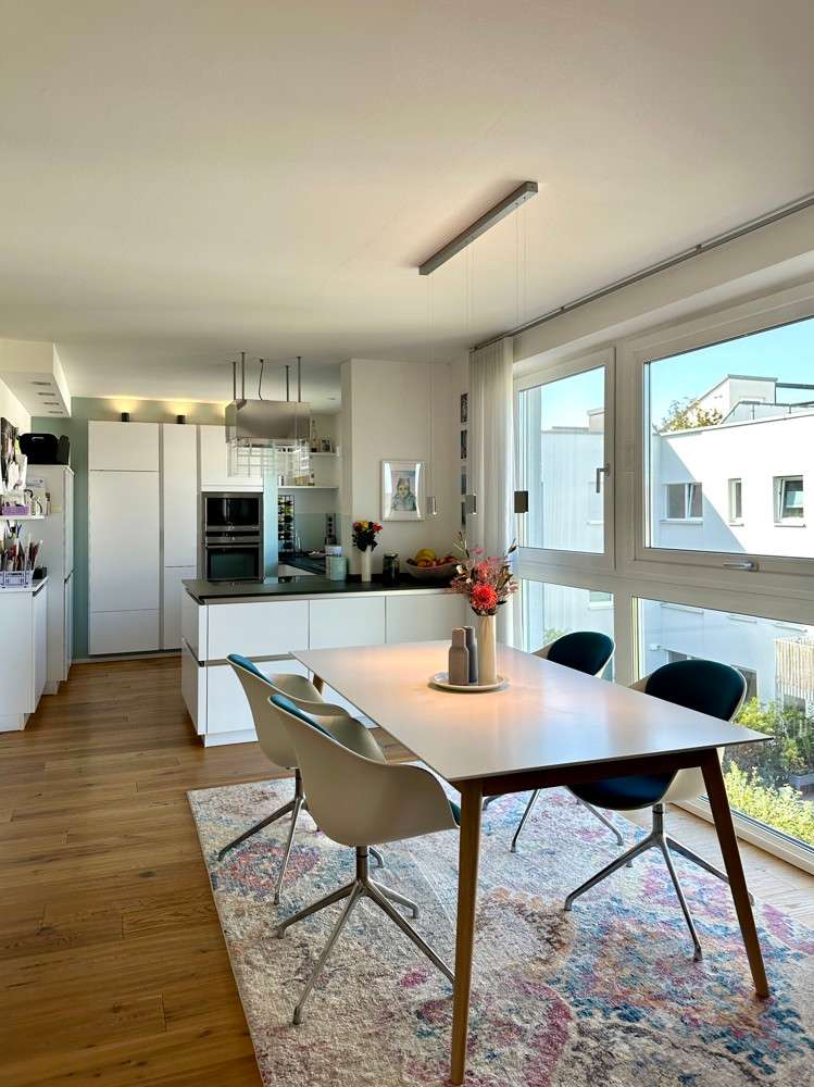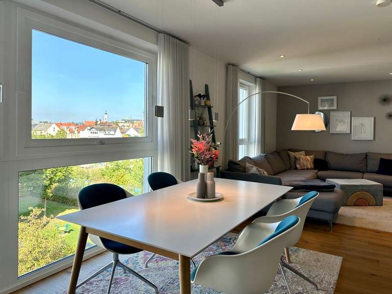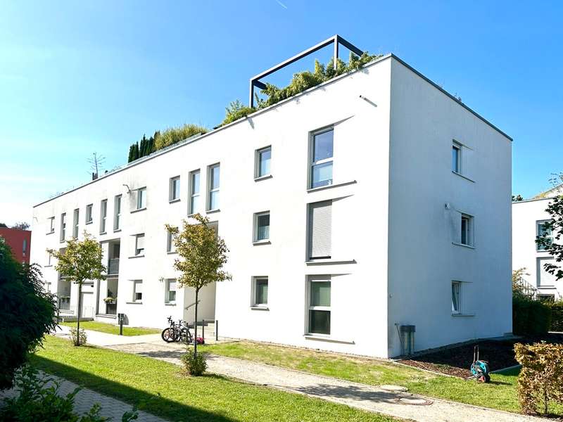 Welcome to your new home, an exceptional 4-room apartment located on the second floor of a first-class, well-maintained residential complex. This property is located in one of the best residential areas in Regensburg, directly on the picturesque Danube floodplains. The proximity to Regensburg's historic old town makes it easy to reach on foot or by bicycle. This apartment impresses with its high-quality fittings and outstanding construction quality with excellent energy values. Inviting solid oak parquet flooring, energy-efficient triple-glazed floor-to-ceiling windows and a spacious hallway area with ample space for a wardrobe greet you as you enter the apartment. The open plan living and dining area is a highlight of this property and features a spacious, first-class fitted kitchen with counter space. The high-quality Nero Assoluto granite worktop exudes elegance, while all the necessary technical appliances from renowned brands are already integrated, including an induction hob. The spacious dining area offers plenty of room for the whole family and provides a wonderful view of the surrounding area through floor-to-ceiling windows. In the spacious living room, you will find enough room for a comfortable sofa and living area. The integrated ceiling downlighting creates a pleasant atmosphere. Another hallway leads you into the spacious bedroom, which has room for a large bed and a closet. The guest WC is a practical addition. The bathroom pampers you with luxurious details, including a large-format, timeless tiled backsplash, a double washbasin with vanity units and high-quality bathroom fittings from the renowned company Heibad and dimmable ceiling spotlights. A spacious bathtub invites you to relax after a long day at work, while the floor-to-ceiling shower offers additional comfort. The children's room is generously proportioned and offers a pleasant daylight atmosphere thanks to floor-to-ceiling windows. The study can also be used flexibly as a guest room or dressing room. The absolute highlight of this property is undoubtedly the spacious roof terrace with 71 square meters of space, which extends above the apartment. You can reach this oasis of relaxation via an elegant staircase with elegant wooden flooring and dimmable ceiling spotlights, as well as side staircase lighting. From here, you can enjoy a breathtaking panoramic view over the whole of Regensburg and the surrounding area. The roof terrace already has a beautiful stock of plants in numerous plant troughs. A high-quality, electric aluminum shading system provides horizontal and vertical shading with an awning. Here you will find plenty of space for a children's play area, a dining area with a barbecue and even the option of installing a large hot tub - perfect for enjoying the picturesque sunsets in the evening in a pleasant atmosphere. This apartment is an absolute highlight on the Regensburg real estate market. It not only offers an upscale living ambience, but also a unique roof terrace with spectacular views. See this exclusive dream home for yourself and arrange a viewing appointment. You should not miss this opportunity! This exquisite property also includes a large cellar compartment (approx. 13 sqm) and a private parking space for your car with electric hook-up (EUR 25,000). There is also a small utility room for washing machine and dryer under the stairs. There are also plenty of parking spaces in this traffic-calmed zone at the end of the residential street.