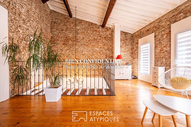 The exposed beams and overlooking mezzanine enhance the sense of space and brightness, offering a spectacular living area where authenticity meets conviviality.