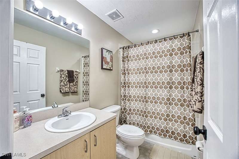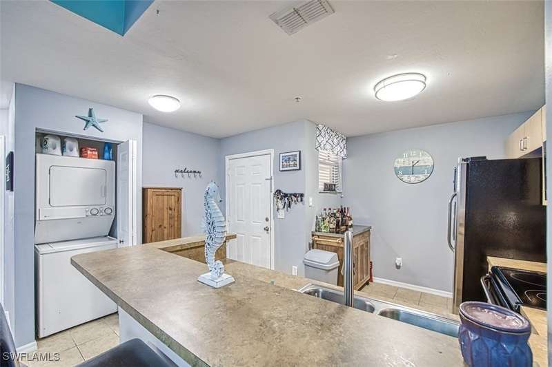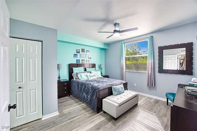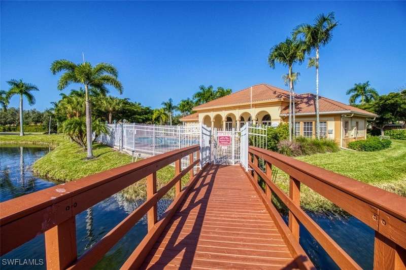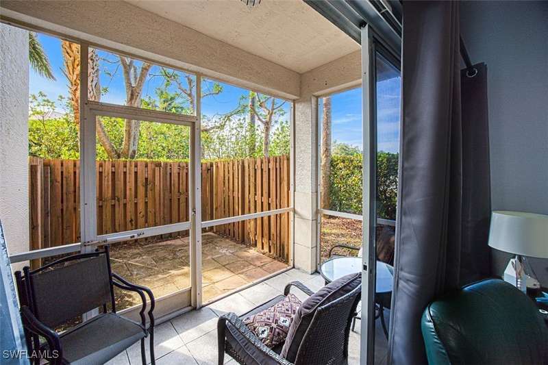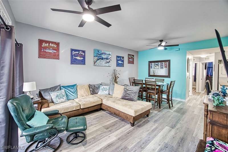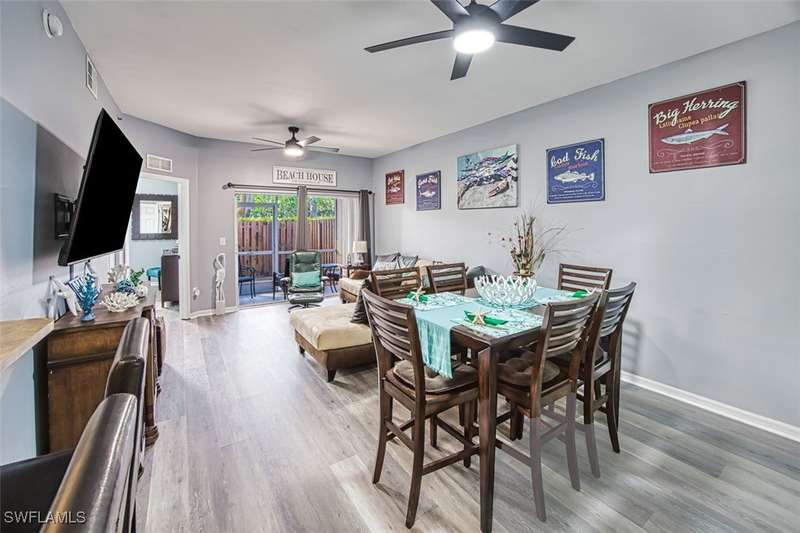 Welcome home to Bellamar with its lakeside pool and manicured garden reminds one of the near beach Southwest Florida paradise. Come home to unit #114, a Southwestern exposure, first floor end unit ideally located with no neighbors to the back a right side. This select floor plan is not widely available anywhere with its first floor vaulted ceilings and rare covered back lanai with fenced & gated yard under the foliage of mature and cypress trees. On approach, one notices no steps to the front door, yet this build sits higher on grade. Enter to an open kitchen and living room concept designed with a warm beach vibe. This turnkey condominium completes the feel of living in a tropical paradise almost as if arriving home from the daily grind to your near beach vacation rental. All you need to do is bring yourself to enjoy this fully furnished home. Six modern fans with one in each room and two in the living room makes for a cool respite from the sun and a large double pane sliding glass door draws abundant afternoon light and brings the outdoors in by opening to a furnished and screened in back patio overlooking the privacy fenced yard that is all your own. The master bedroom located off of the living room & boasts a large footprint, en-suite bathroom with a wide well lit vanity and tiled shower over tub as well as a generous walk in closet. Eat in Kitchen with breakfast bar and stainless appliance suite with glass top range, microwave range hood, dishwasher and side by side refrigerator with water & ice service in the door. Stackable washer dryer tucked away conveniently in the foyer closet. To the front just past the hall bathroom with shower over tub are two adjacent bedrooms with tall ceilings, generous closet space and large double pane windows with blinds. Luxury vinyl plank flooring makes for a warm wood floor look with easy clean up. Experience unit #114 at Bellamar and make it for your very own today. New roof within the last three years and no future assessments known.