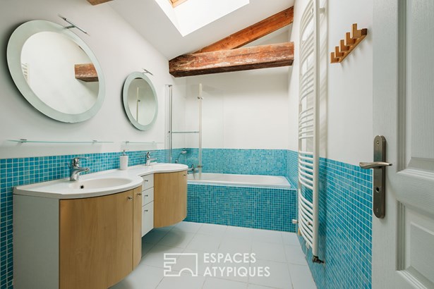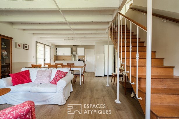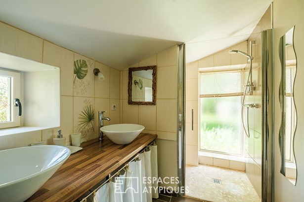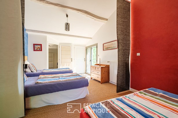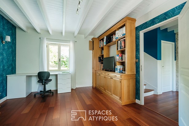 It is organized on the ground floor around a vast living room of more than approximately 45 m2, a large office that can become a bedroom on one level, and a kitchen. The upper floor offers a master suite with a dressing room and bathroom, as well as two other generous bedrooms with their own bathrooms.
