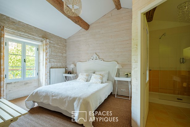 Each room exudes the warmth of a rural home designed for modern comfort, without betraying the soul of the place. In addition, there are two gites, designed with a high-end hospitality in mind. The first, directly attached to the house, offers a large living room of approximately 40 sqm and two bedrooms, each with its own private bathroom. Here too, materials such as wood, stone, and sisal bring the essential charm to a cozy atmosphere. The second, more intimate with its surface area of approximately 30 sqm, includes a bedroom, living room, and an elegant bathroom with natural touches. Outside, a swimming pool invites relaxation, accompanied by a vast awning extended by large open barns, highlighting a wooden frame and stone pillars.