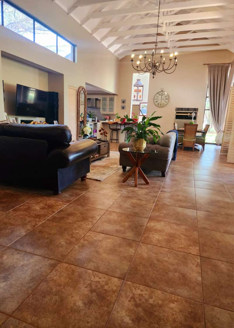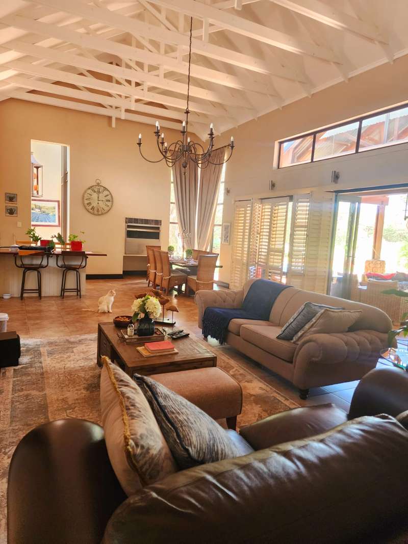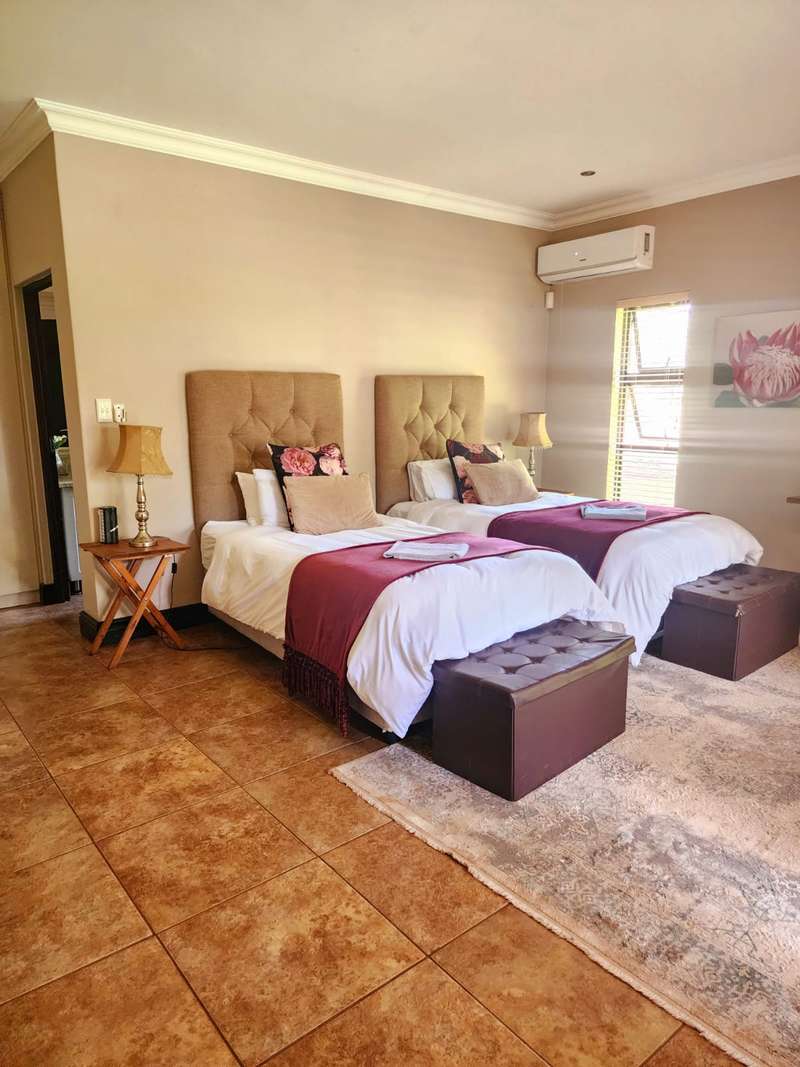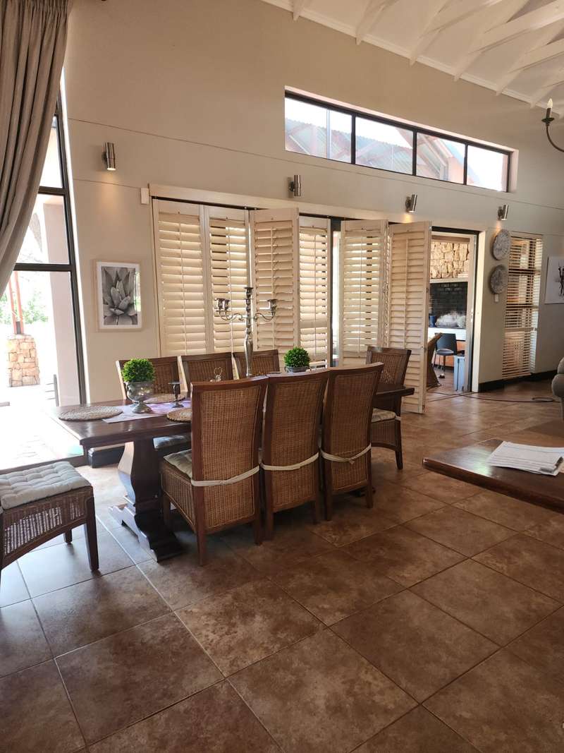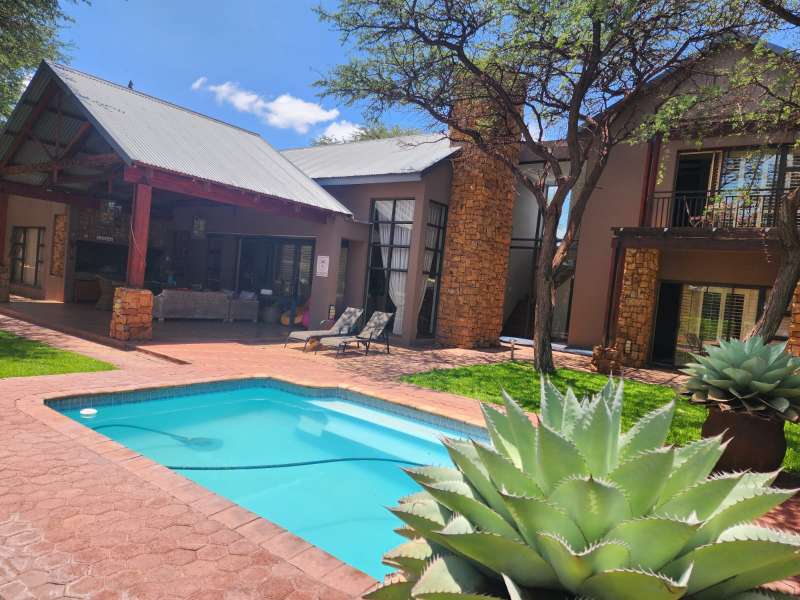 If money could buy you happiness and peace, this property resembles it. Kalahari sunsets, Camel-thorn trees and South Africa's antelope species will surround you and bring harmony to your doorstep. This property is situated in not only one of SA's most beautiful golf estates but also in a high demand area making it a profitable investment. One entering you will experience a warm at home feeling, but with its striking luxury aspects you will know this is not just an ordinary home. An open plan, modern high ceilings, modern kitchen and built i wine cabinets sets it above the rest. It has a gas hob, solar power, 4 on-suite bedrooms and a separate toilet for guests and a study. You can either entertain your guests inside out outside wit a barbeque while swimming in a sky blue swimming pool . It is an investment, and can easily run as a guesthouse wit a separate flat also apart of this multi opportunity peace of heaven. While some can only dream, you can live it. Just move in, its already furnished!