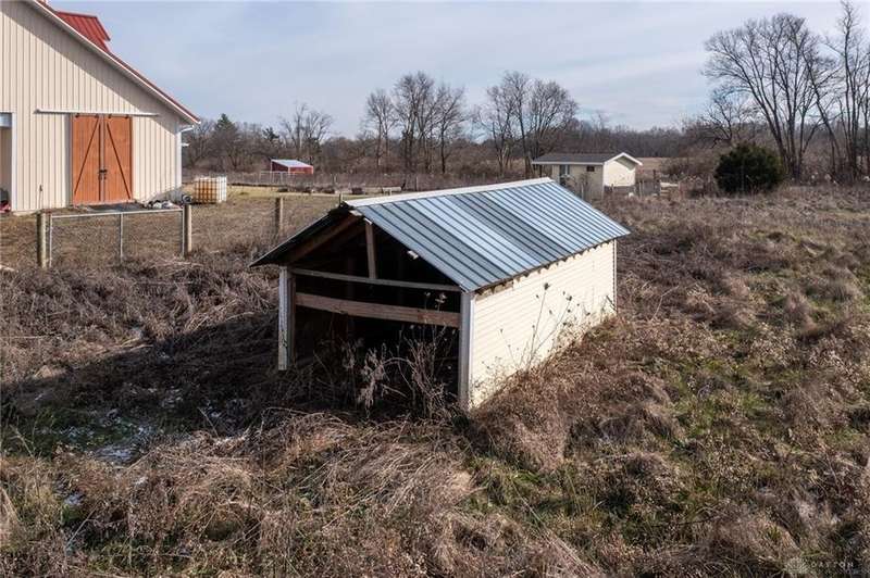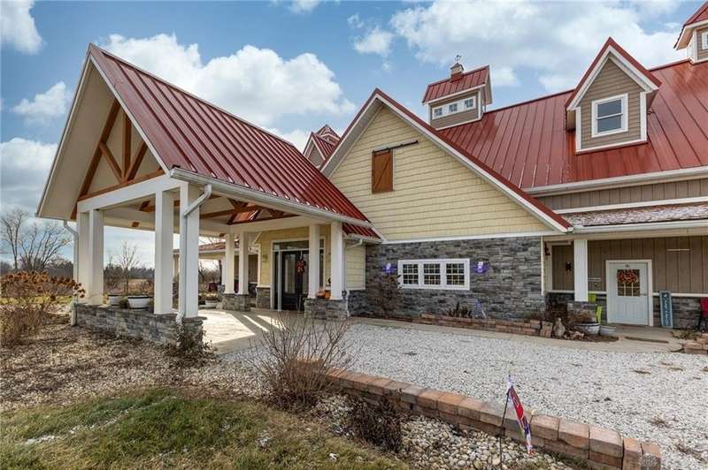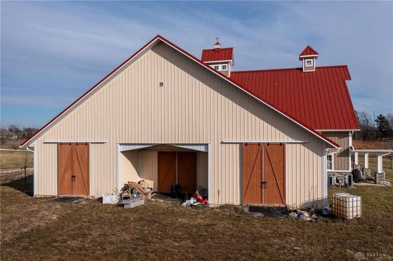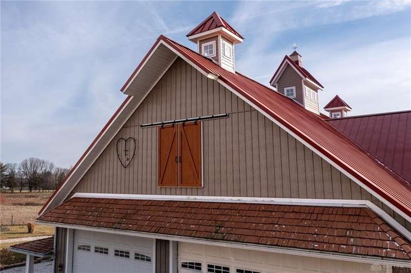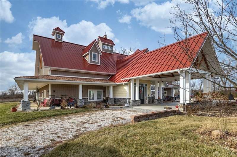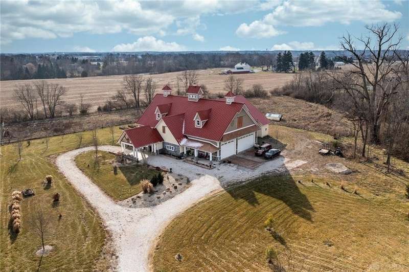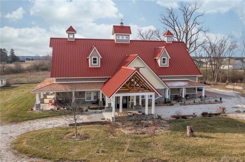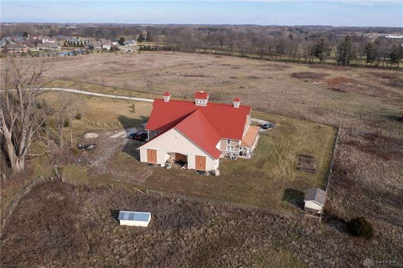 This unique custom-built home appears on the outside with its red standing seam roof as a barn but is a beautiful home along with an attached barn for permitted agricultural animals situated on 10.01 acres with R1-A zoning in Spring Creek Township just on the North side of Piqua. The Barndomium style home has an attached horse/animal barn measuring 51'x 28 and two cold storage areas measuring 21' x 11' which can be a tack room or simply storage. Now the home: the beautiful kitchen is open to the great room with a vaulted ceiling and heated wood flooring. The kitchen has cherry cabinets, granite counter tops, double oven, gas countertop stove, trash compactor and a unique hammered copper sink. The first-floor main bedroom with its large bathroom, walk in shower, double sink and soaking tub, and walk in closet plus a second bedroom with a full bathroom is on the first floor. On the second floor there are 3 partially unfinished dry-walled bedrooms and a finished full bathroom along with a balcony and office (21' x 10') overlooking the great room area. The oversized two side load garage doors measure 18'x14' and 24'x14' that can handle a motor coach and anything smaller. The house is heated by a gas fired boiler with water lines throughout the floors along with electric heat pumps for auxiliary heat and summer air conditioning. There is a lot to see and to enjoy as your country home and farm.