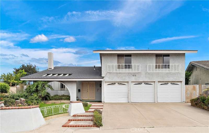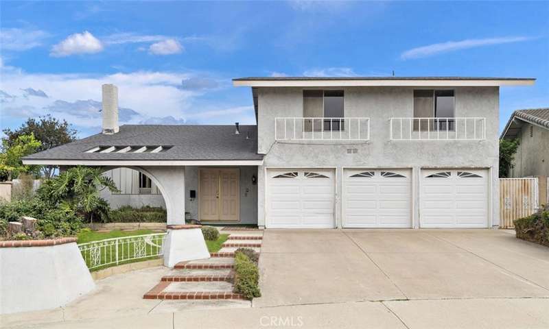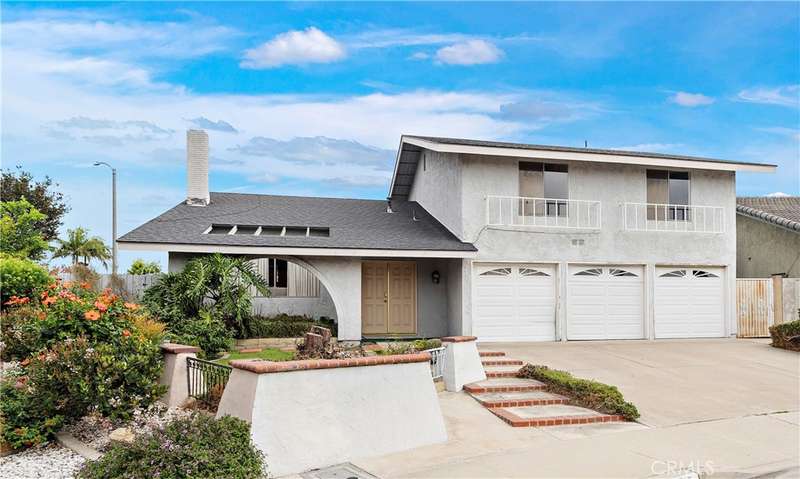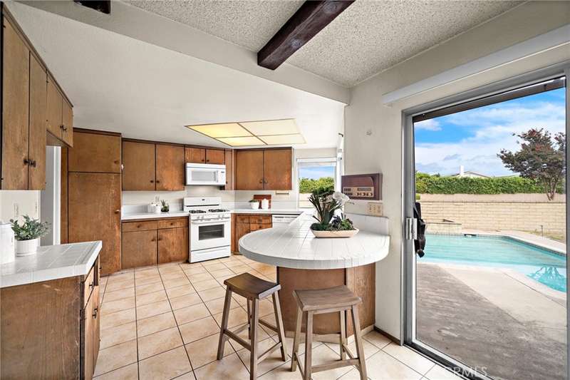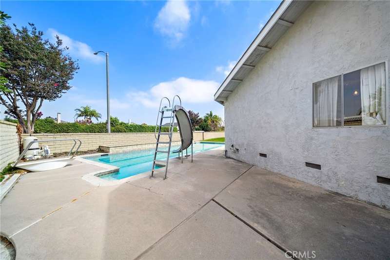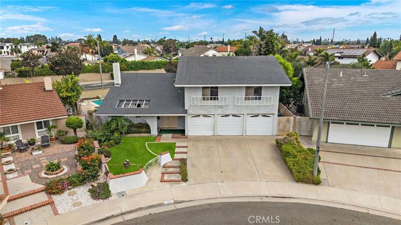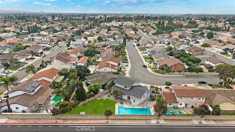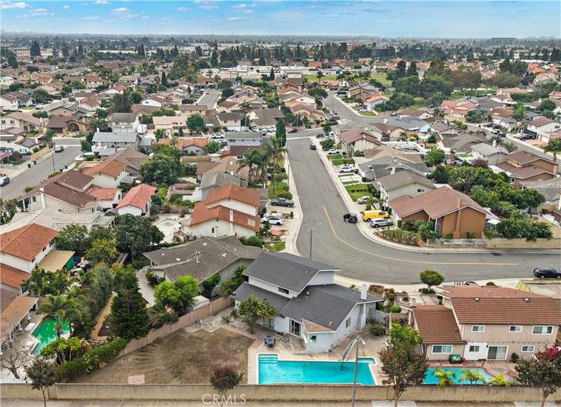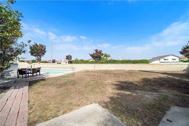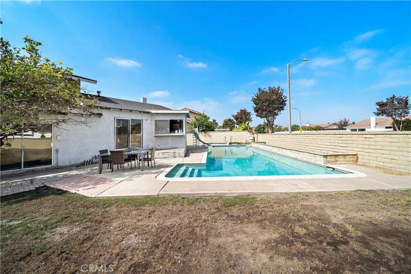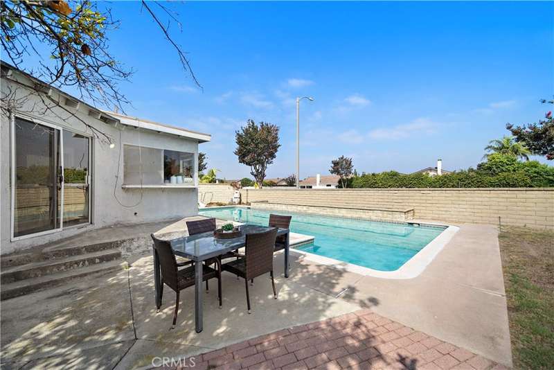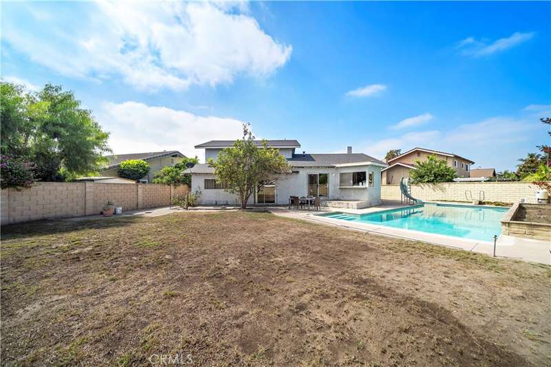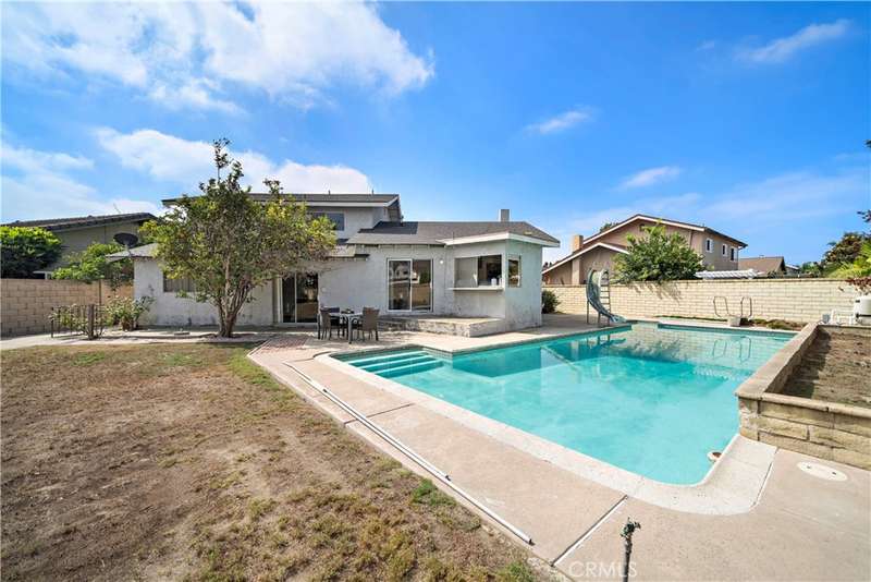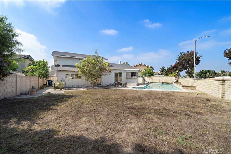 This 5 Bedroom, 3 Bath La Linda Pool Home presents a rare and exciting fixer opportunity to be sold in as is condition, offering 2,303 square feet of living space, a desirable downstairs primary suite, a 3-car garage, and an expansive 10,578 square foot lot with endless potential for an ADU, expansion, or resort-style backyard. Ideally located within walking distance to Mile Square Park and close to shopping, dining, golf, recreation, Little Saigon, and just a short drive to the beach, this property is all about possibilities. Step through the double entry doors to a tiled foyer that leads to a spacious step-up formal living room with fireplace and adjacent formal dining area. The sunlit kitchen features tile counters, a gas range, microwave, dishwasher, breakfast bar, and wraparound windows overlooking the pool, and it opens to a cozy family room with sliding doors to the enormous backyard with pool, concrete deck, rose garden, fruit tree, and large lawn area perfect for gatherings and entertaining. The extra-large downstairs primary suite boasts vaulted ceiling, retreat area, and walk-in closet, while upstairs offers 4 additional bedrooms, including two that are oversized, plus a full guest bath with tub/shower combo. Direct access leads to the 3-car garage, currently partially enclosed for laundry/hobby use but easily restored to full capacity. Original 1971 condition, this home needs paint, flooring, and cosmetic updates, but with great bones, an unbeatable floorplan, and a lot size rarely available in this neighborhood, it's a diamond waiting to be polished.