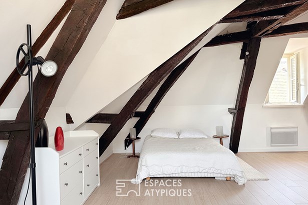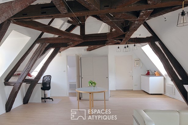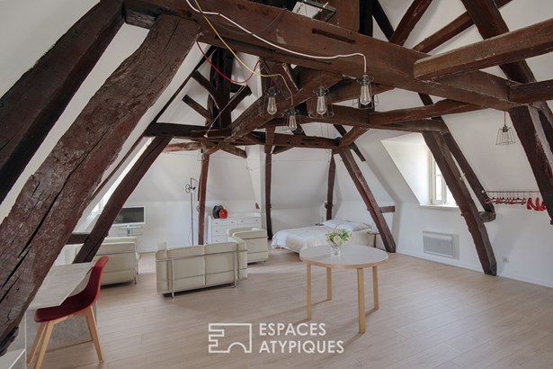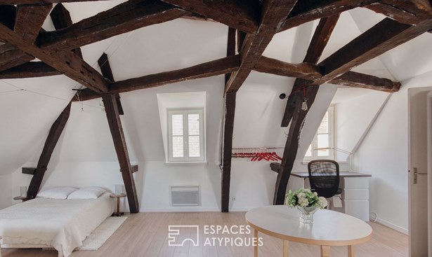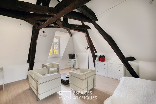 Located on the top floor, accessible by climbing a period staircase, the apartment offers a unique atmosphere, bathed in light thanks to its East-West crossing, and enhanced by a spectacular solid wood frame, a true work of art in itself.