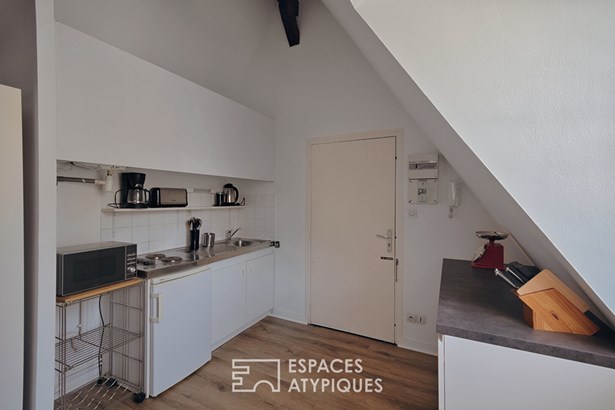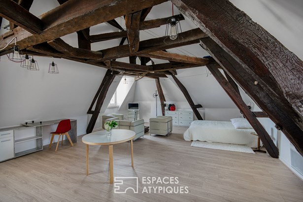 The vast main room is organized into several living spaces, cleverly delineated without partitions: a cozy living room under the exposed beams, a sleeping area full of softness, an inspiring office area, and a discreetly integrated fitted kitchen under the slopes, functional and bright. The separate shower room perfectly completes the ensemble, combining simplicity and practicality.