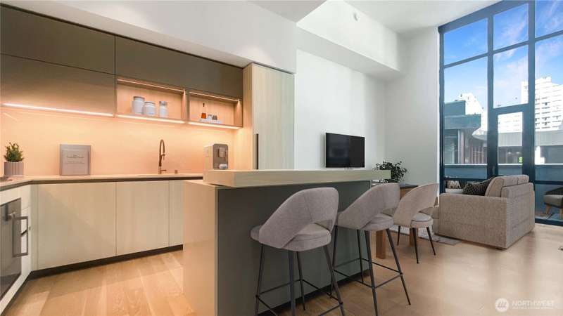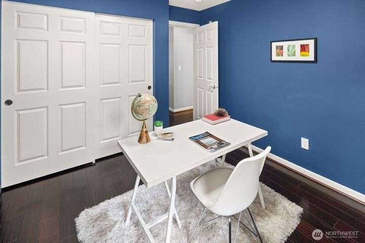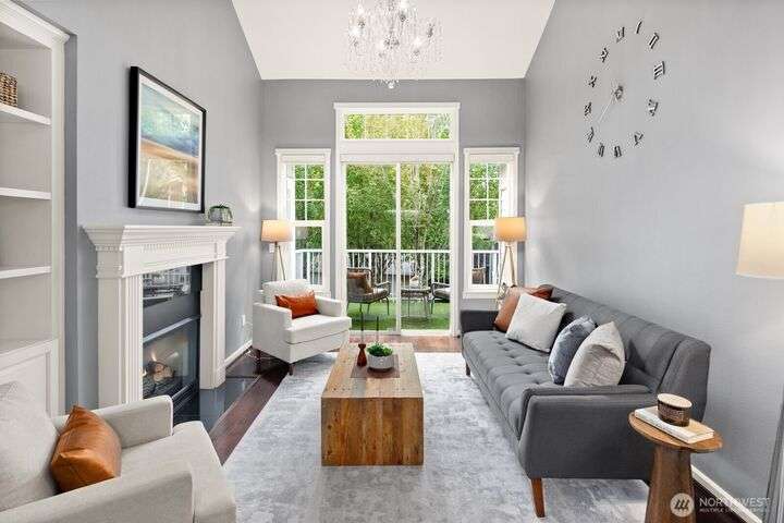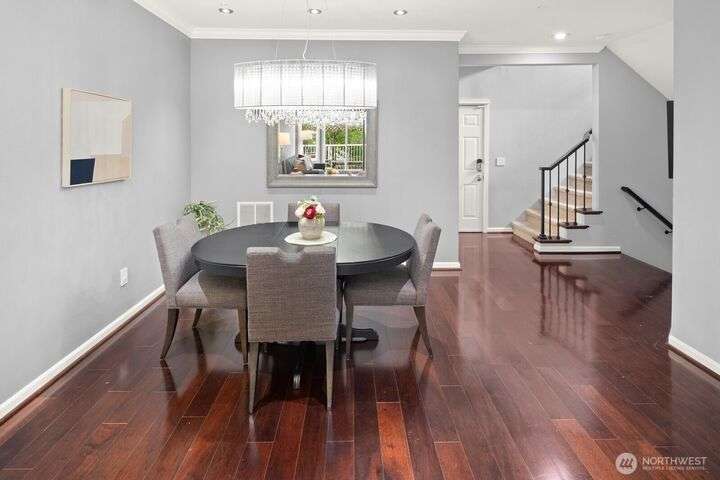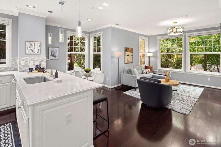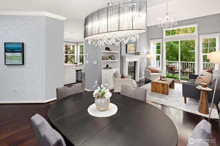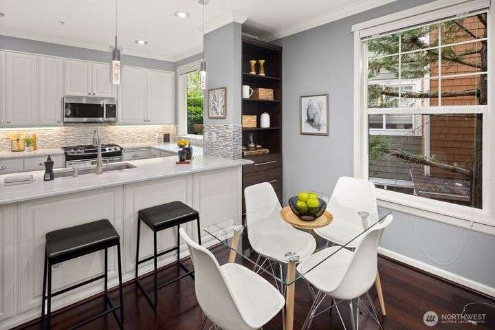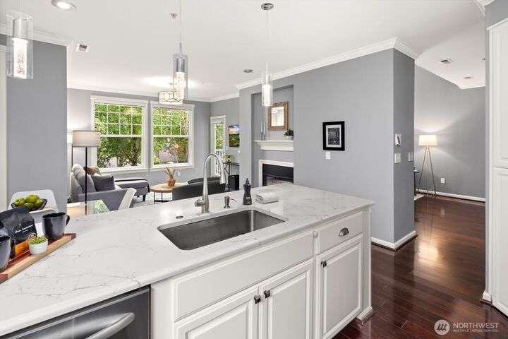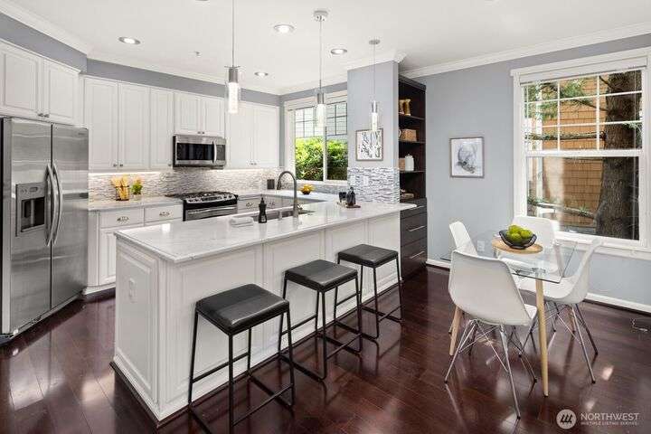 All the perks of a single-family house with the convenience of condo living! This prime end-unit townhome shines w/ luxury finishes at every turn: cathedral ceilings, sparkling chandeliers, rich engineered hardwoods, & exquisite mill work (including custom built-ins!). Host friends in elegant living & dining areas that open to a balcony overlooking the park-like community lawn. Just around the corner, a casual great room forms the heart of the home with a family room, 2-sided gas fireplace, & dining nook flowing around the beautiful quartz/stainless kitchen. All 3 bedrooms + laundry are upstairs including large owner’s suite with walk-in closet & 5-peice bath. Incredible location minutes to top rated schools, DT Bellevue & Spring District!