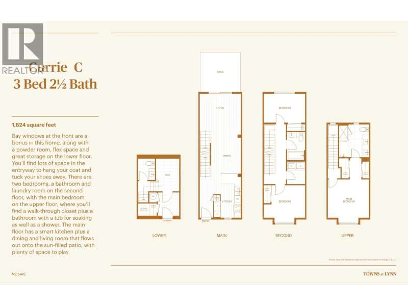 Welcome to Towns at Lynn by Mosaic, set beside Kirkstone Park and a short walk to Lynn Valley Centre, schools, and coffee. This C Plan townhome offers 1,624 sq. ft., 3 bedrooms, and 2.5 baths across four well-planned levels, quietly set at the back of the development. A bright main level features a smart kitchen with dining and living that flow to a sunny patio. The lower level adds a flex room, powder room, excellent storage, and a welcoming entry. Upstairs you´ll find two bedrooms, a full bath, and laundry, with the top floor reserved for a private main retreat with a walk-through closet and an ensuite with separate tub and shower; bay windows add extra light and charm. Ownership includes access to The Lynn Club with an indoor pool, fitness centre, lounge, and outdoor patio. *assignment* (id:58403)