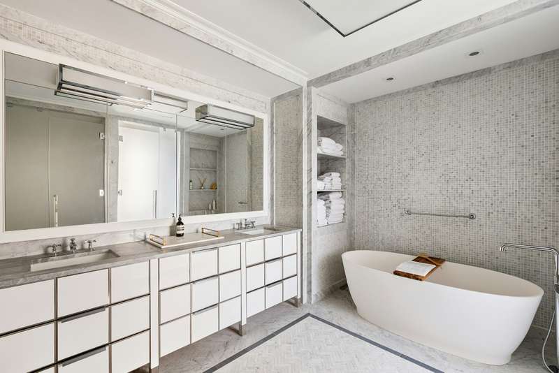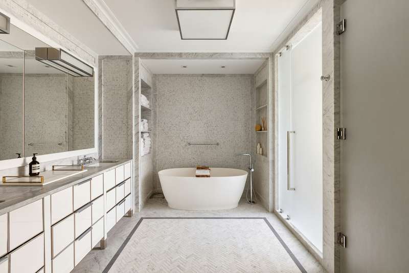 While each bedroom is complete with an en suite bathroom, huge closets, oversized windows and ample privacy, the Primary Bedroom Suite enjoys an exquisite fireplace mantle, huge walk-in-closet and an additional windowed "bonus room". ; The bonus room can serve as a home office, nursery, dressing room, or even a second walk-in closet! ; The spa-like bathroom has generous proportions with an oversized soaking tub, double sinks and vanities, a huge windowed shower stall, ; separate toilet booth, and Italianate mosaic marble tile surfaces. Finished in a soothing color palate of light blues, greys, and white, the primary bathroom offers a serene oasis.